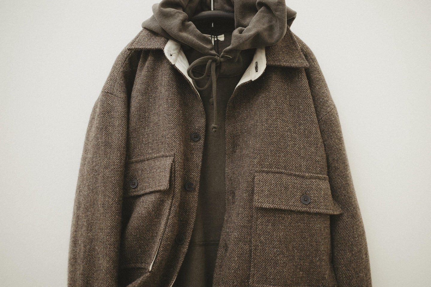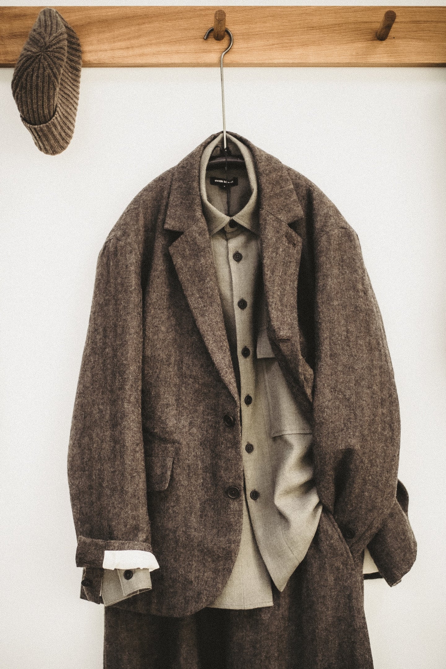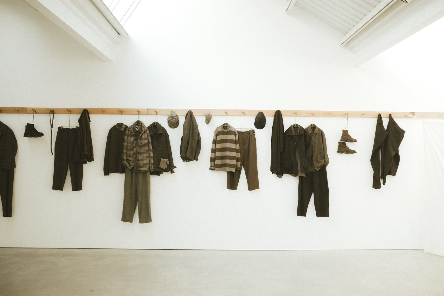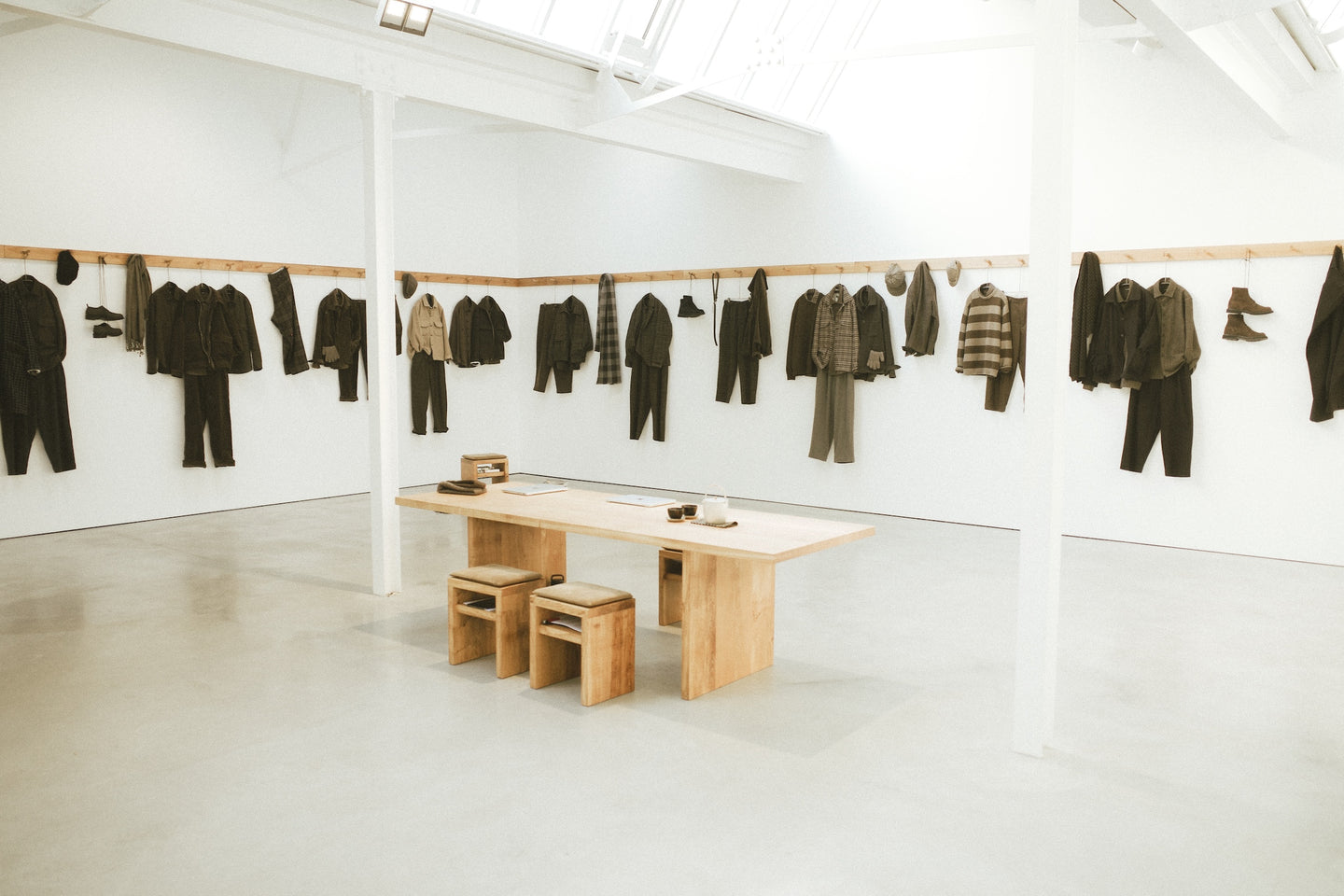 We presented a site-specific capsule collection of garments sewn in London with materials exclusively sourced from within England - horn buttons from the Midlands, woolen cloth from Fox Brothers in Wellington, Somerset (some of which had been woven from British wool) and lined with cotton cloth woven in West Yorkshire. The furniture similarly was made just a few hours from London with naturally felled, sustainably salvaged English Oak. Continuing the narrative from exhibition one, this was the first time the ideology of regional product had been transported and applied to another country entirely.