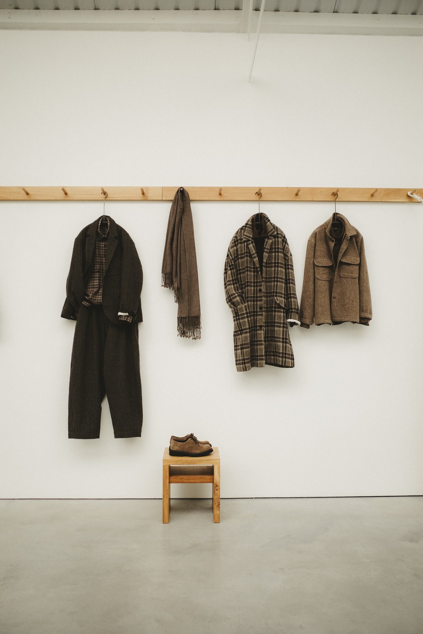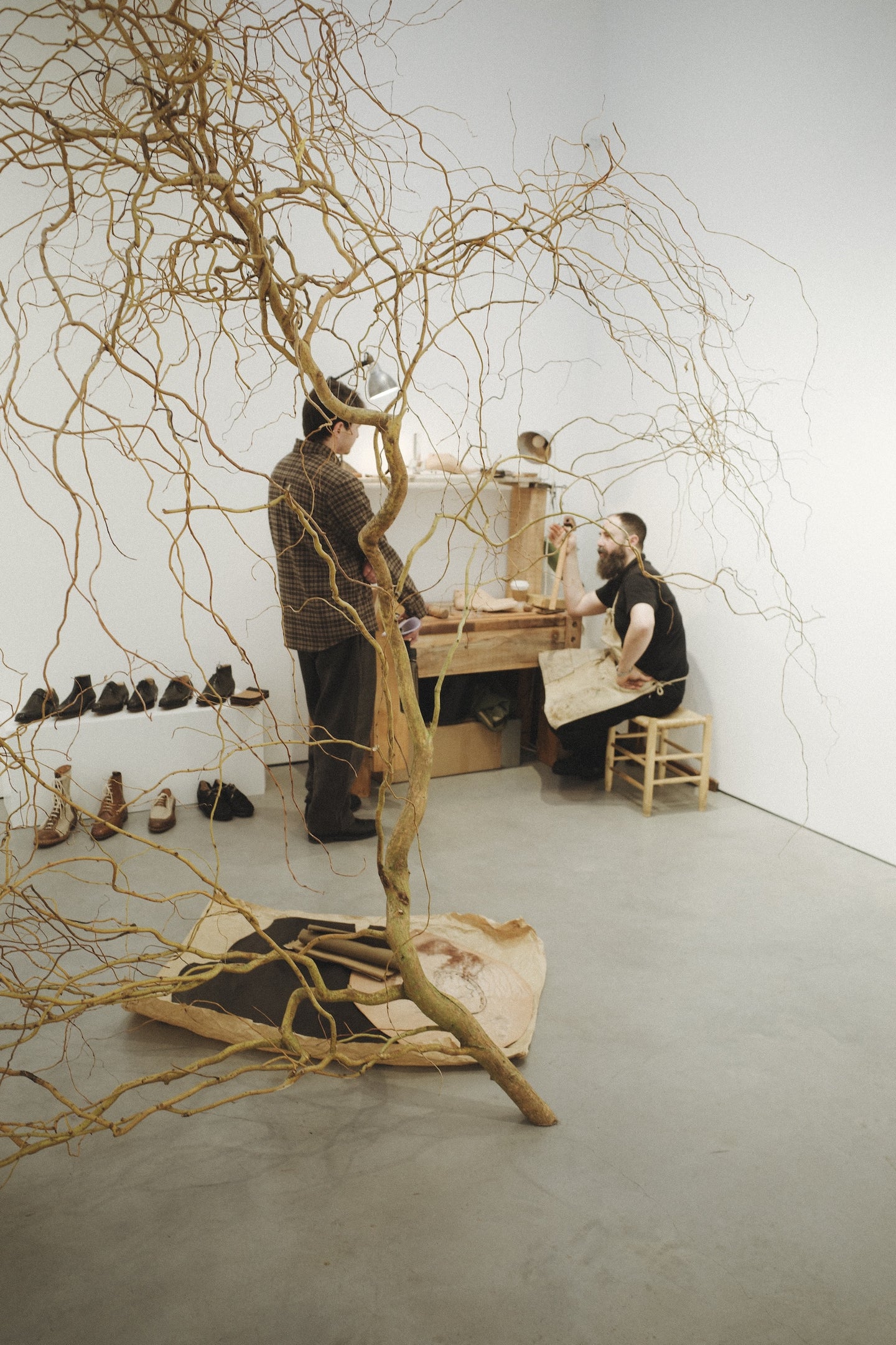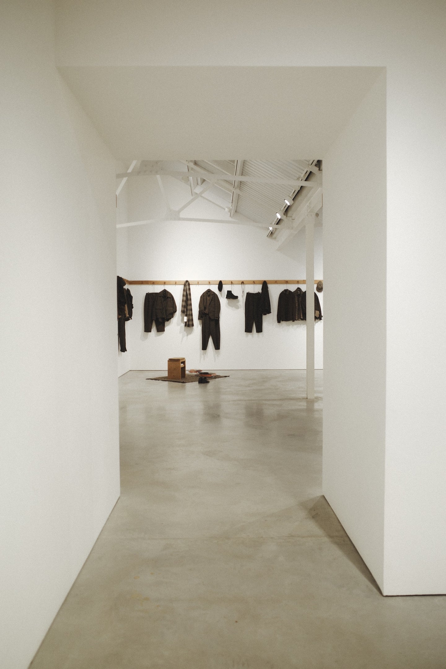 For ten days in December, exhibition three took place at Stuart Shave Modern Art gallery in London. The exhibition brought together a collection of garments and furniture entirely made in England, a collaboration with London-based bespoke shoemaker Sebastian Tarek, and an immersive mid-century HiFi lecture by Peter Kapos of Das Programm/System Studios.