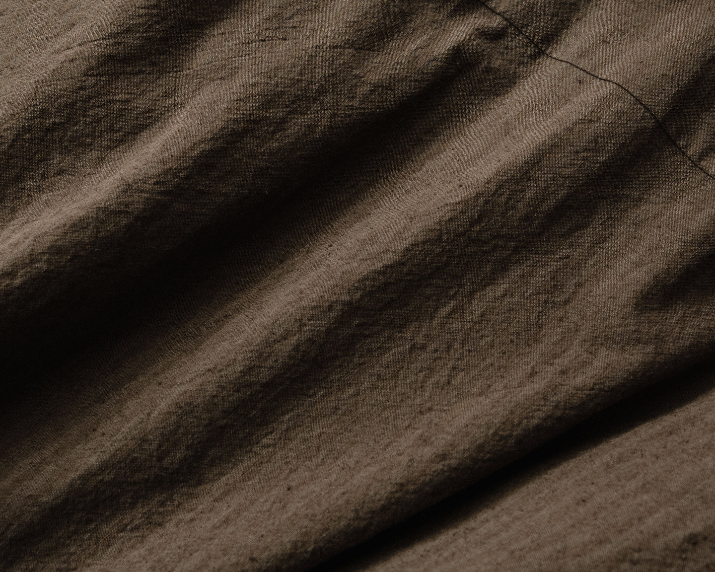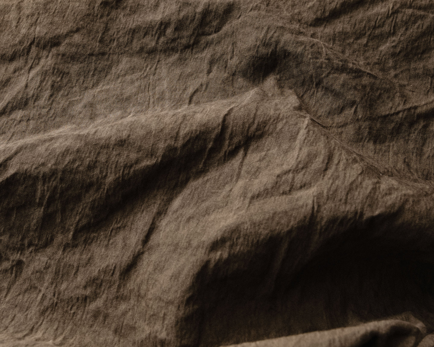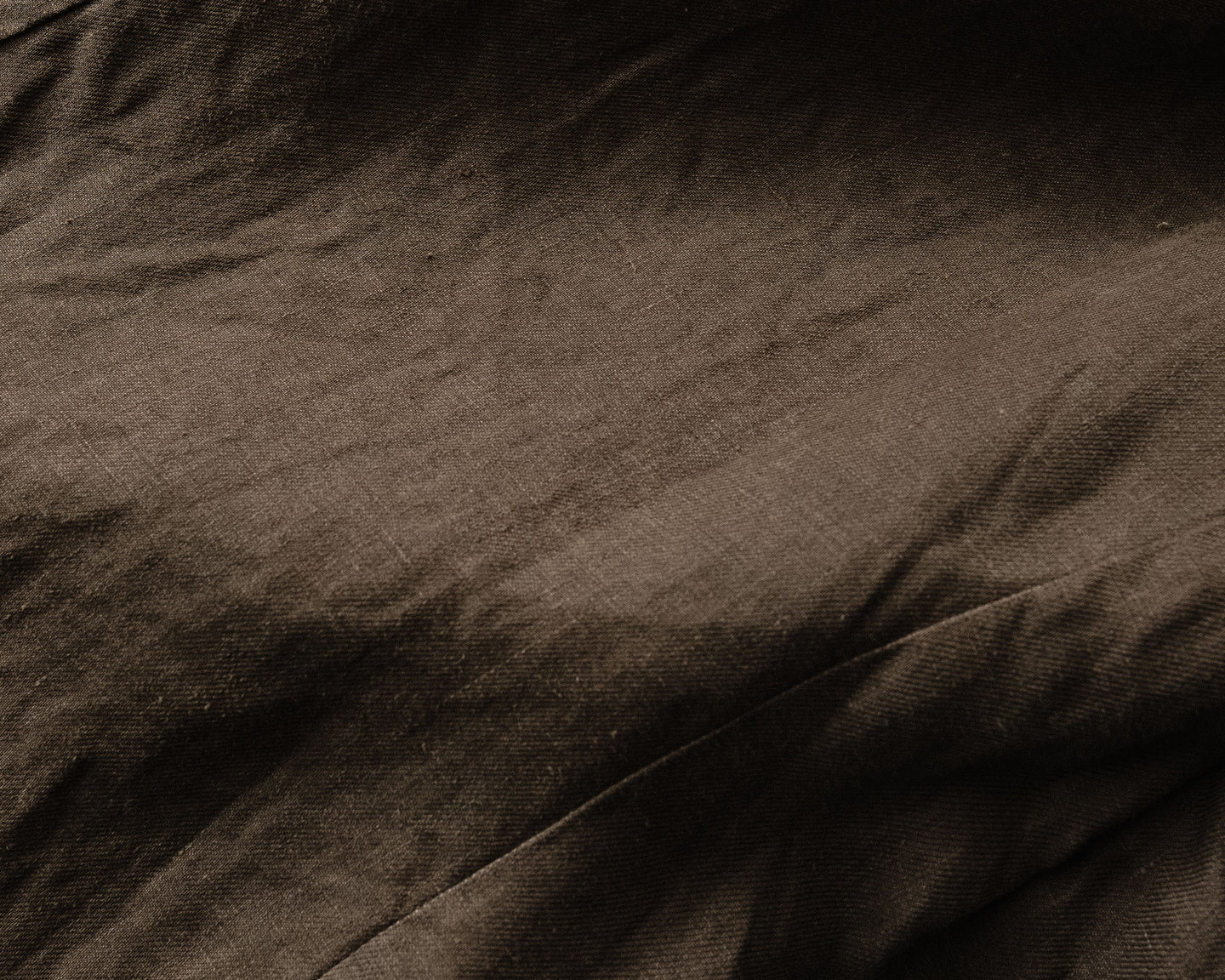 description: medium weight lightly structured twill cloth, blending washi and cotton for a soft hand while retaining a dry feel, breathability and a crinkled texture. Overdyed with natural kakishibu (fermented persimmon/iron mixture) for a warm dark brown tone. hand dyed at a small workshop in Okayama, Japan - where just two people push the boundaries in experimental dye processes. woven in Japan.