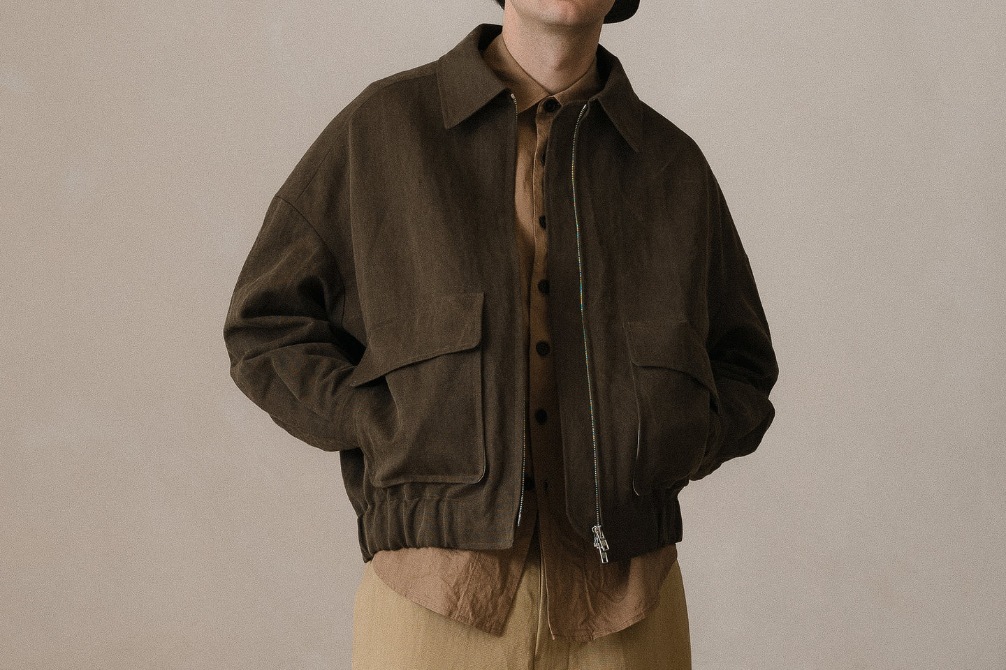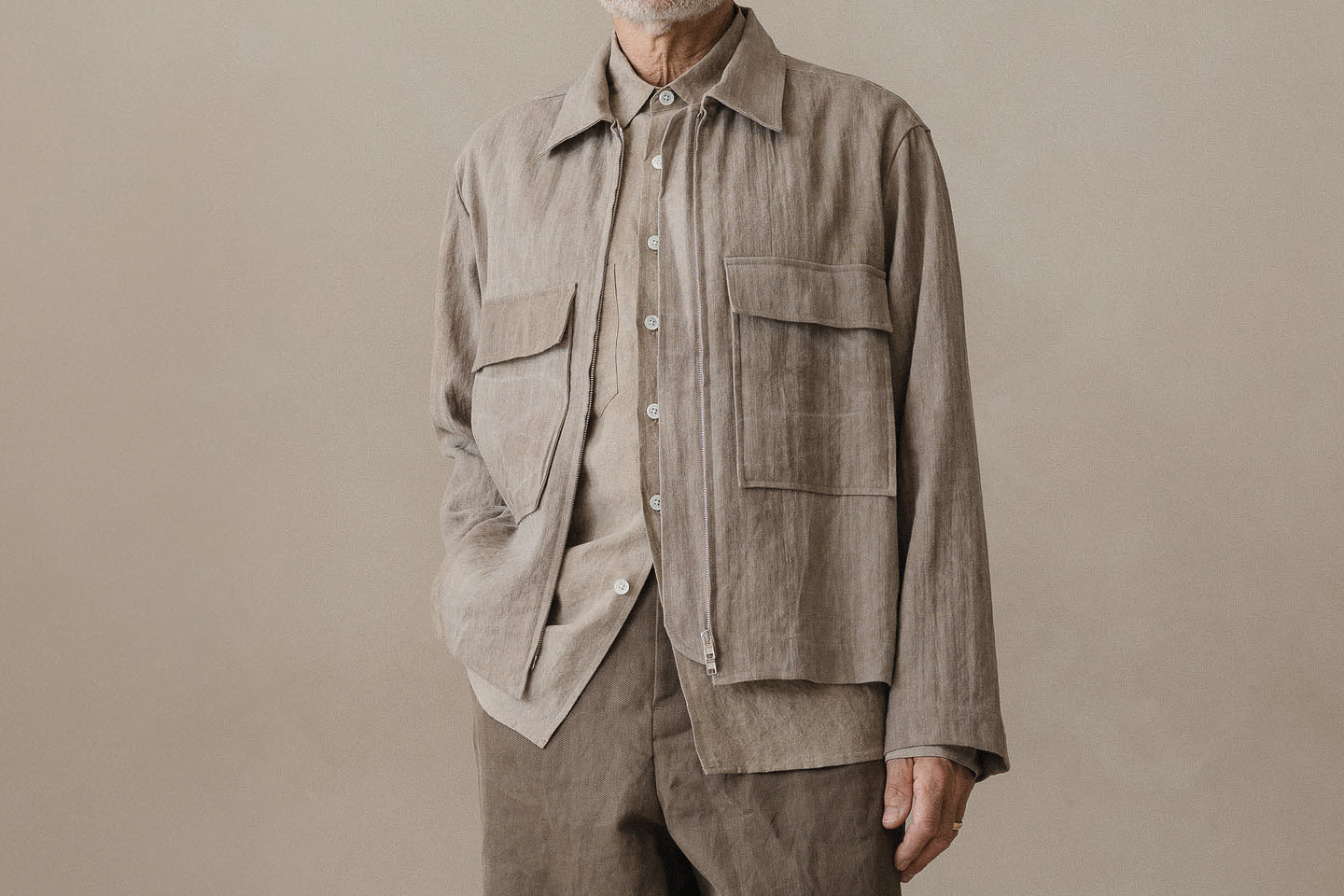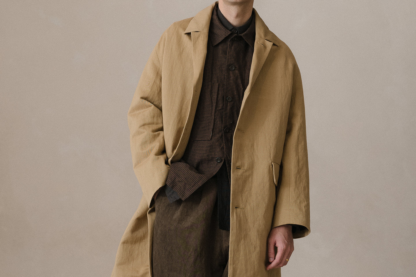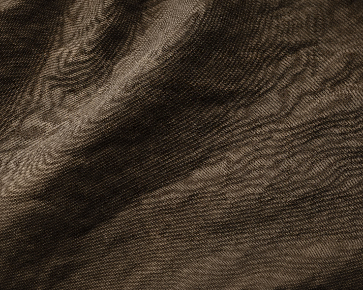 description: a medium weight, tumbled canvas that has been overdyed twice. first using an Oekotex beige color for warmth and then a second time with natural sumi ink for overtones of charcoal and irregularity in the shade. cotton lends softness in the hand, while washi adds a dry texture and distinct breathability. woven and dyed in Japan.