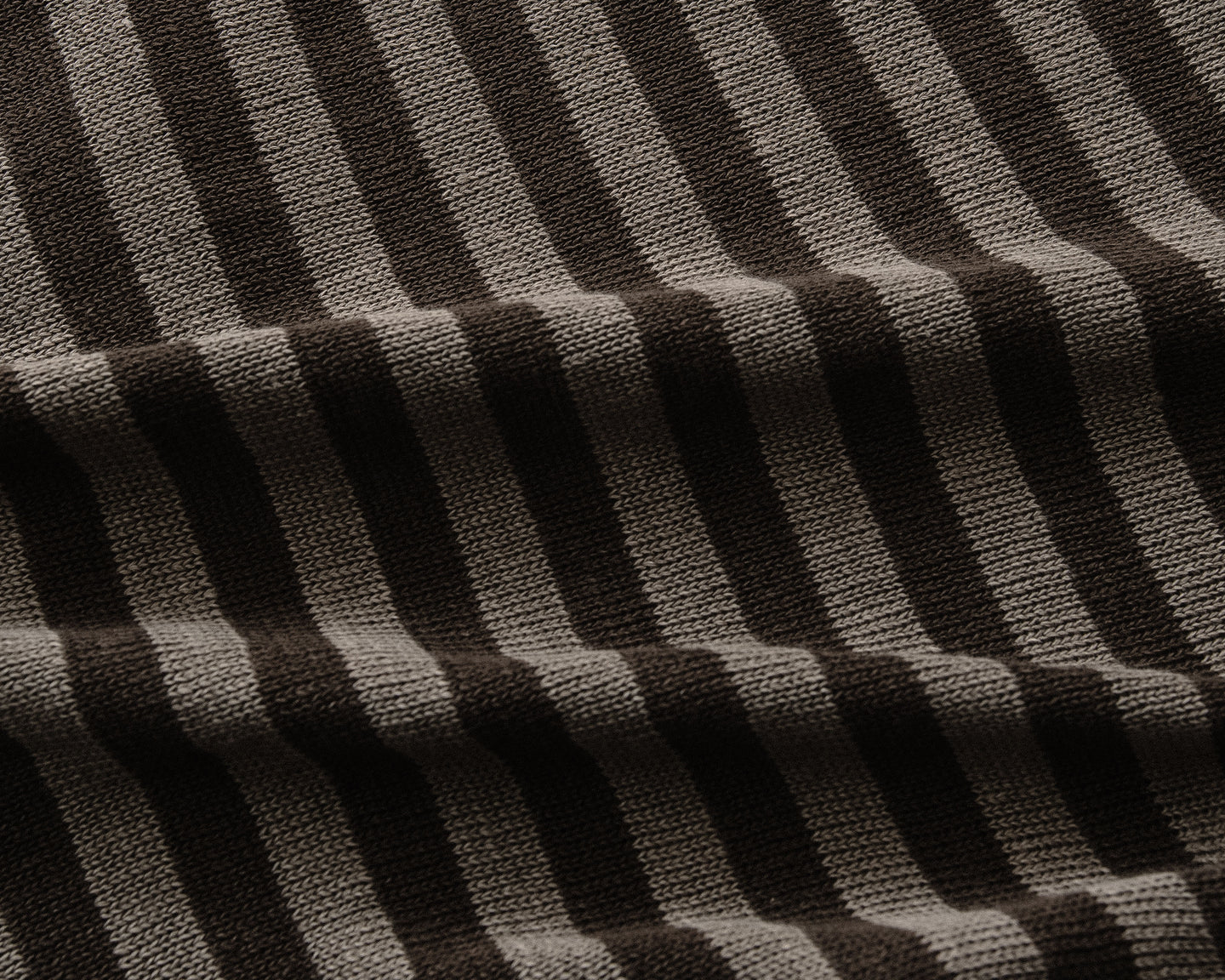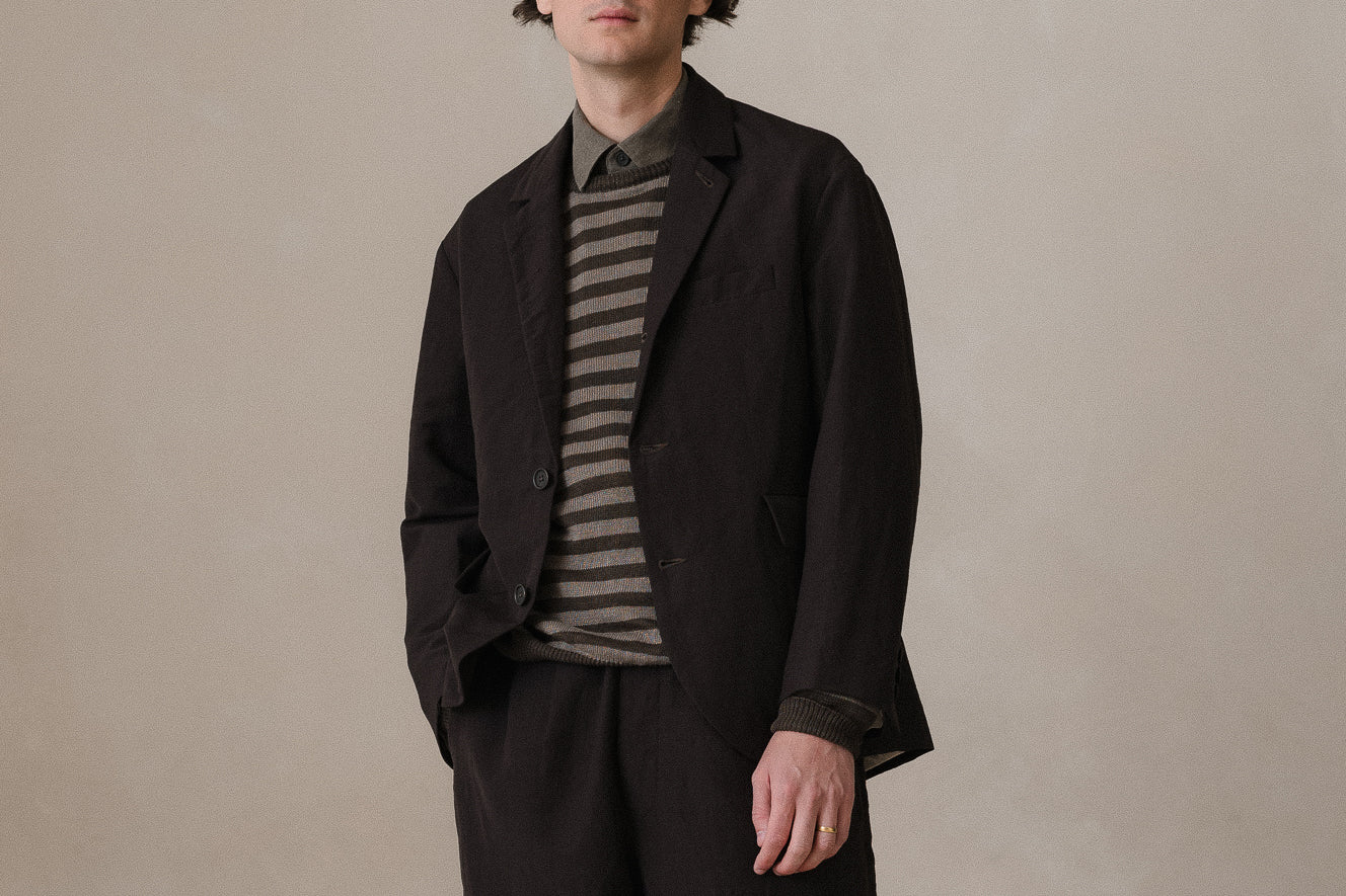 description: custom developed organic cotton & hemp blend stripe. a lighter, all season weight with mild structure from the density. the weft is a dark brown, adding depth and a subtle wobble in the weave as the dark olive and charcoal stripes pass in and out of the dark brown. woven in Japan.