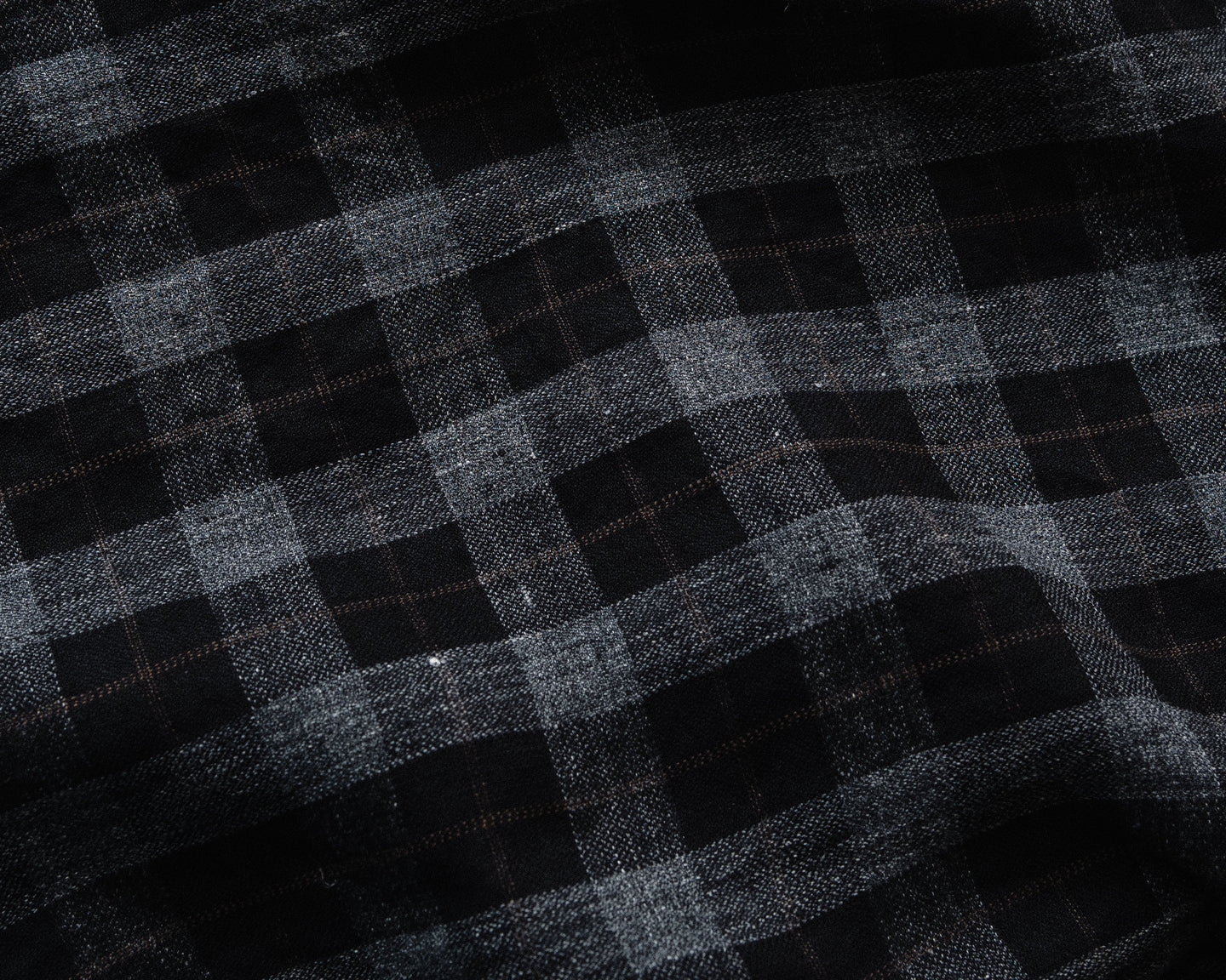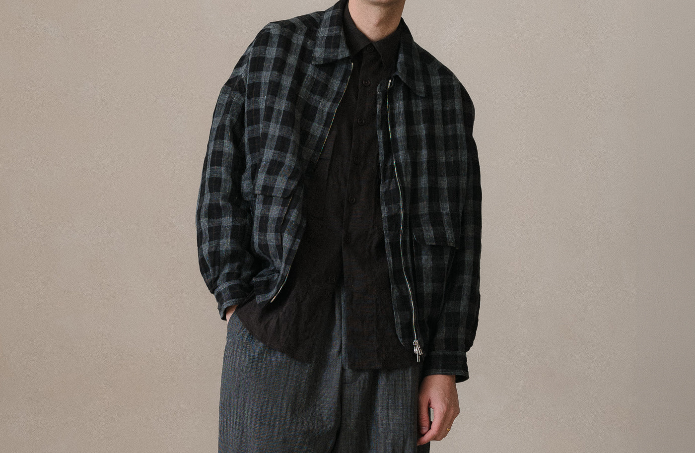 description: lightweight all linen cloth. Mixing a top-dyed heathered charcoal yarn with black and a thin brown check. a dry yet soft unstructured cloth, ideal for warmer temperatures. woven in Japan.