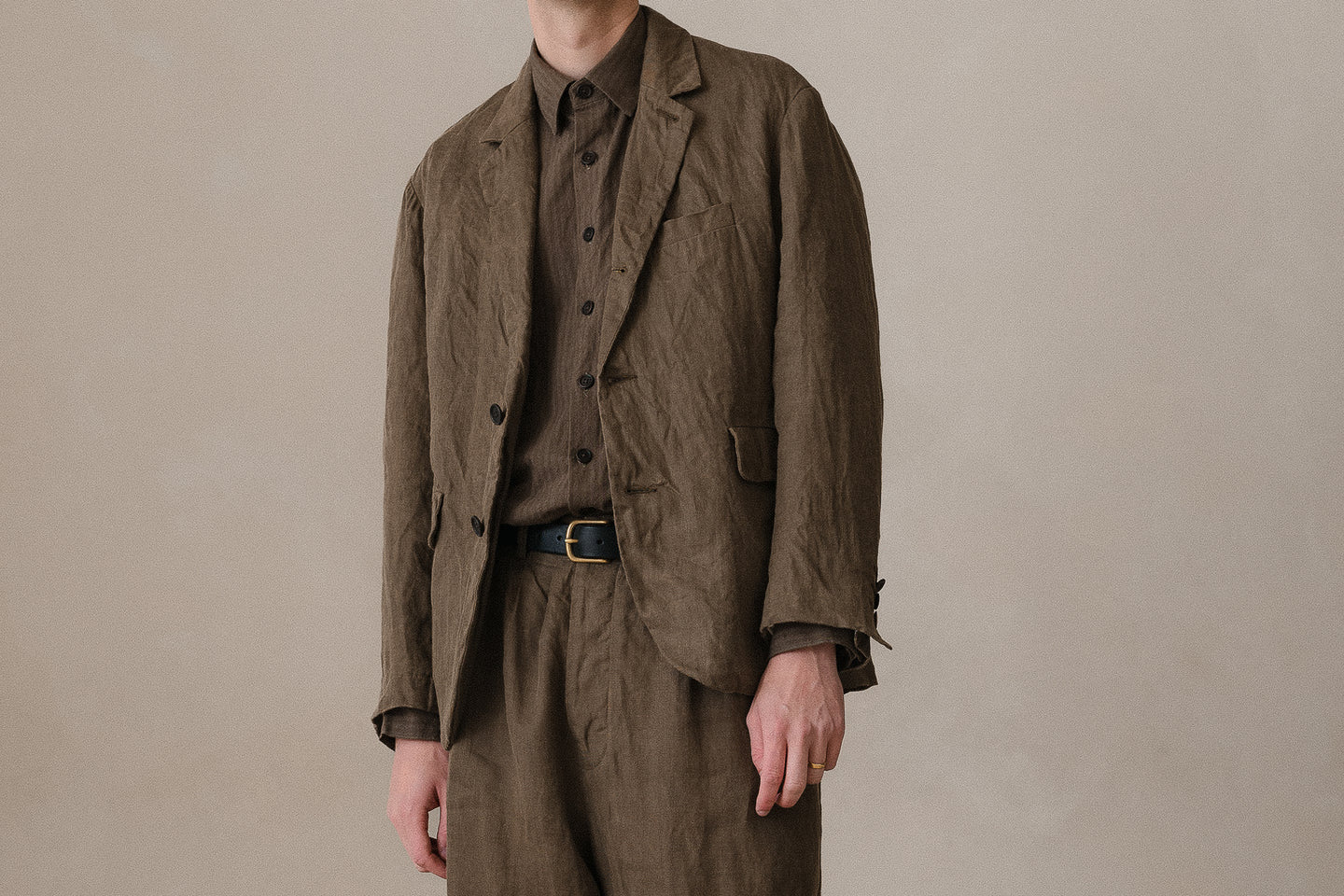 description: dry and lightweight while retaining structure - a blend of tropical worsted wool and linen for a crinkle textured suiting feel. woven in Japan.