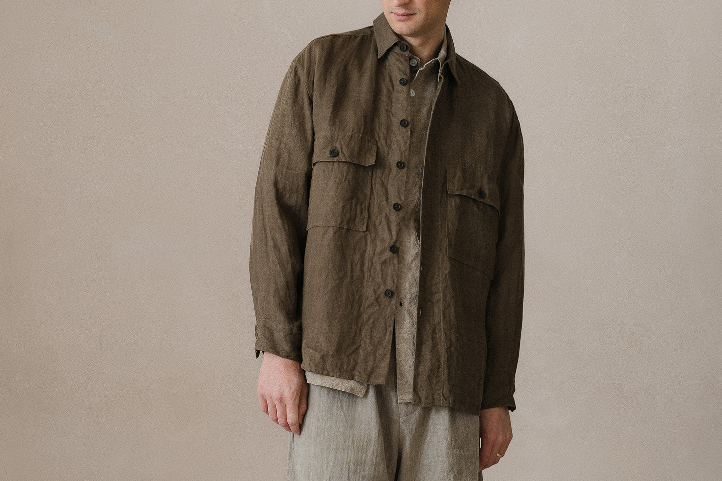 description: a very soft and lightweight tumbled linen/washi blend twill shirting - combining the drape and classic appearance of linen with the dry hand and breathability of washi. woven in Japan.