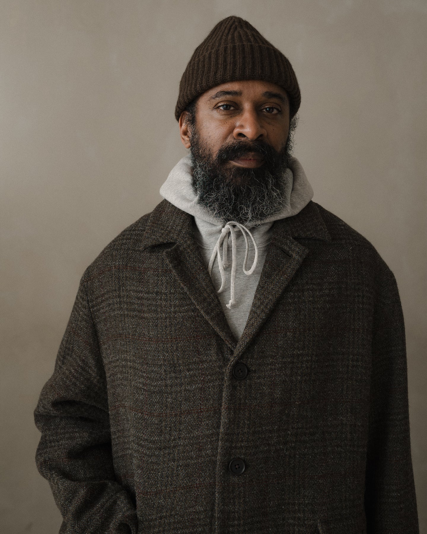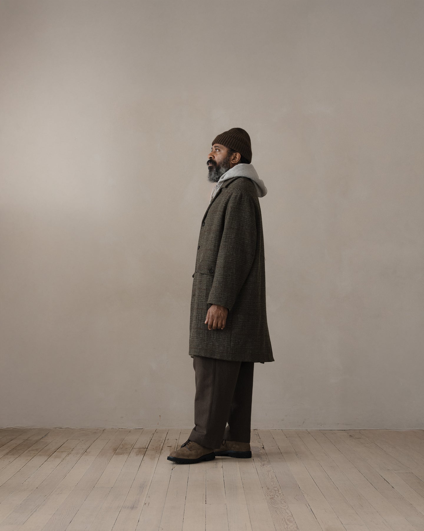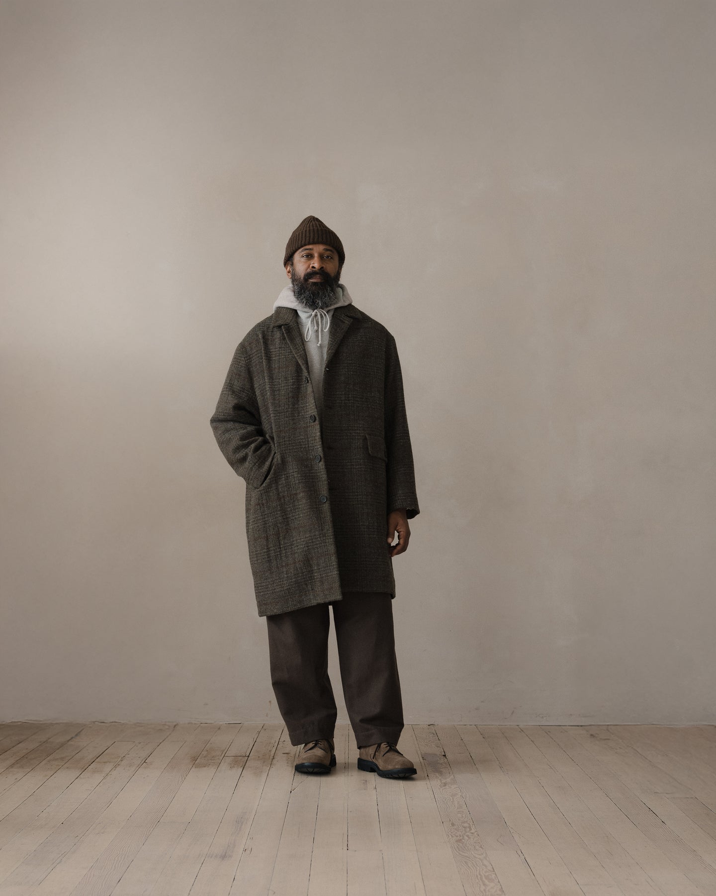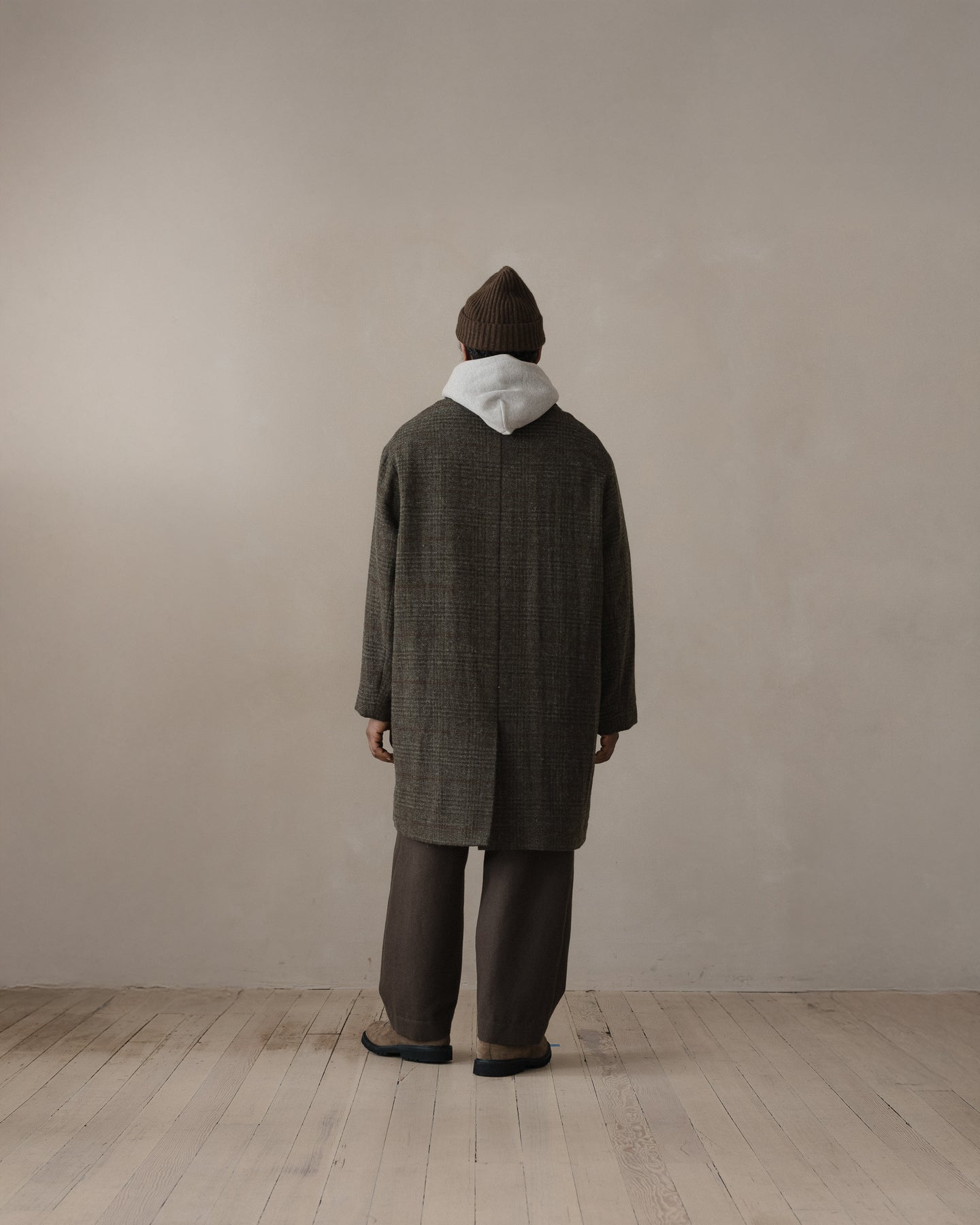 A simple walking coat with generous volume in the body and sleeves along with a dropped shoulder. Can be worn more formal with the lapel down or buttoned all the way up. The coat features button-through flap welt pockets, interior patch pockets and corozo buttons.
