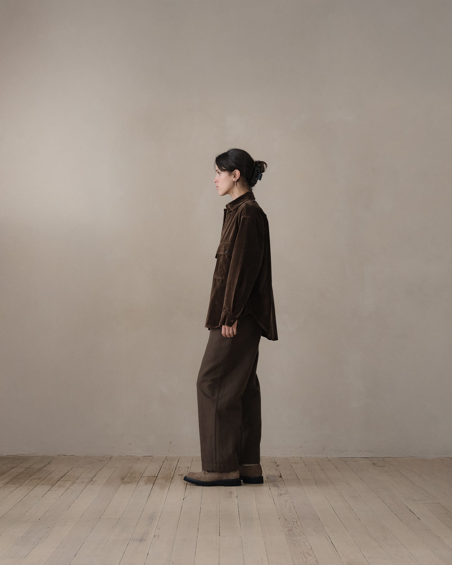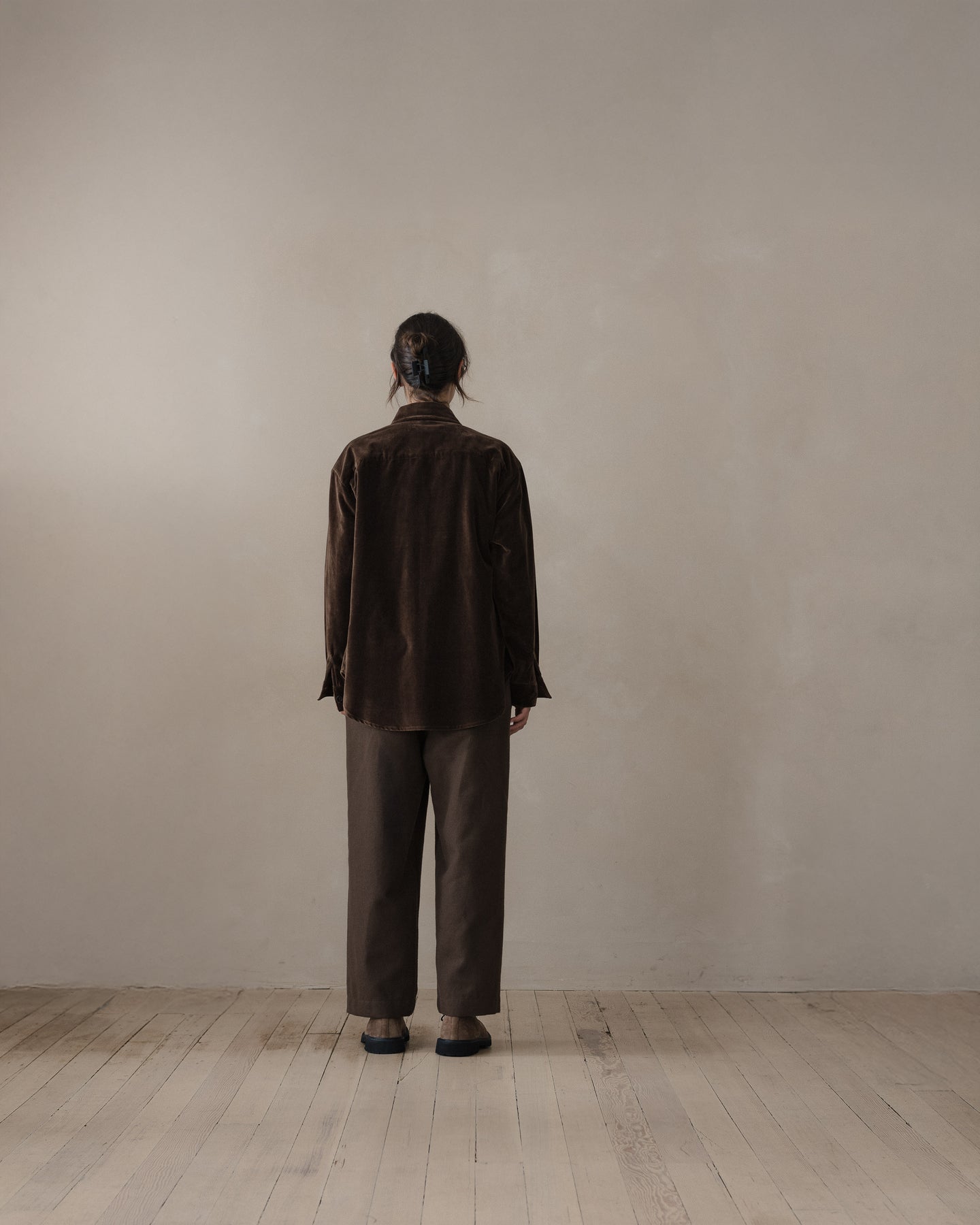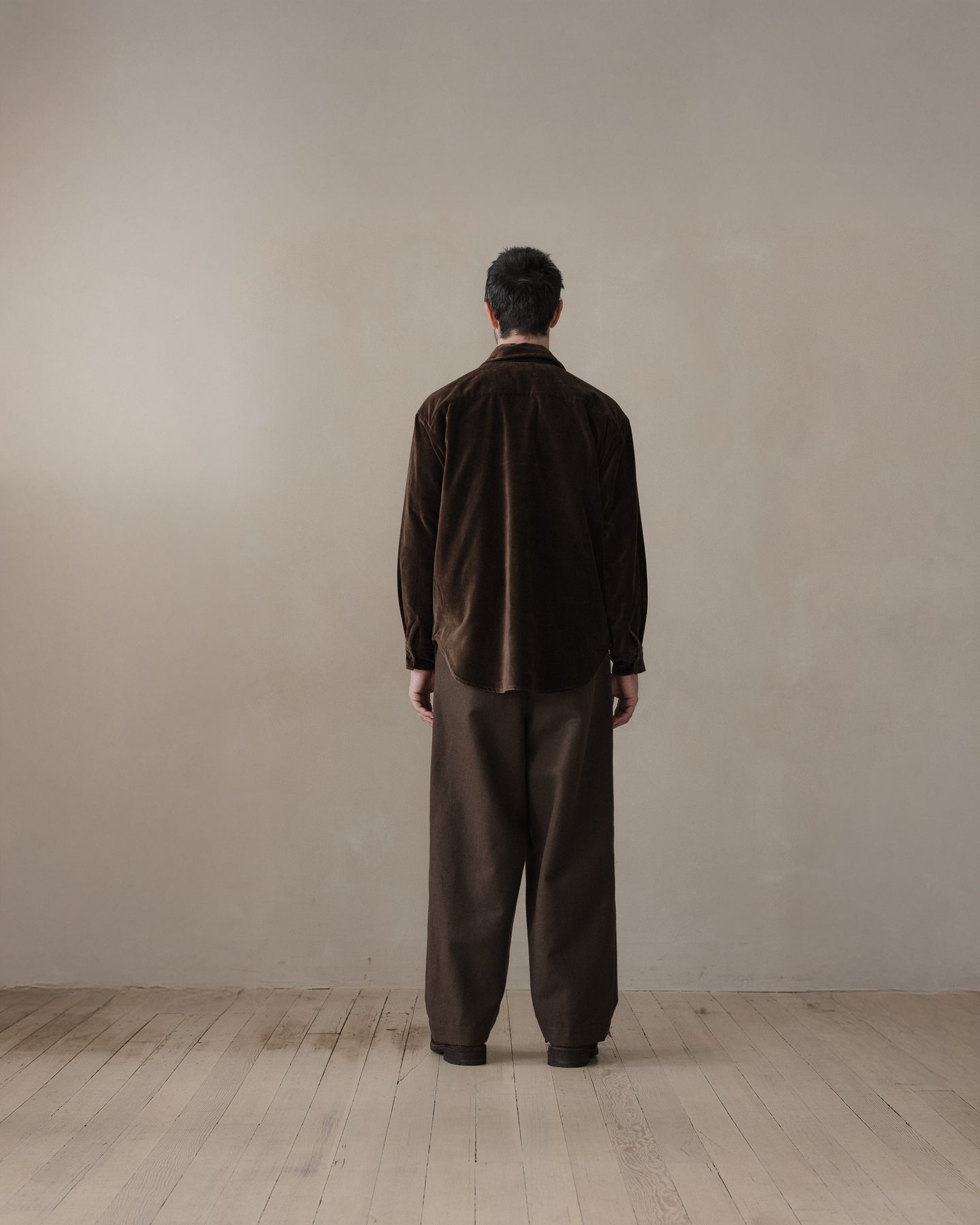 100% cotton velvet woven in Fukui Prefecture by a multi-generational family run mill. Soft and relatively unstructured, this cloth was then dyed in Okayama with a mixture of about 90% natural logwood dye and 10% conventional Oekotex dye to help achieve a more even and durable color.