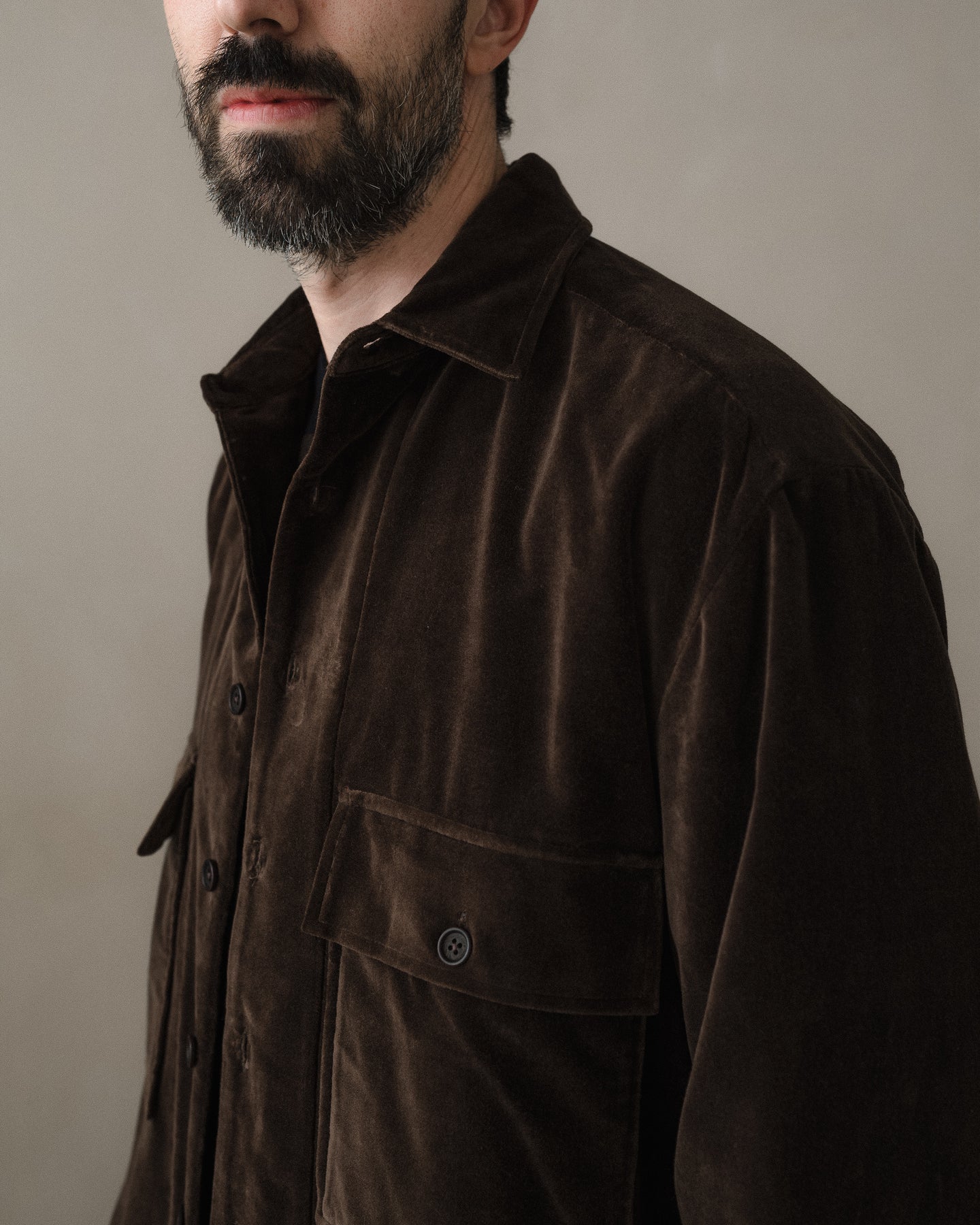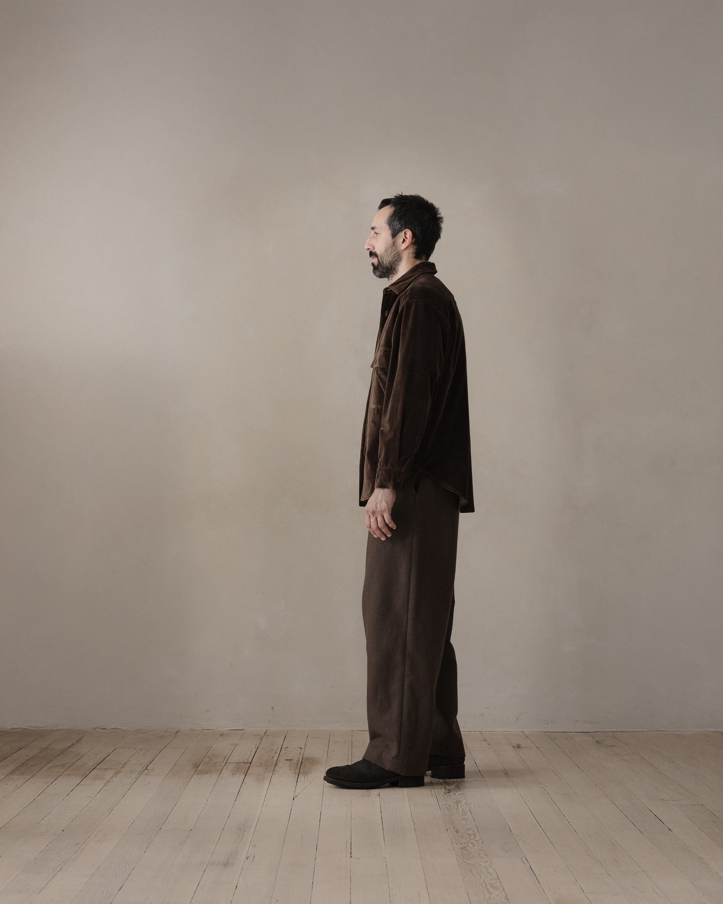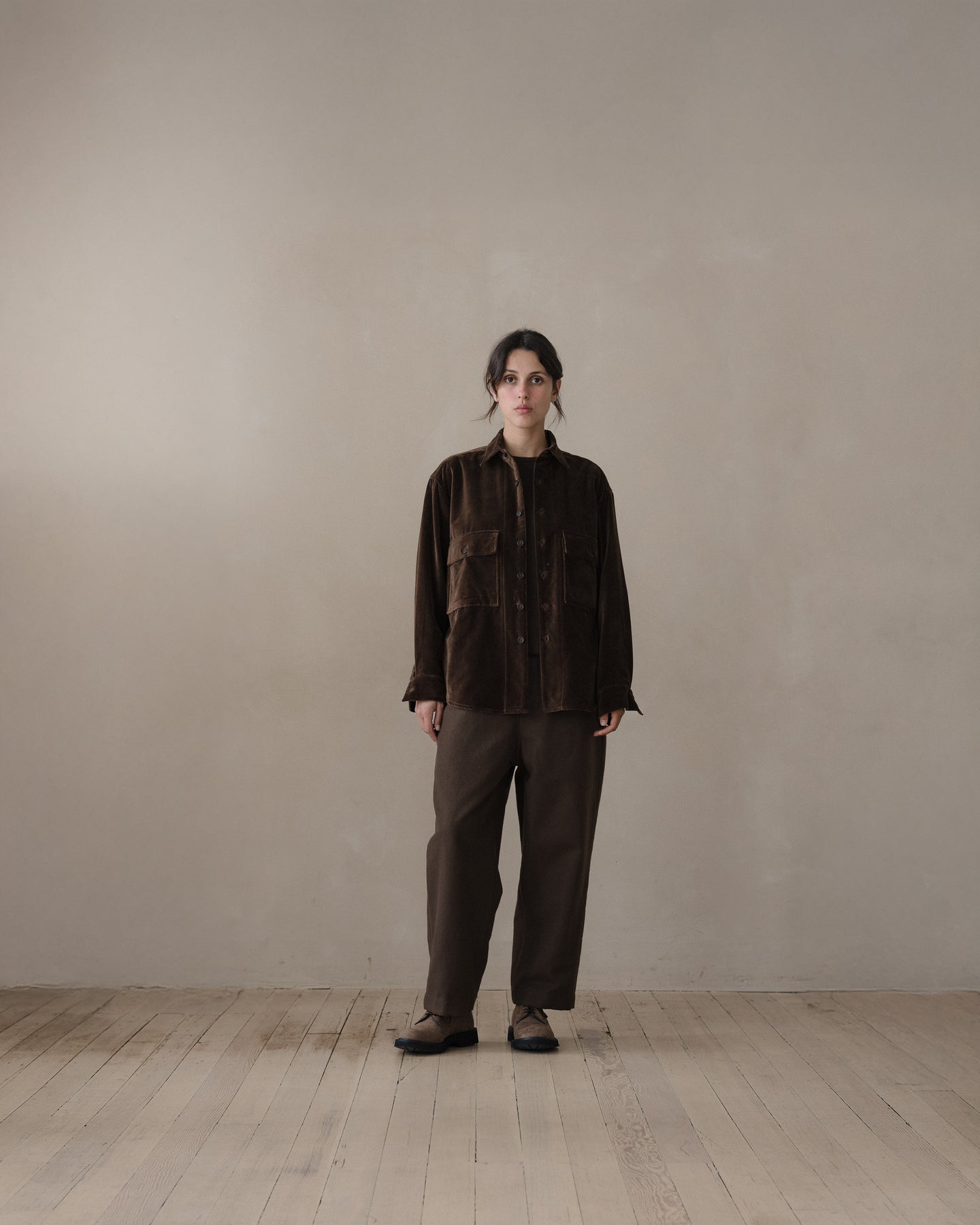 100% cotton velvet woven in Fukui Prefecture by a multi-generational family run mill. Soft and relatively unstructured, this cloth was then dyed in Okayama with a mixture of about 90% natural logwood dye and 10% conventional Oekotex dye to help achieve a more even and durable color.