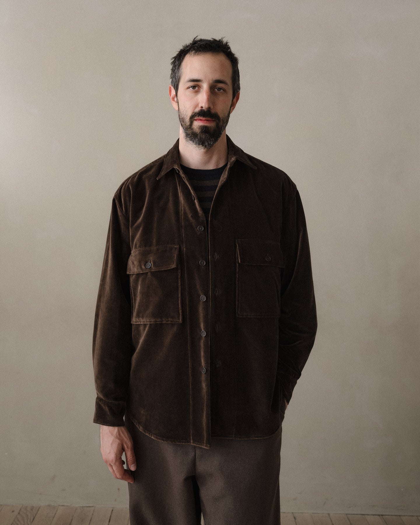 A looser fitting buttondown with large dropped chest pockets, corozo buttons, french seams, squared cuffs, pointed collar, more pronounced curved hem and wide stitched placket. This shirt is cut more relaxed in the chest with a dropped shoulder and a slightly longer body compared to the Two Pocket Shirt.