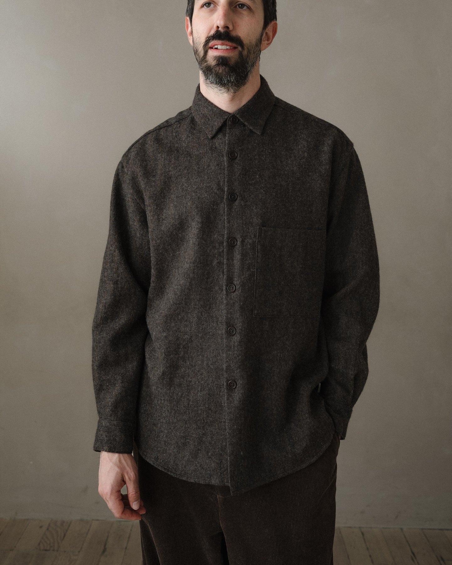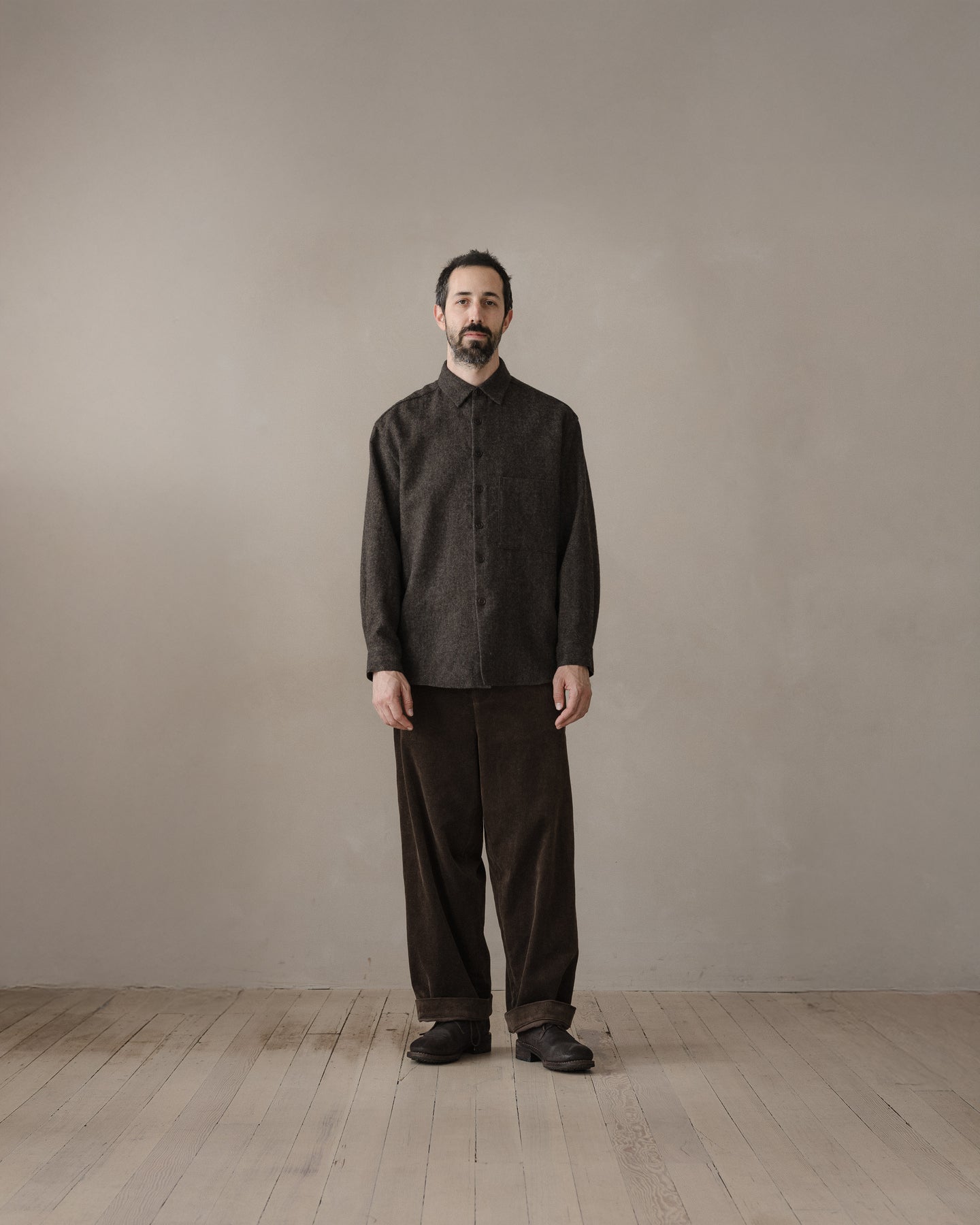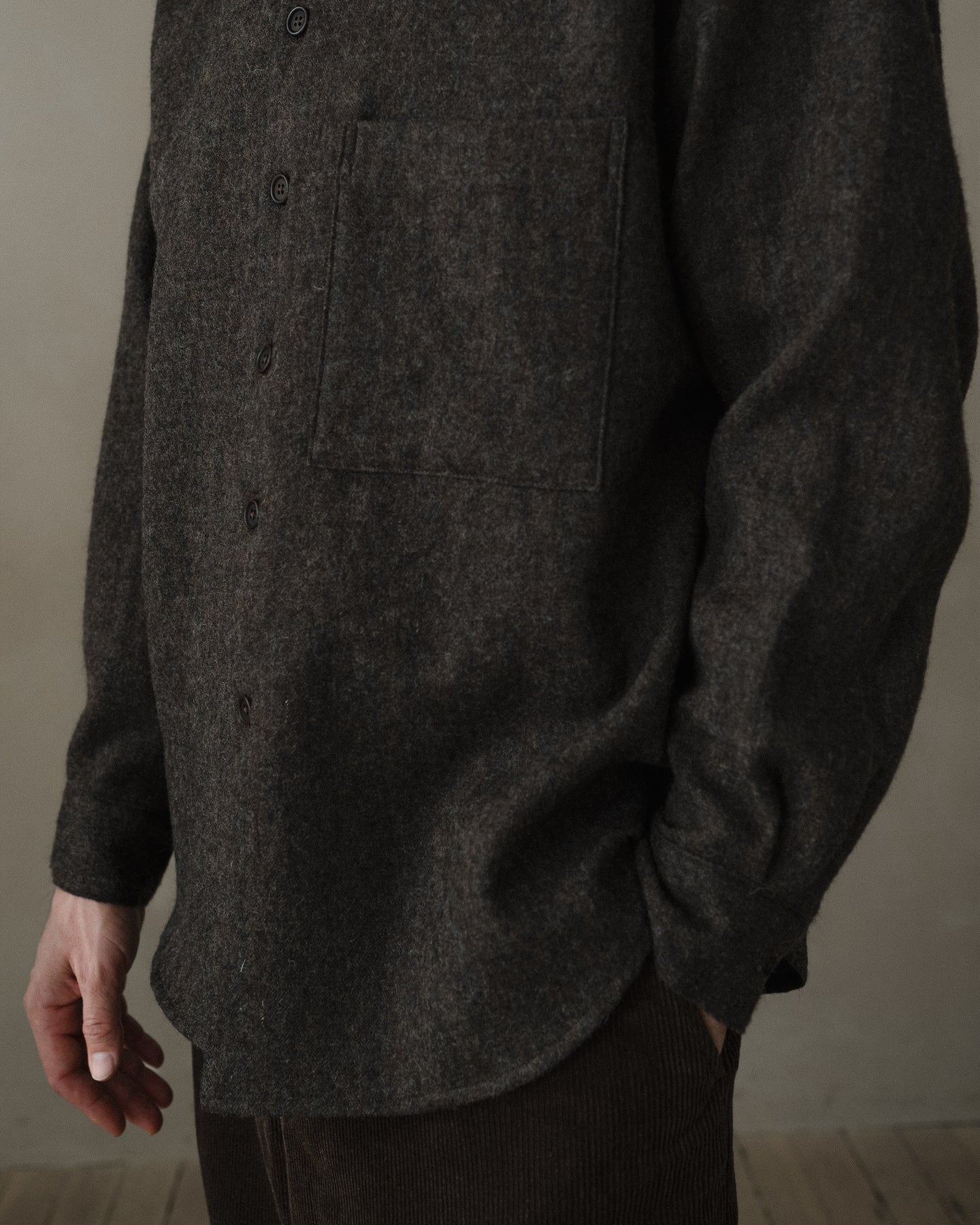 A looser fitting buttondown with single chest pocket, corozo buttons, french seams, squared cuffs, pointed collar, more pronounced curved hem and ‘invisible’ placket. This shirt is based on the same fit of the Big Shirt - cut more relaxed in the chest with a dropped shoulder and a slightly longer body compared to the Two Pocket Shirt.