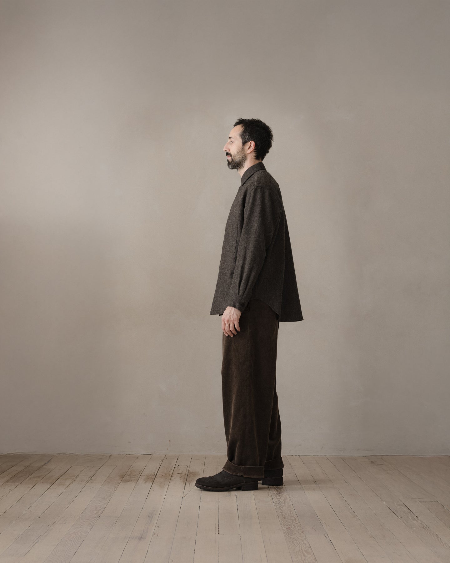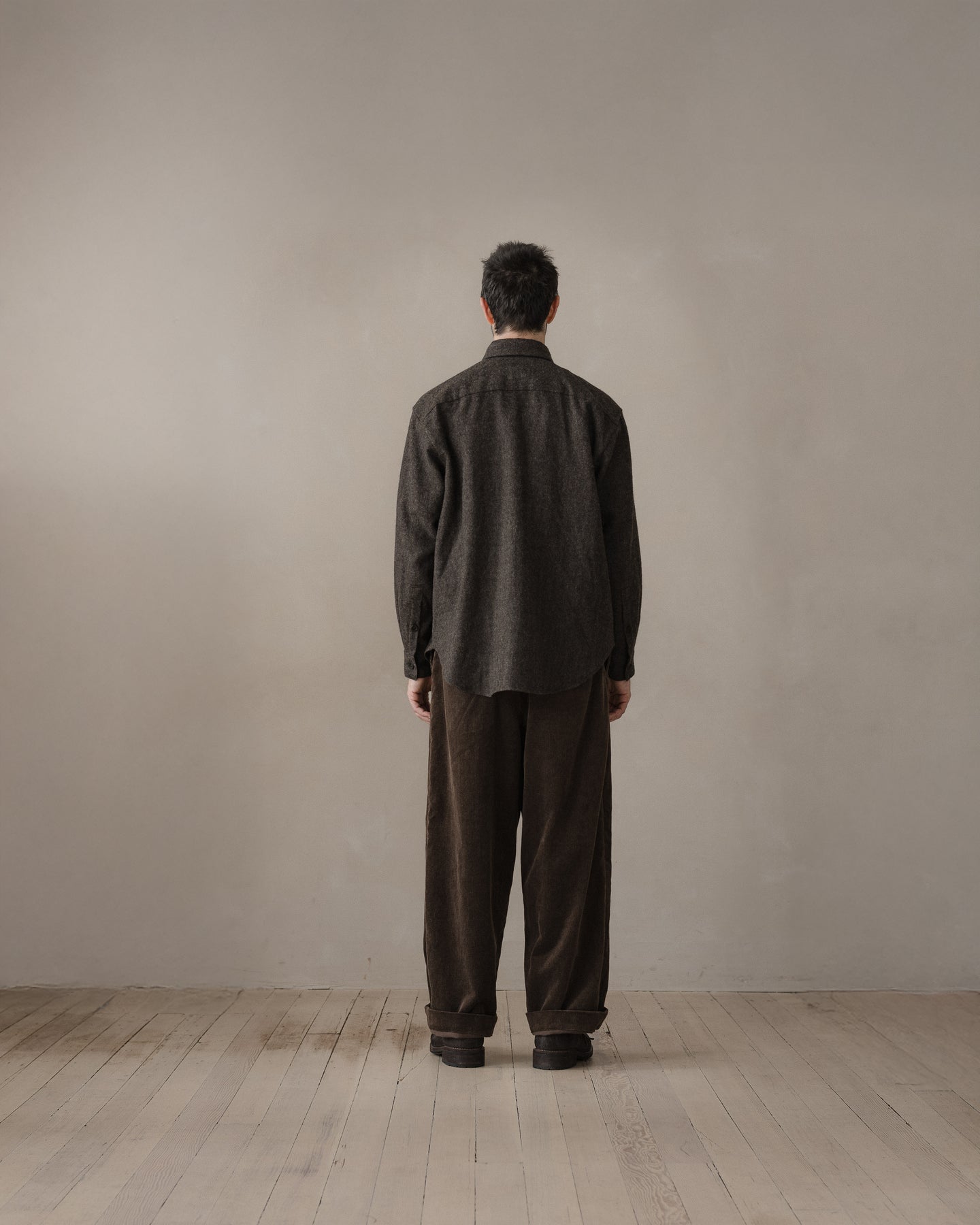 Bringing together two shades of undyed organic wool sourced from Uruguay, this subtle herringbone pattern blends natural shades of brown and charcoal. The yarn was spun in Yamagata and woven in Ichinomiya, Japan. The cloth was washed and tumbled in the finishing to impart a softer, raised texture along with a lofty and dry hand.
