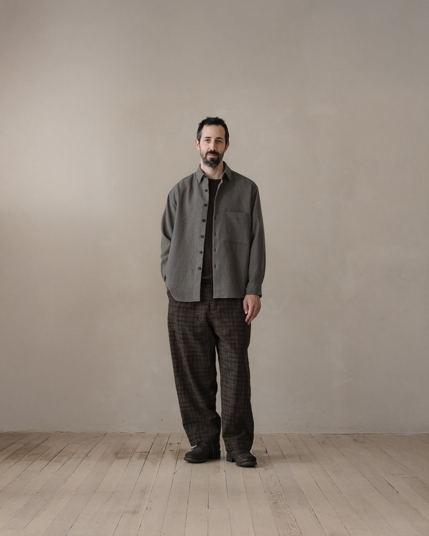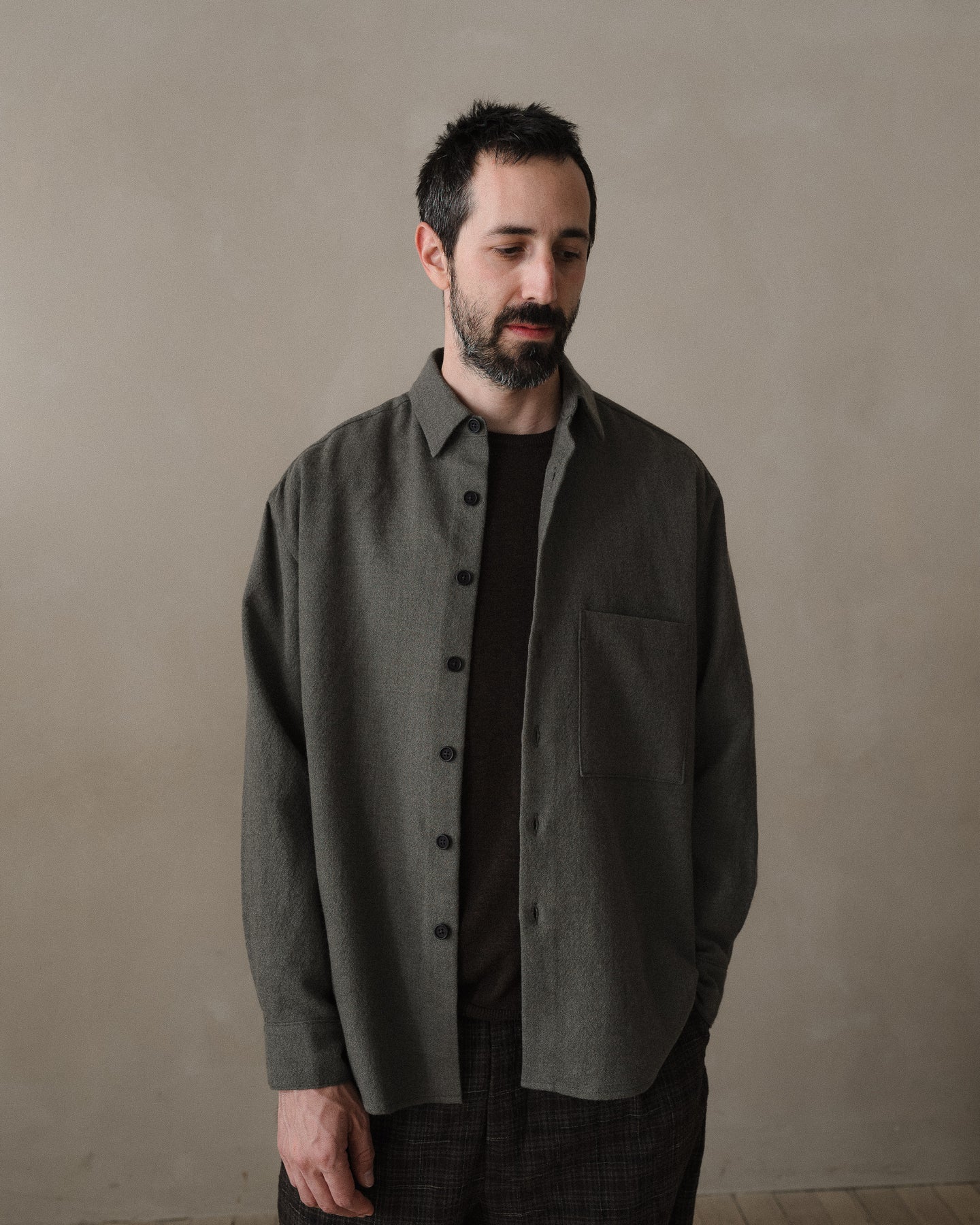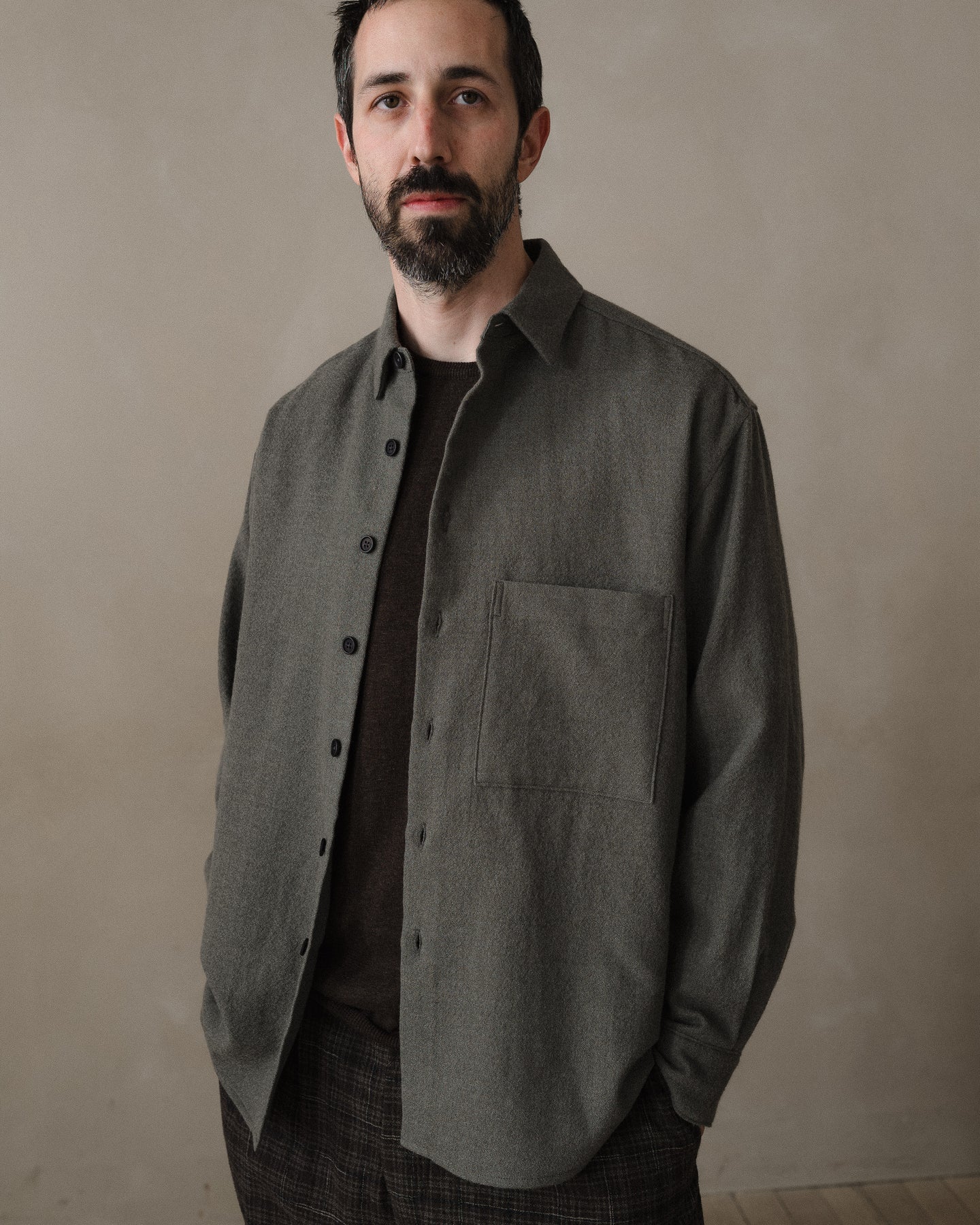 A looser fitting buttondown with single chest pocket, corozo buttons, french seams, squared cuffs, pointed collar, more pronounced curved hem and ‘invisible’ placket. This shirt is based on the same fit of the Big Shirt - cut more relaxed in the chest with a dropped shoulder and a slightly longer body compared to the Two Pocket Shirt.