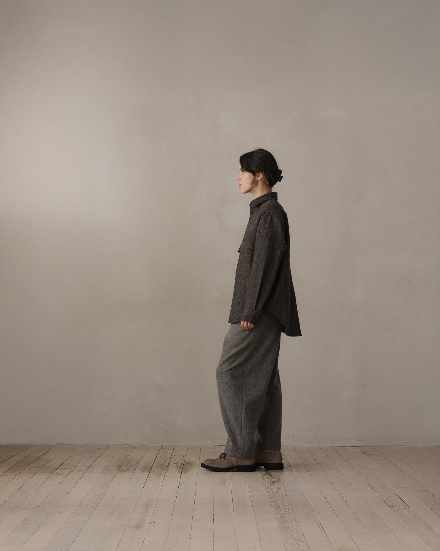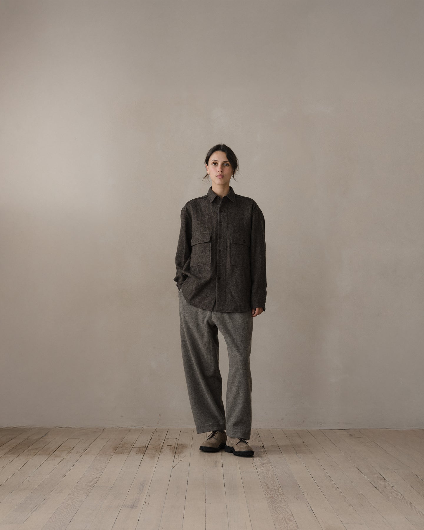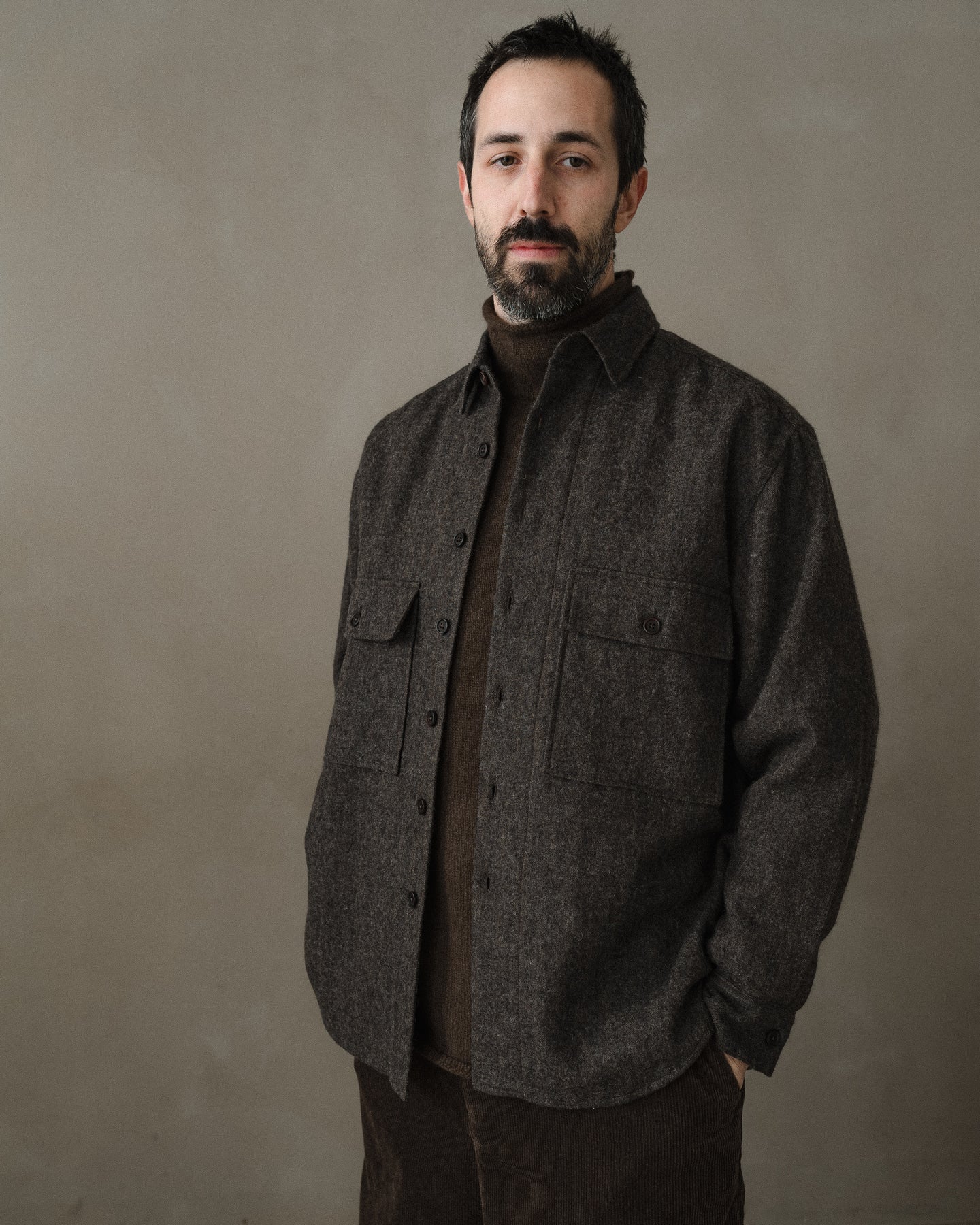 Bringing together two shades of undyed organic wool sourced from Uruguay, this subtle herringbone pattern blends natural shades of brown and charcoal. The yarn was spun in Yamagata and woven in Ichinomiya, Japan. The cloth was washed and tumbled in the finishing to impart a softer, raised texture along with a lofty and dry hand.