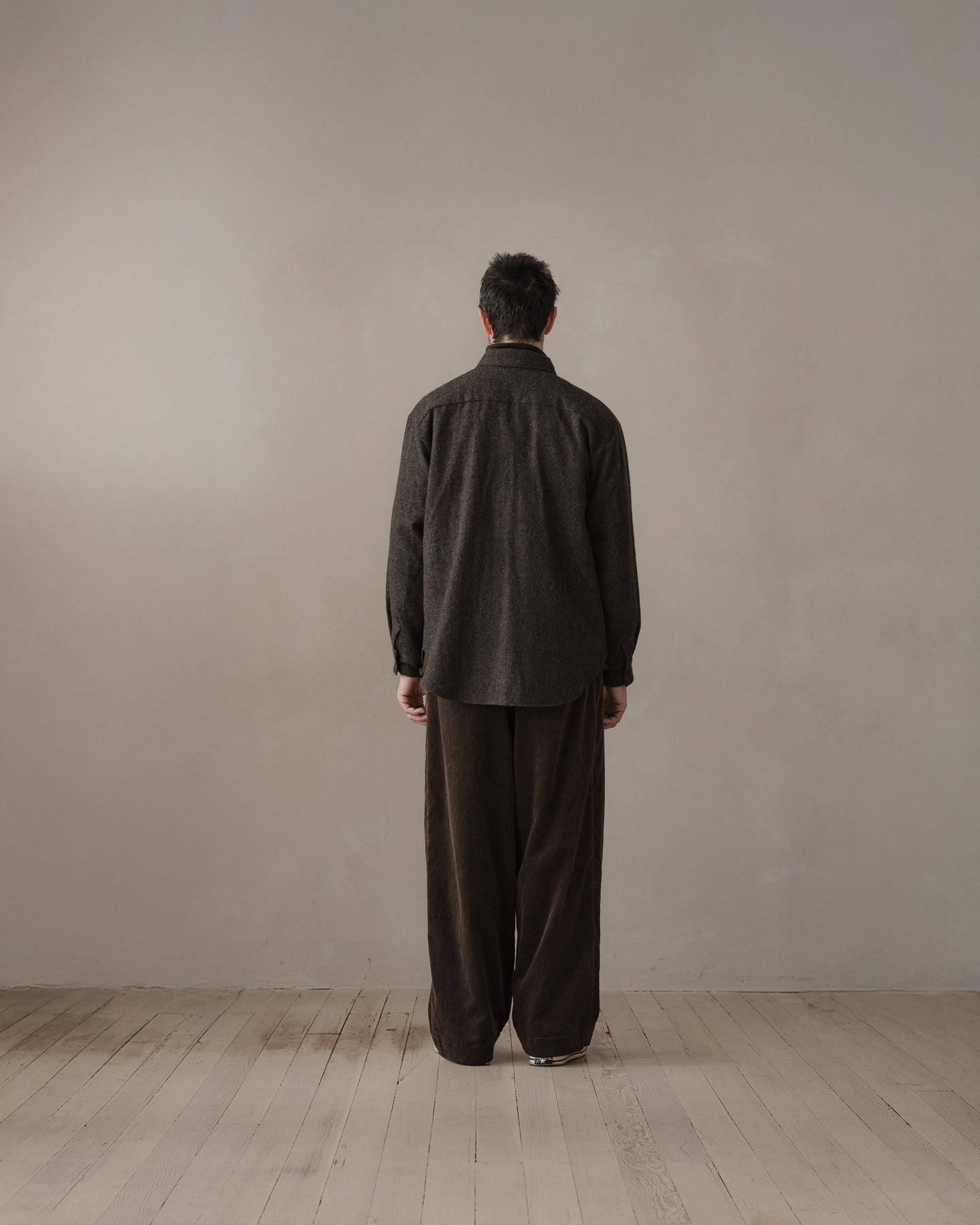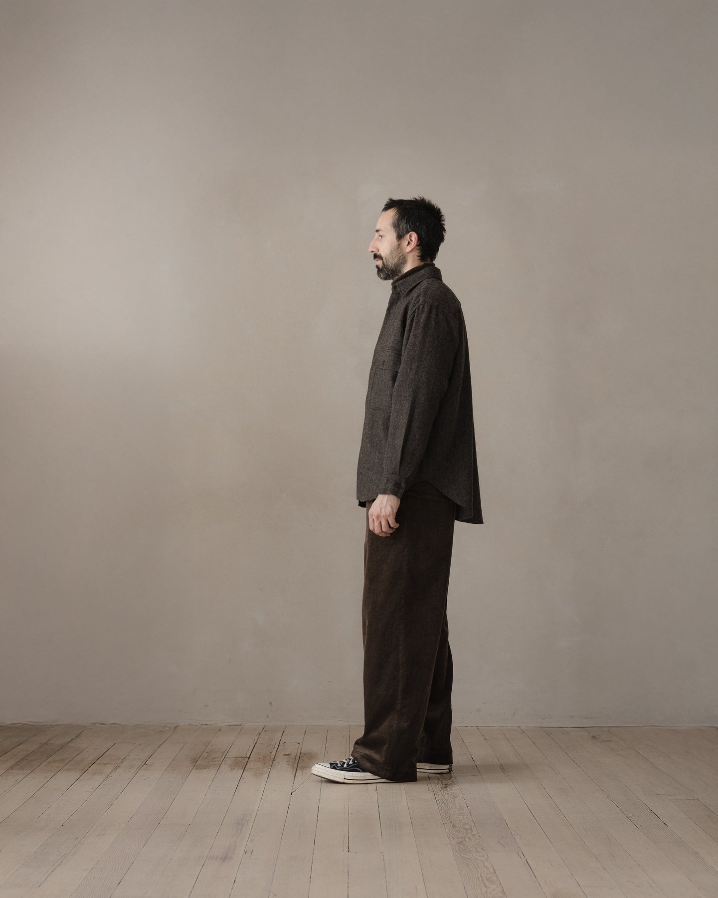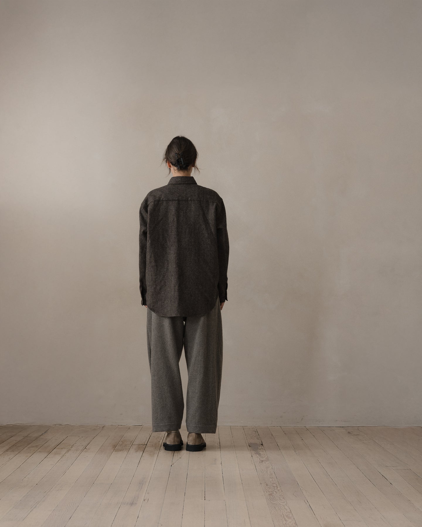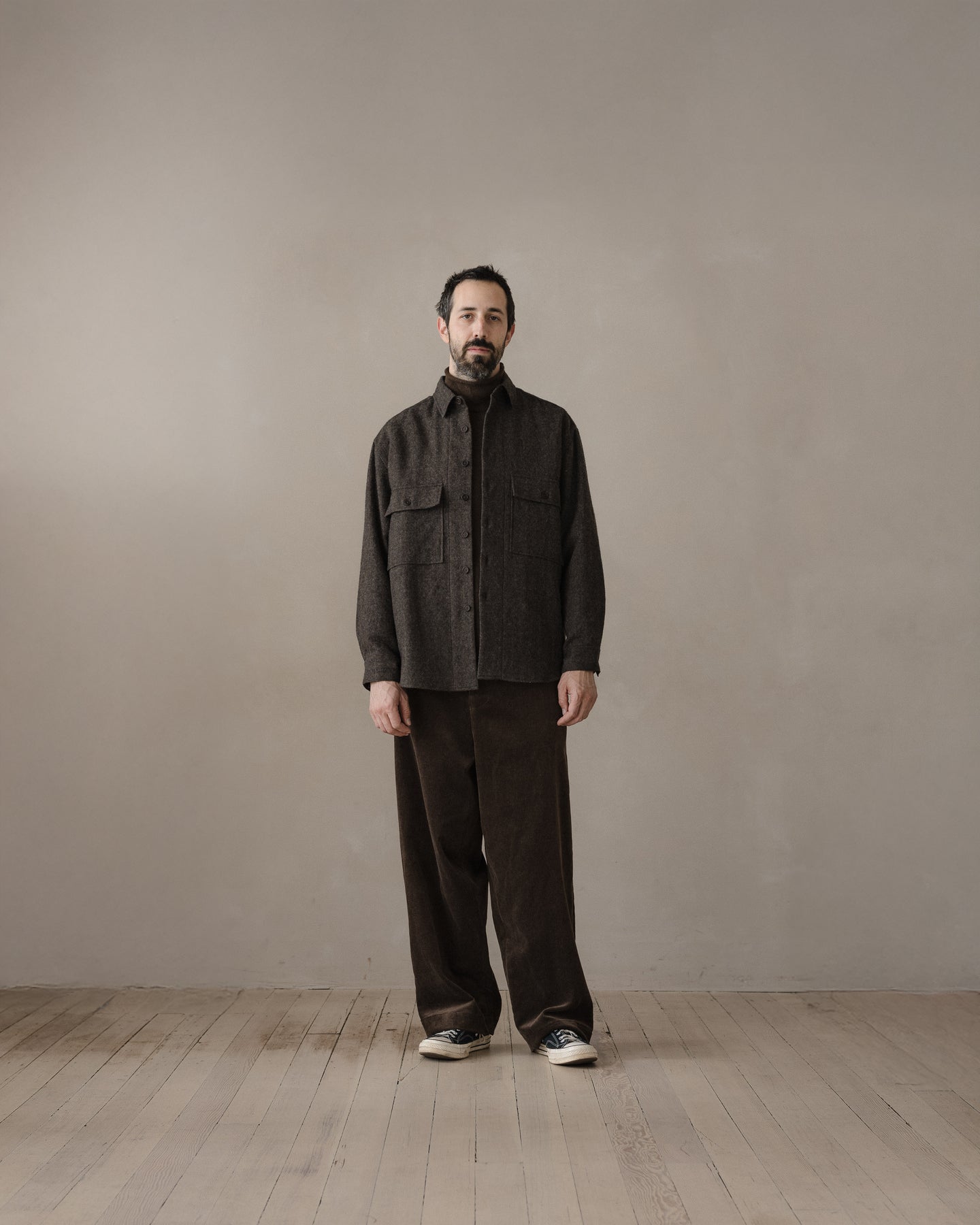 Bringing together two shades of undyed organic wool sourced from Uruguay, this subtle herringbone pattern blends natural shades of brown and charcoal. The yarn was spun in Yamagata and woven in Ichinomiya, Japan. The cloth was washed and tumbled in the finishing to impart a softer, raised texture along with a lofty and dry hand.