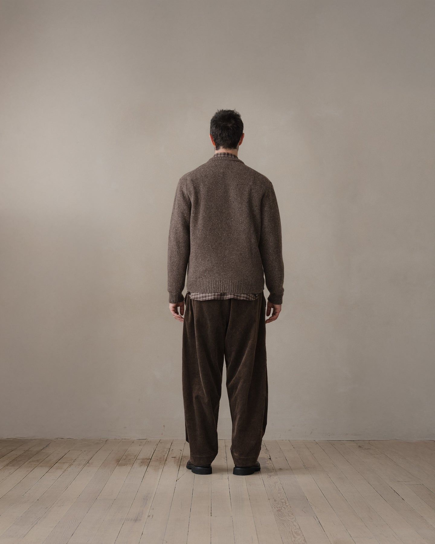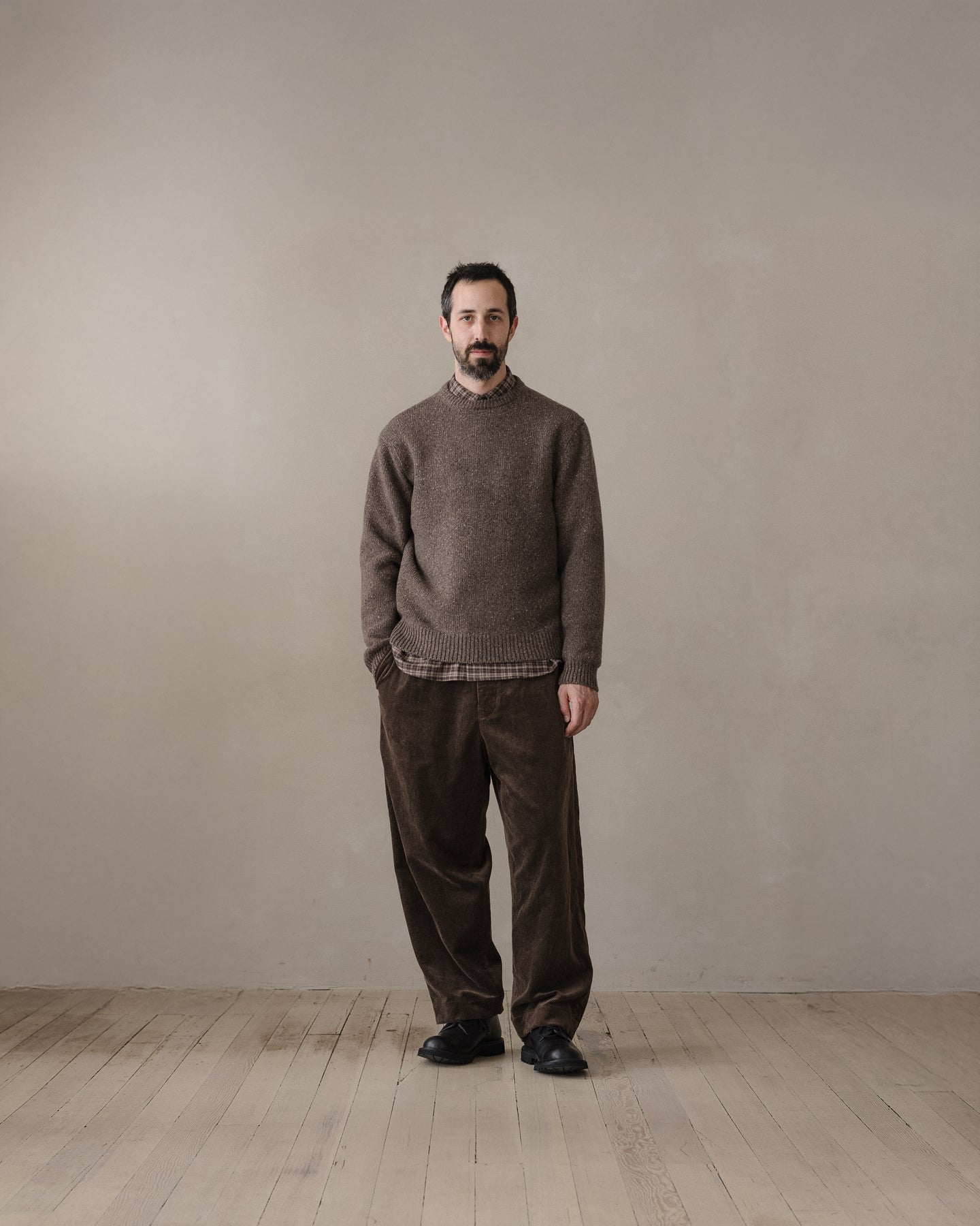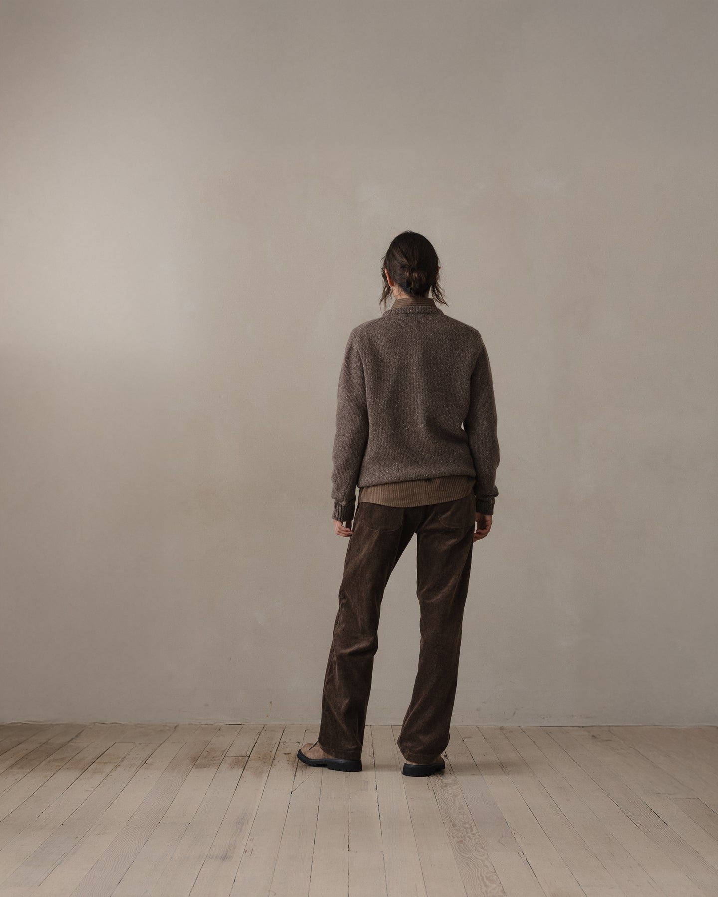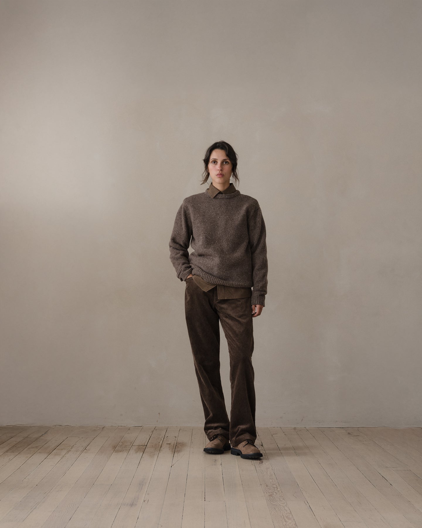 Knitted in Lucca, Italy from a light brown colored 75% recycled cashmere/ 25% wool blend tweed yarn.