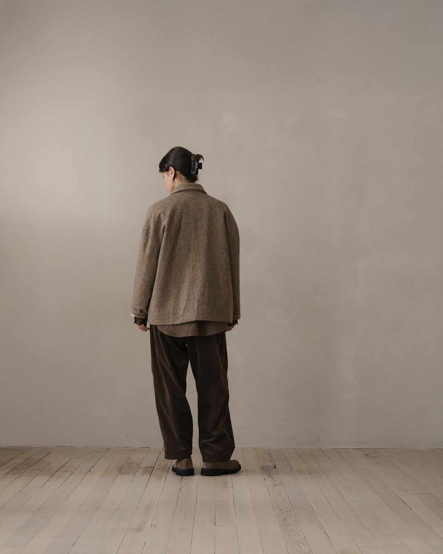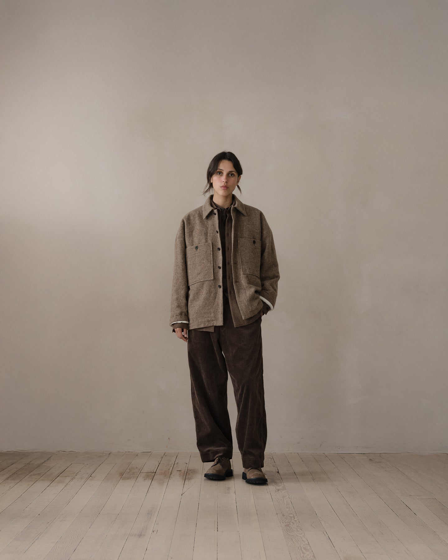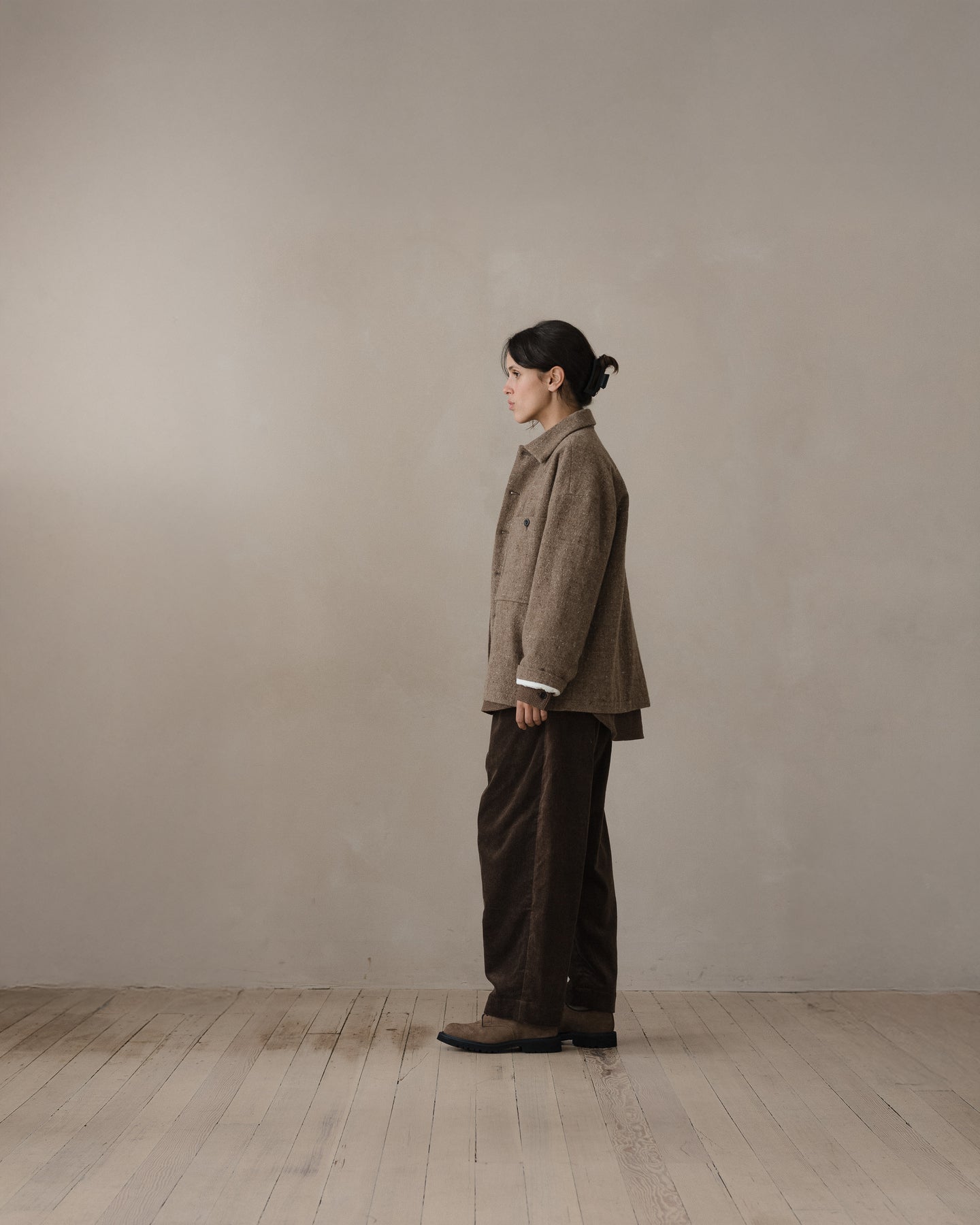 This soft, lofty and unstructured woolen cloth features undyed wool sourced from New Zealand. The yarn was spun in the tweed style, mixing in random occuring flecks of varying shades of undyed wool. The cloth was woven in Ichinomiya, Japan. This textured plain weave cloth was washed and tumbled to achieve a more raw feeling, natural finish before cutting into garments.