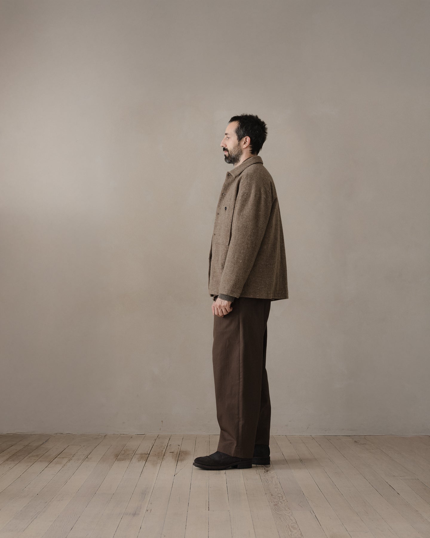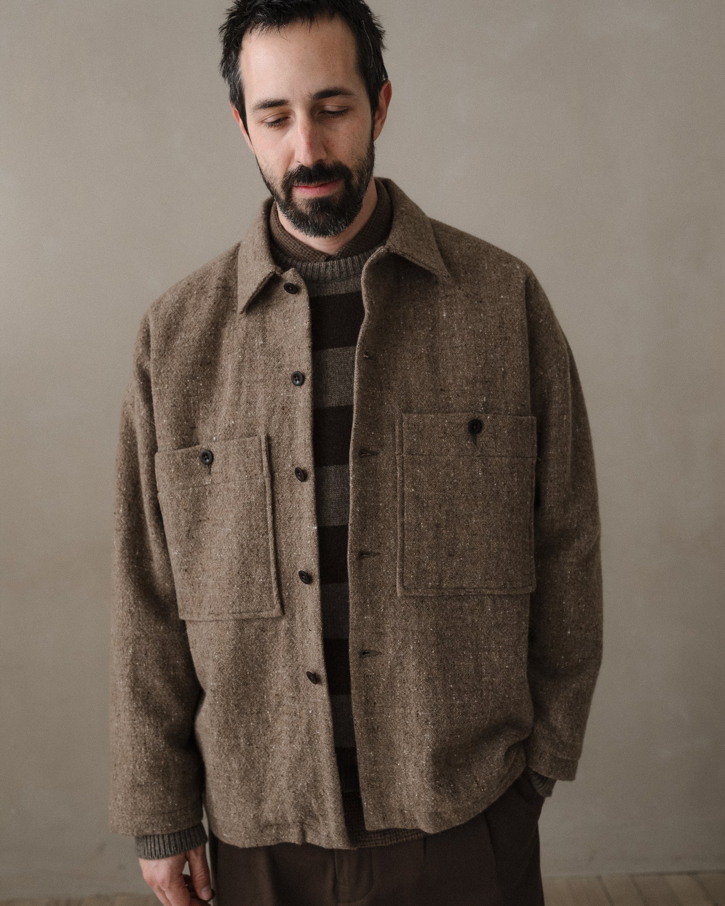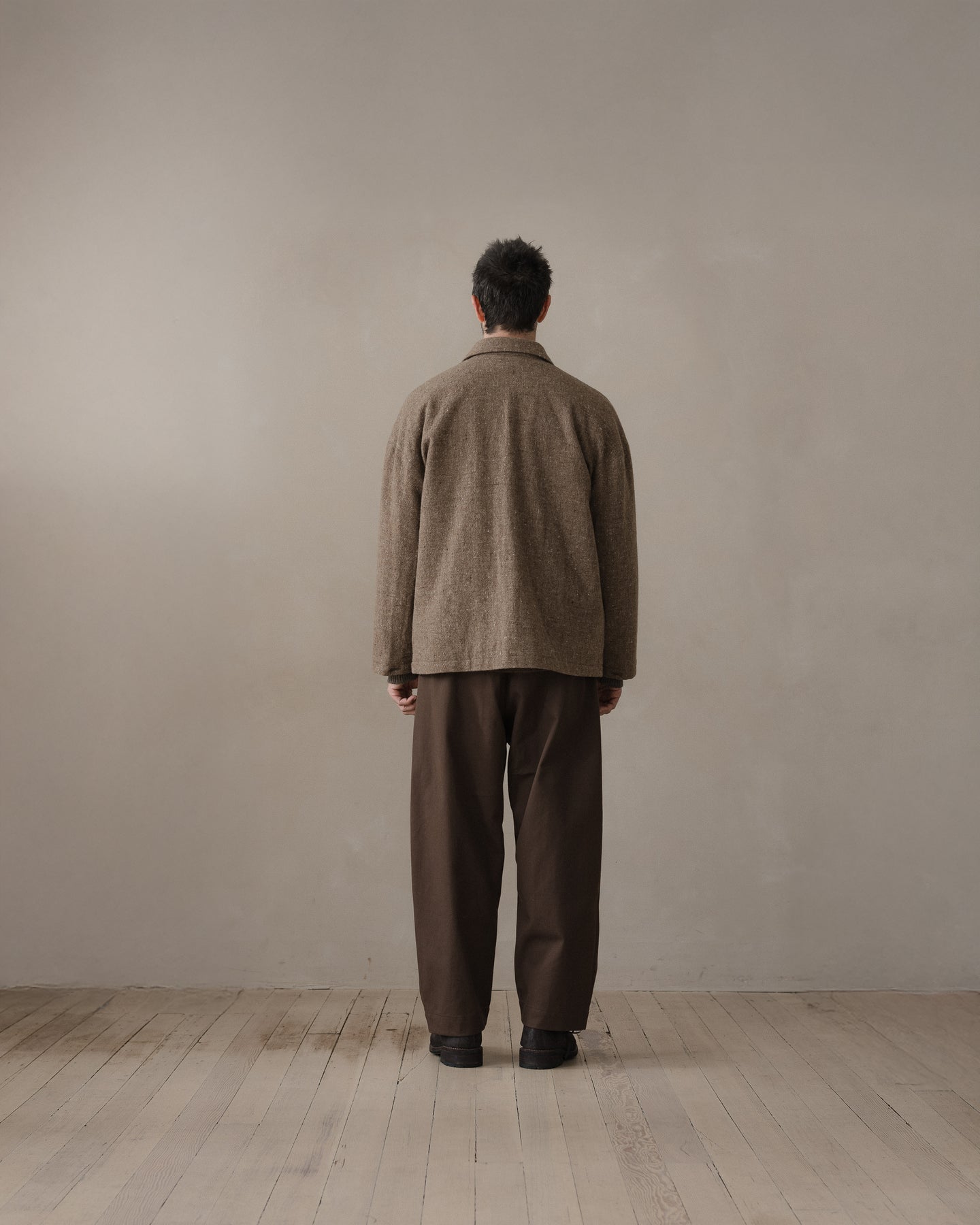 This soft, lofty and unstructured woolen cloth features undyed wool sourced from New Zealand. The yarn was spun in the tweed style, mixing in random occuring flecks of varying shades of undyed wool. The cloth was woven in Ichinomiya, Japan. This textured plain weave cloth was washed and tumbled to achieve a more raw feeling, natural finish before cutting into garments.
