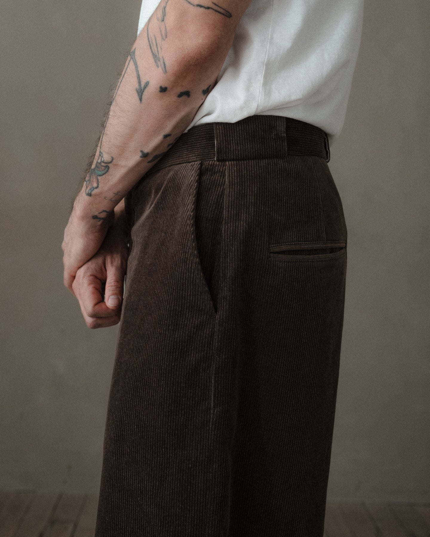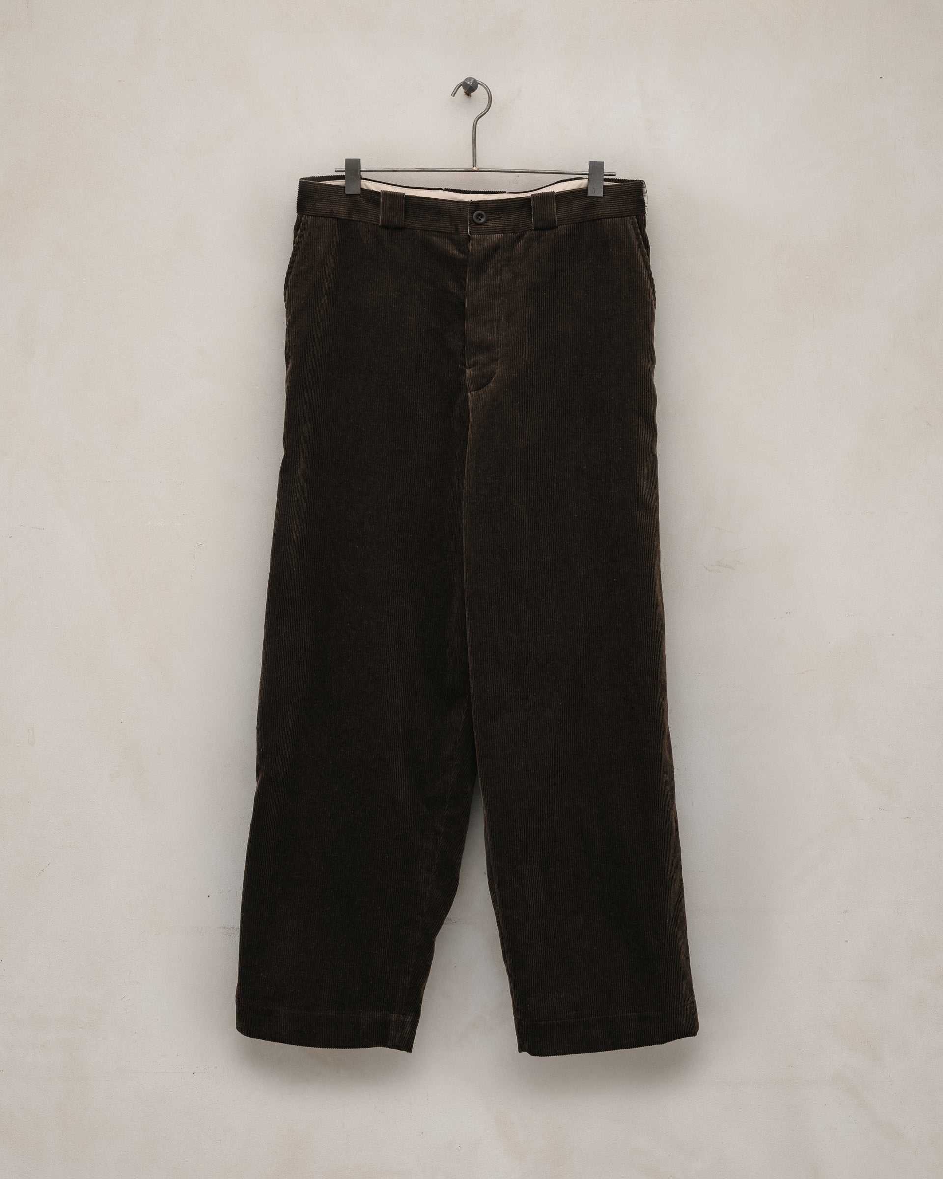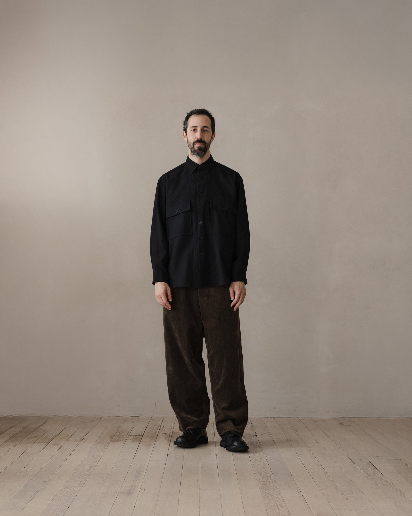 A medium weight corduroy blending cotton and linen to achieve a slightly dry hand and more irregular texture. Woven in Wakayama, Japan - this pile weave was then cut in Shizuoka by one of the last remaining corduroy cutters in all of Japan. The cloth was piece dyed using a blend of natural sumi ink and Oeko-Tex certified dye in Okayama. The dyeing process also contributes to the dry touch that will continue to soften overtime with repeated washing and wear.