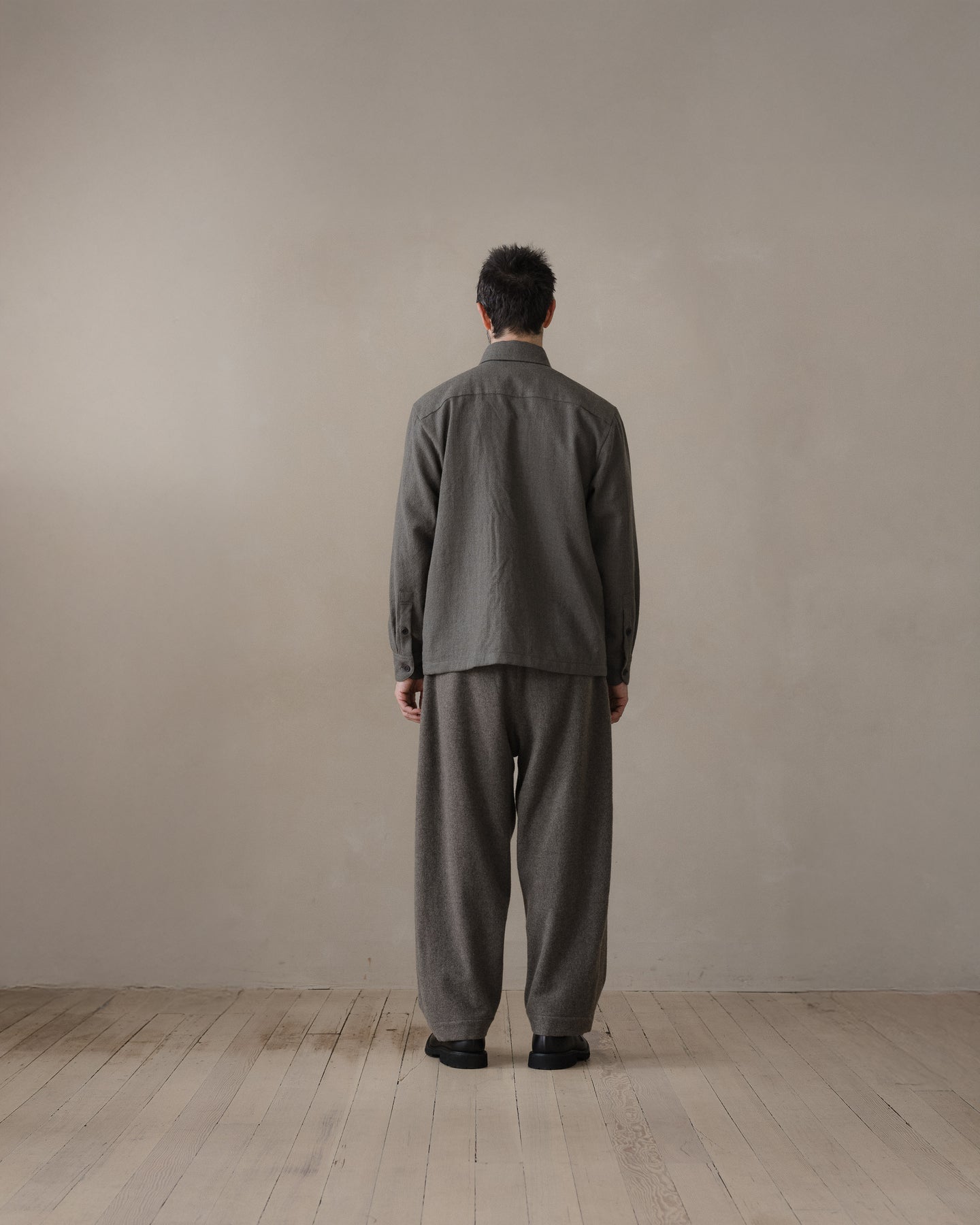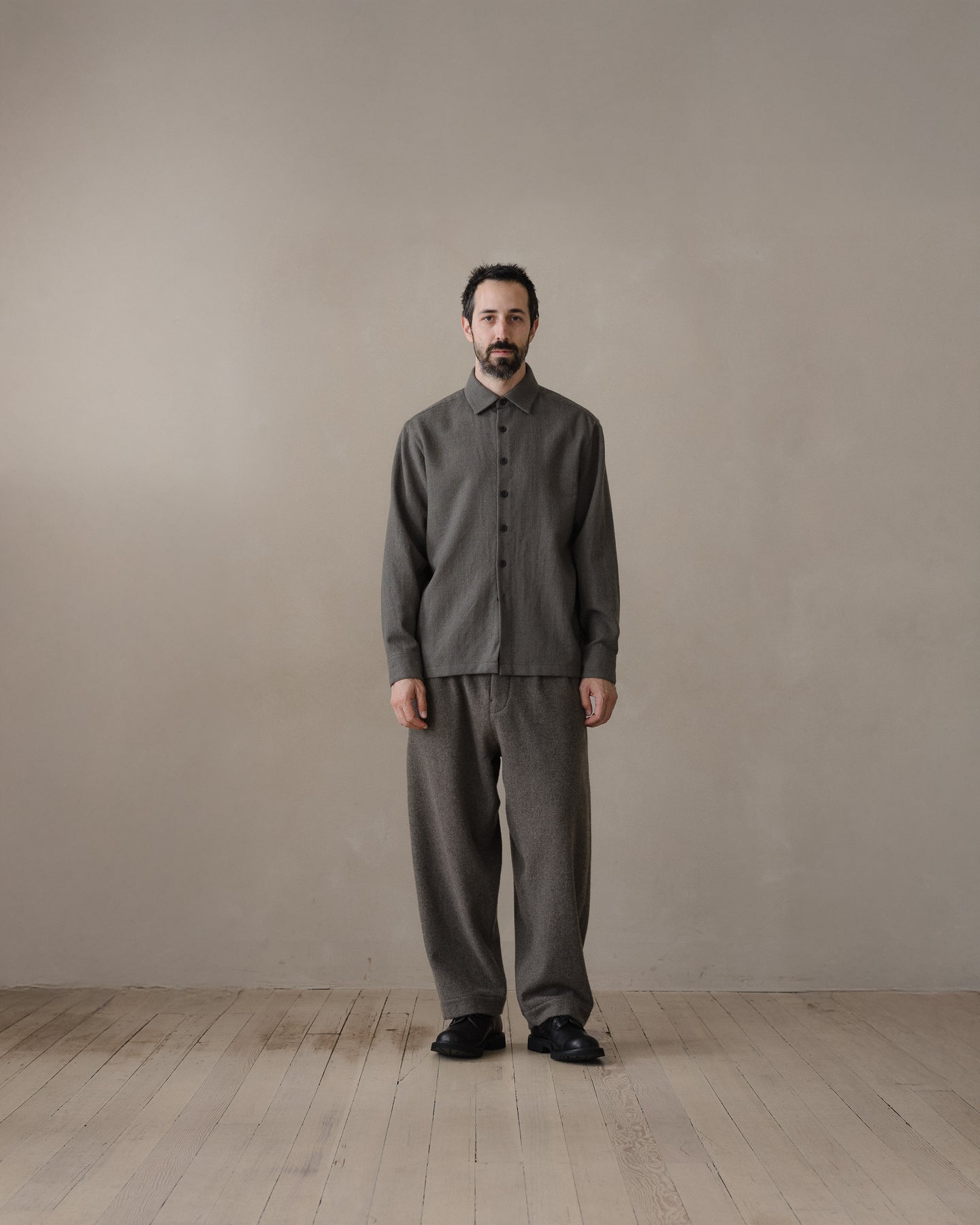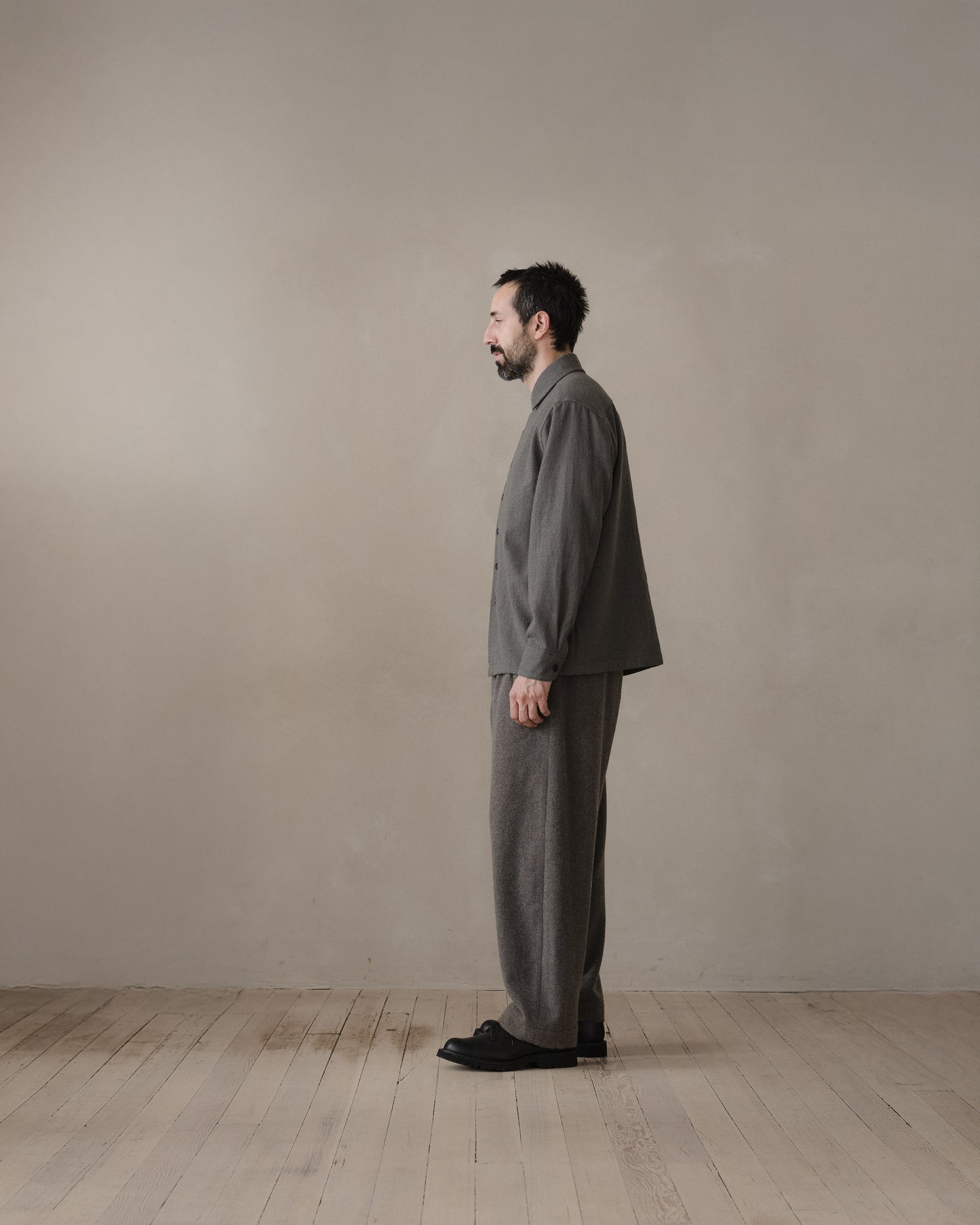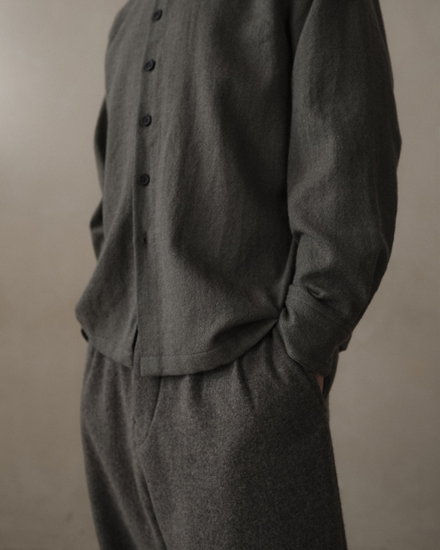 This worsted wool gauze cloth features a top-dyed yarn which results in a melange or heathered color. It was woven in Aichi Prefecture, Japan. It is soft and unstructured with a dry hand and excellent drape - making for a breathable, airy all wool shirting.