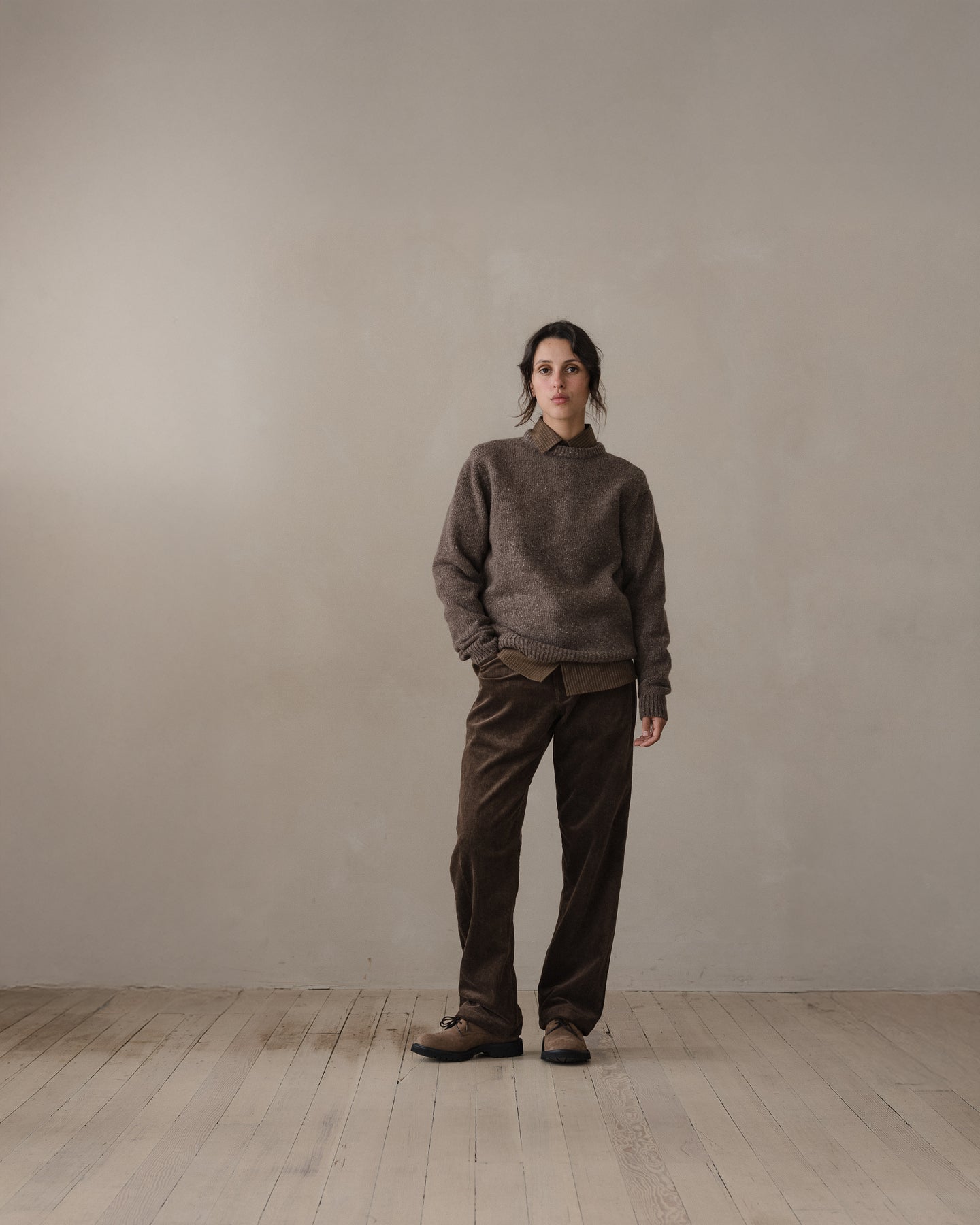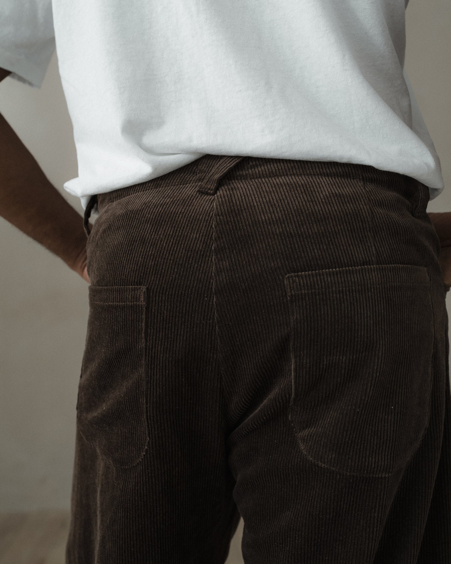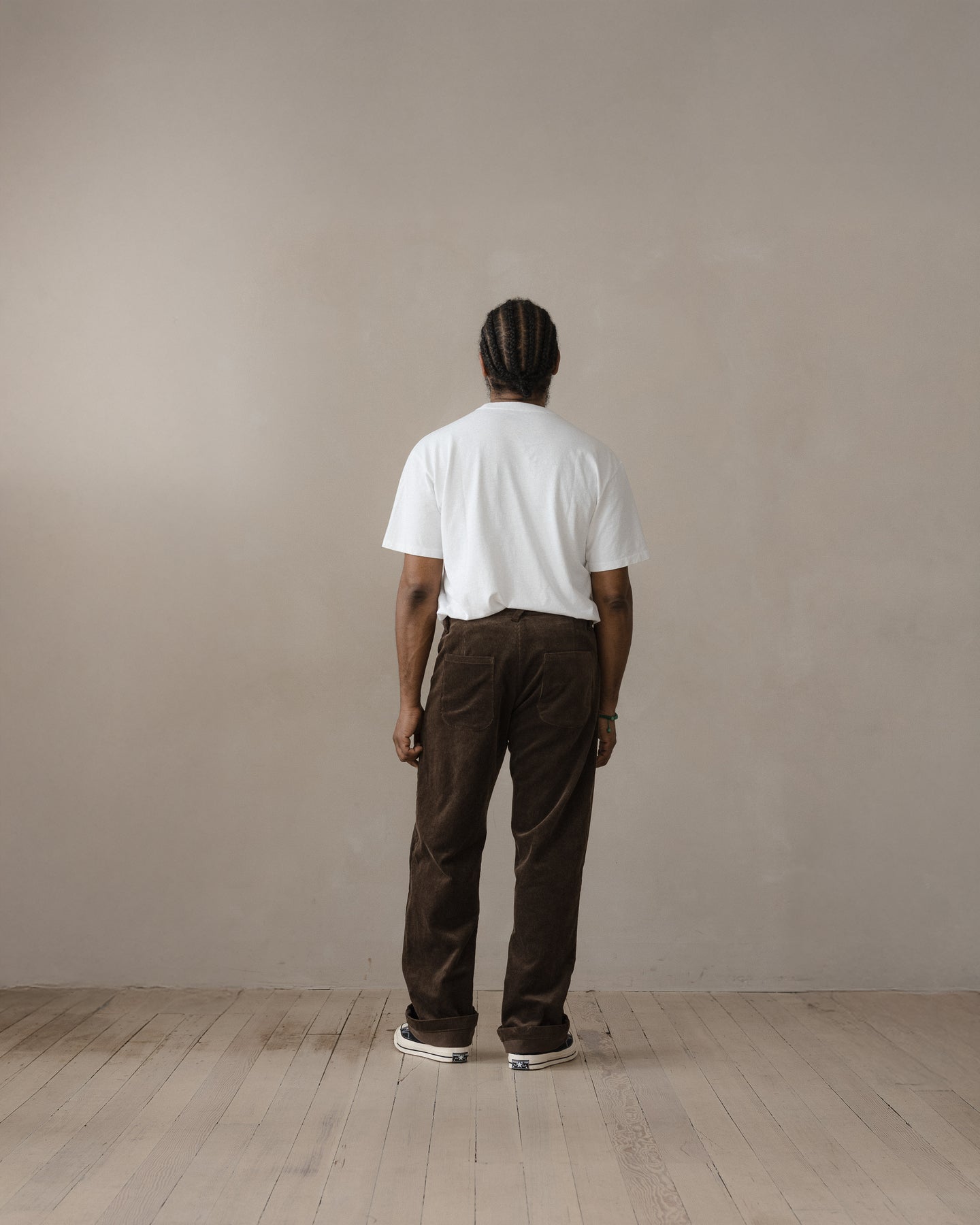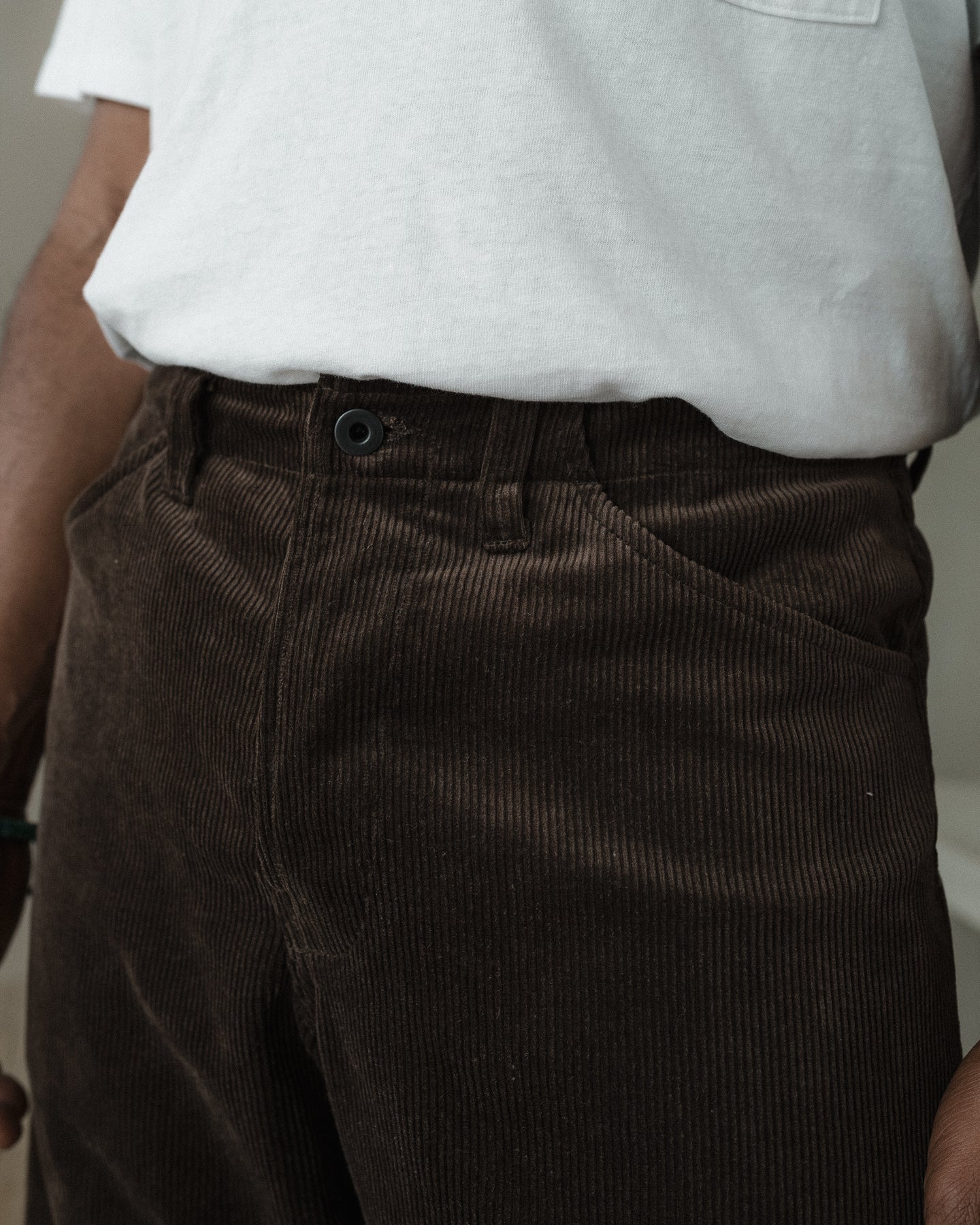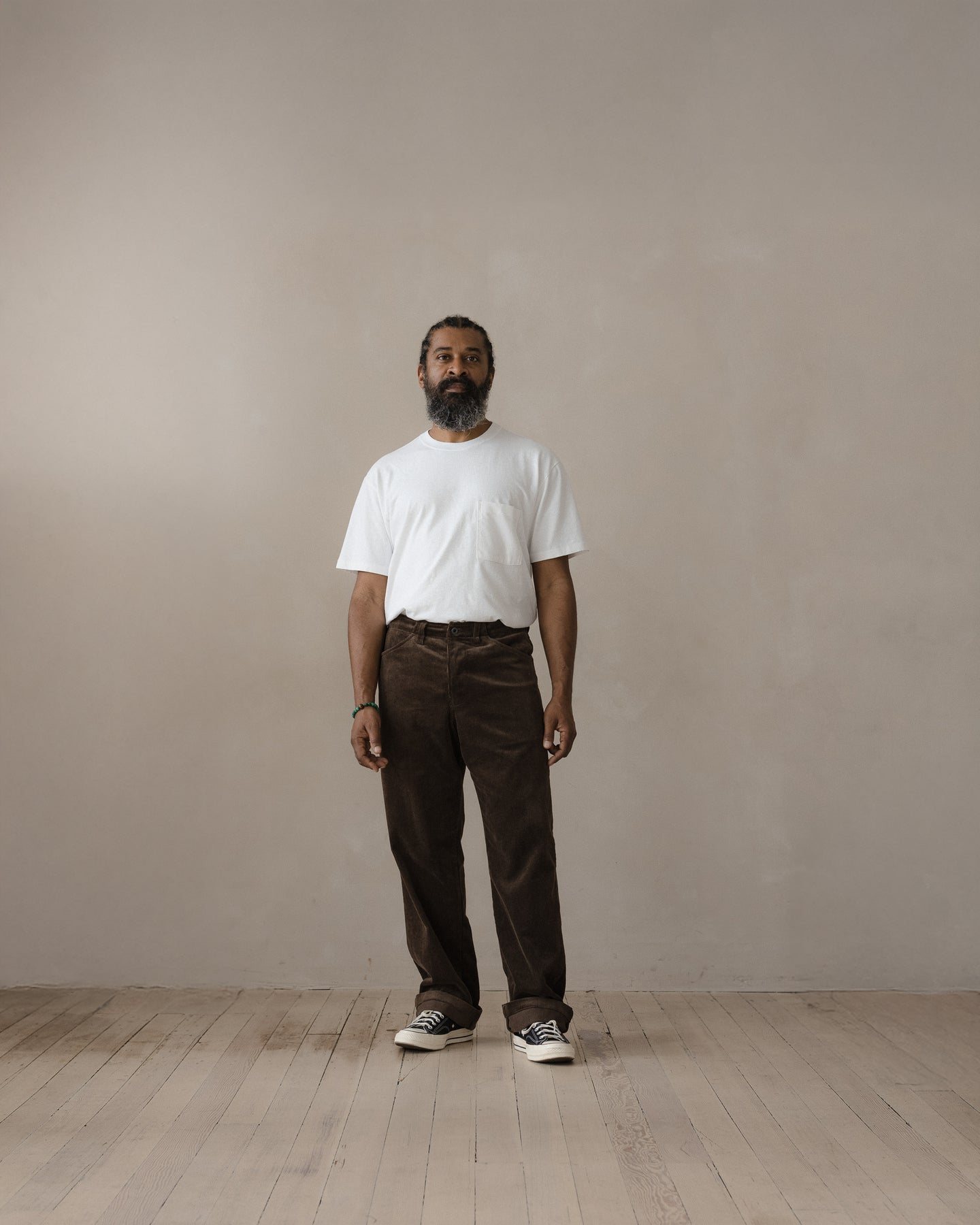 A ''regular'' fit pant, similar to a classic jean & our slimmest pant style. Featuring top entry front pockets with bar-tack reinforcement, U-shape back patch pockets, french seams, corduroy internal waistband facing, bound button-fly, wool washer backed YKK tack buttons, and clean finish single needle belt loops & single needle detailing throughout.
