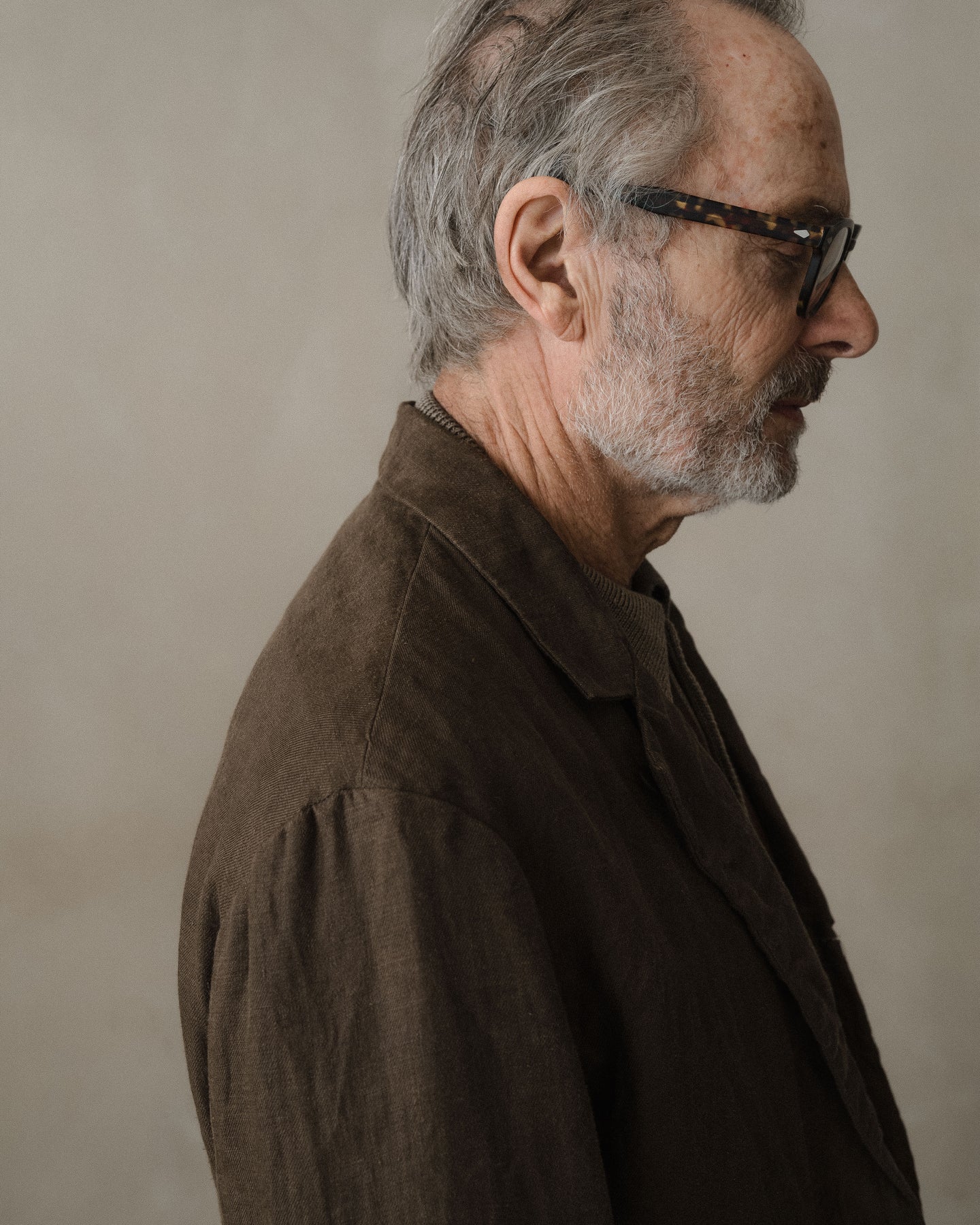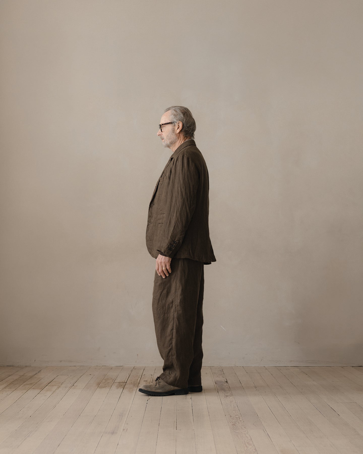 Soft and unstructured, this very lightweight all hemp twill weave, was overdyed twice - first with an Oekotex beige color for a warm base, then a second time in natural sumi ink for overtones of charcoal and the introduction of irregularity in saturation. Woven and dyed in Japan.