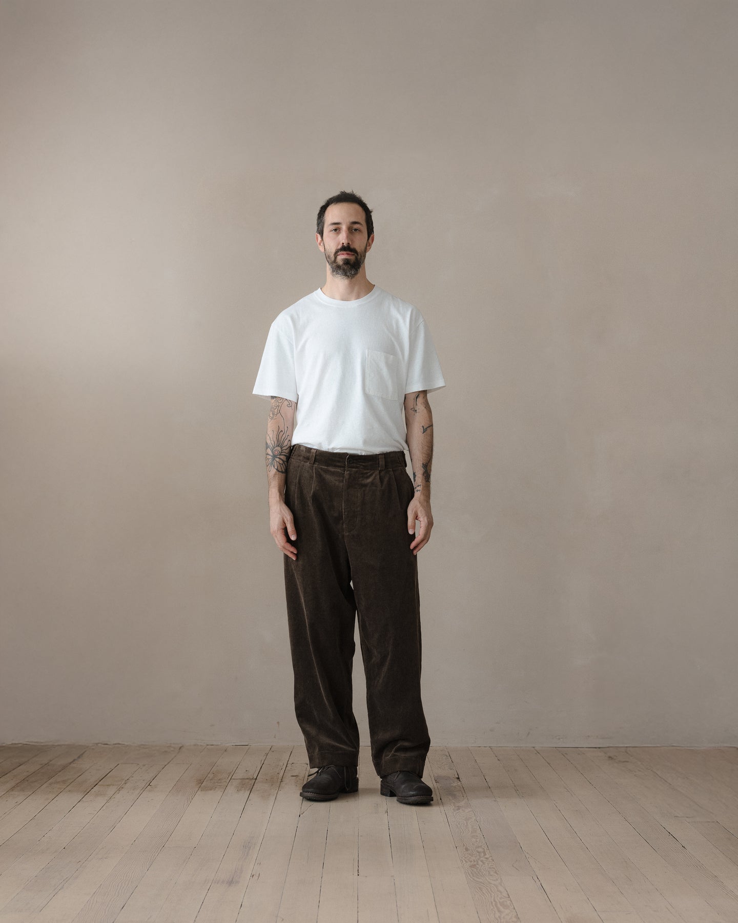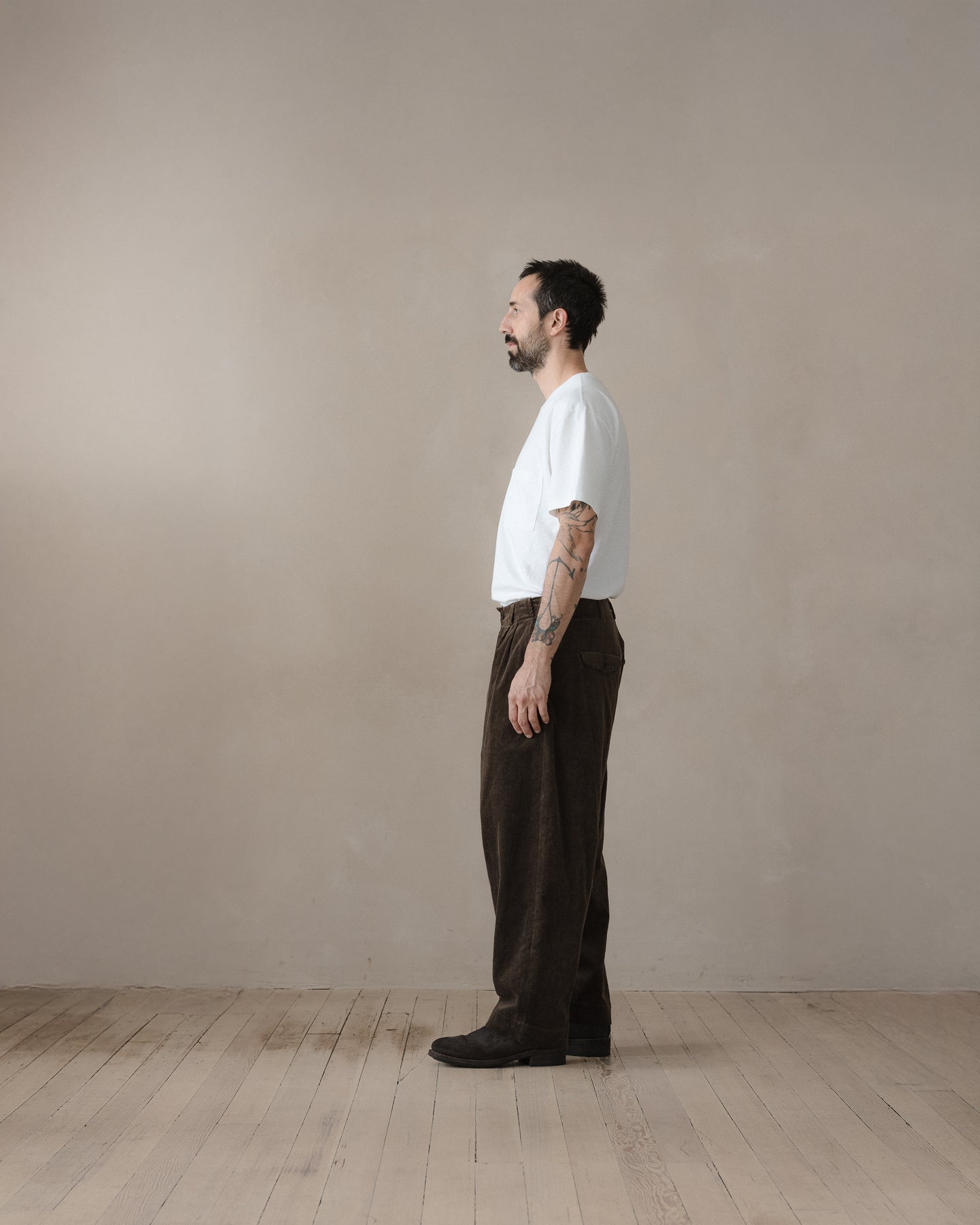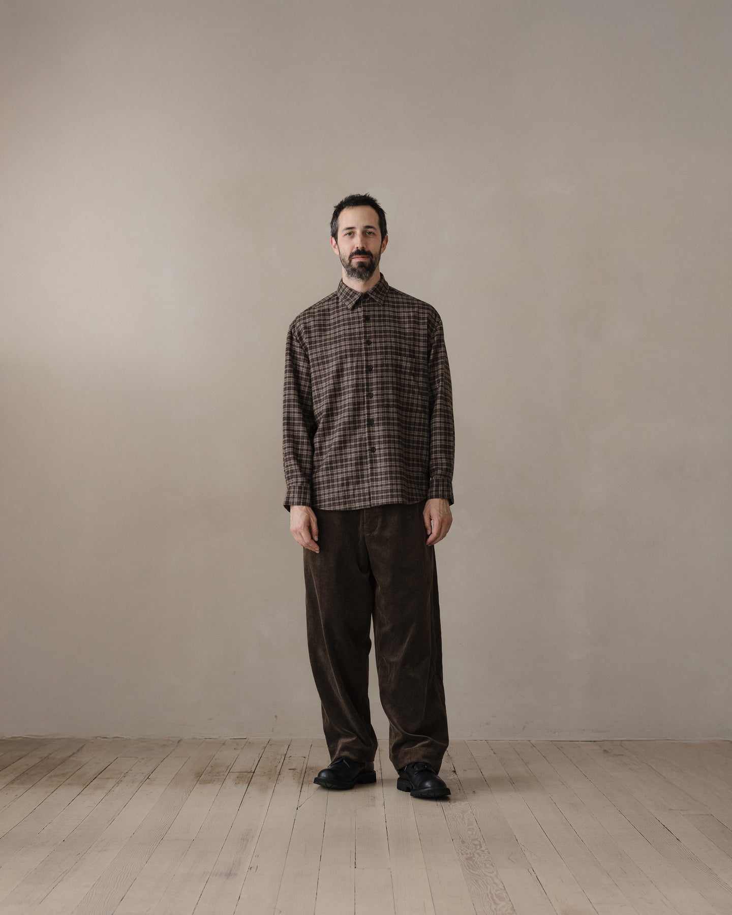 A medium weight corduroy blending cotton and linen to achieve a slightly dry hand and more irregular texture. Woven in Wakayama, Japan - this pile weave was then cut in Shizuoka by one of the last remaining corduroy cutters in all of Japan. The cloth was piece dyed using a blend of natural sumi ink and Oeko-Tex certified dye in Okayama. The dyeing process also contributes to the dry touch that will continue to soften overtime with repeated washing and wear.
