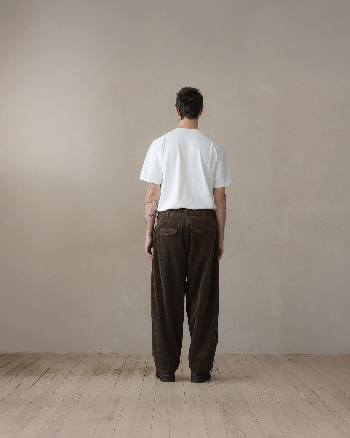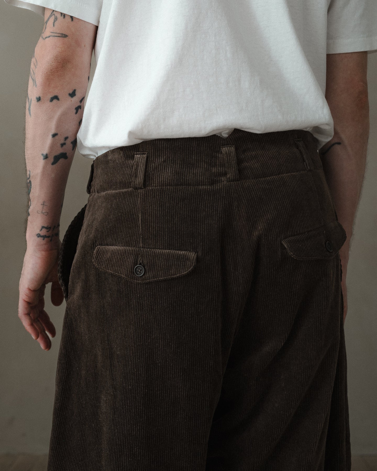 A loose and slightly tapered pant featuring slash front pockets, rear welt pockets with button through flap, ‘clean finish’ cotton bound seams throughout, corozo buttons, ‘hollywood’ split back waistband construction, bound button fly and single needle belt loops. The most generous fitting pant in the collection, but with a more tapered shape than the Elastic Pant.
