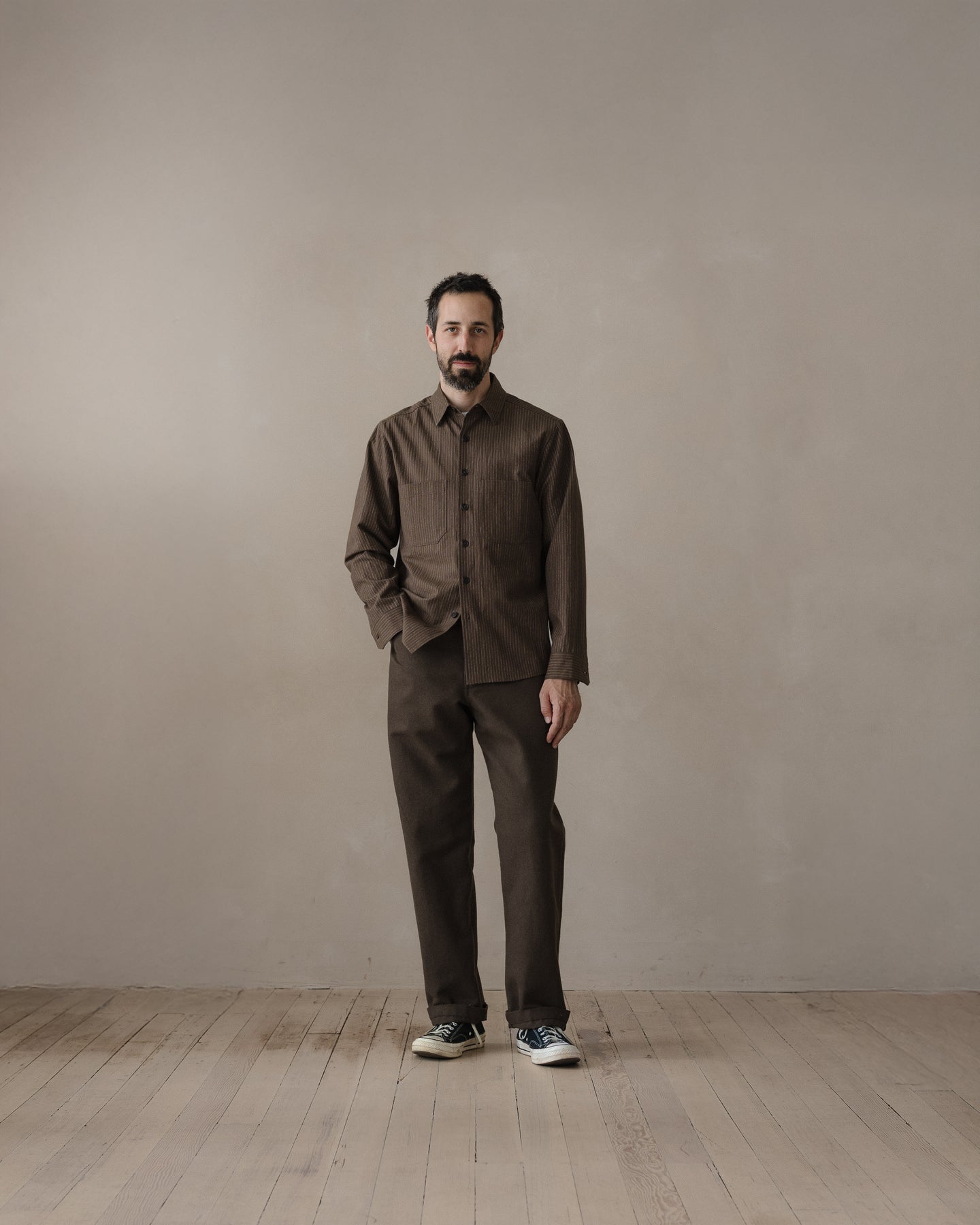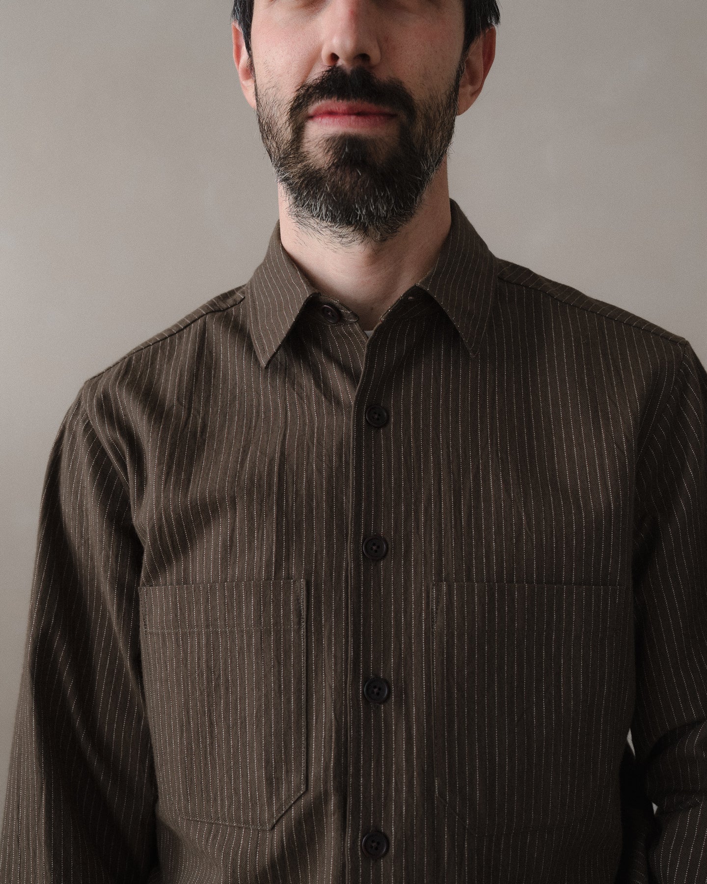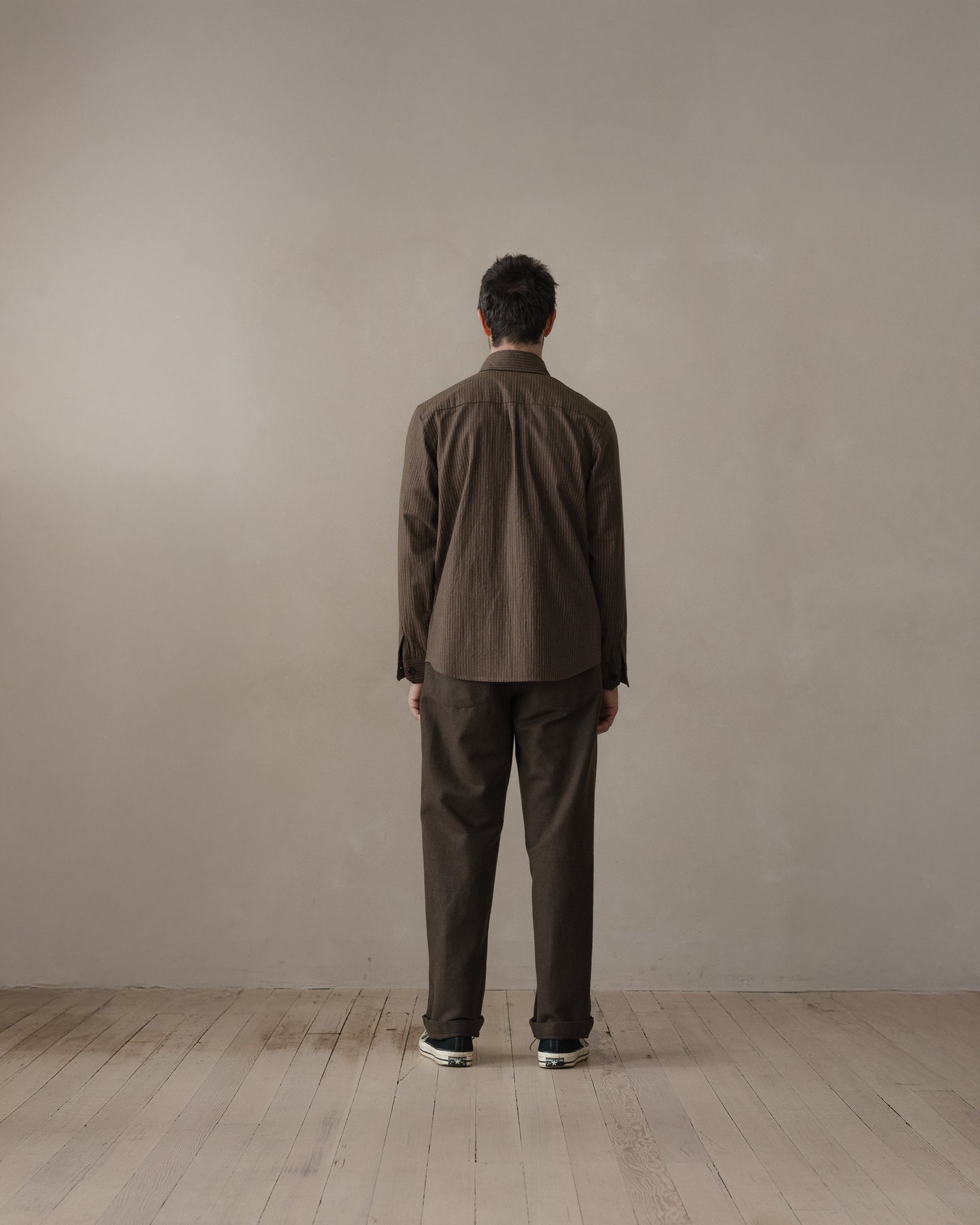 This subtly complex yarn dyed stripe cotton shirting was originally developed in the 1990's by a legendary textile designer based in Ichinomiya, Japan. I have been fortunate enough to visit his archive and was struck immediately when I first came across a small swatch of this cloth. A densely woven cotton twill with a crinkle wash finishing brings out the texture - while the thin stripes of natural & red bounce over the dark olive background. Woven in Ichinomiya, Japan.