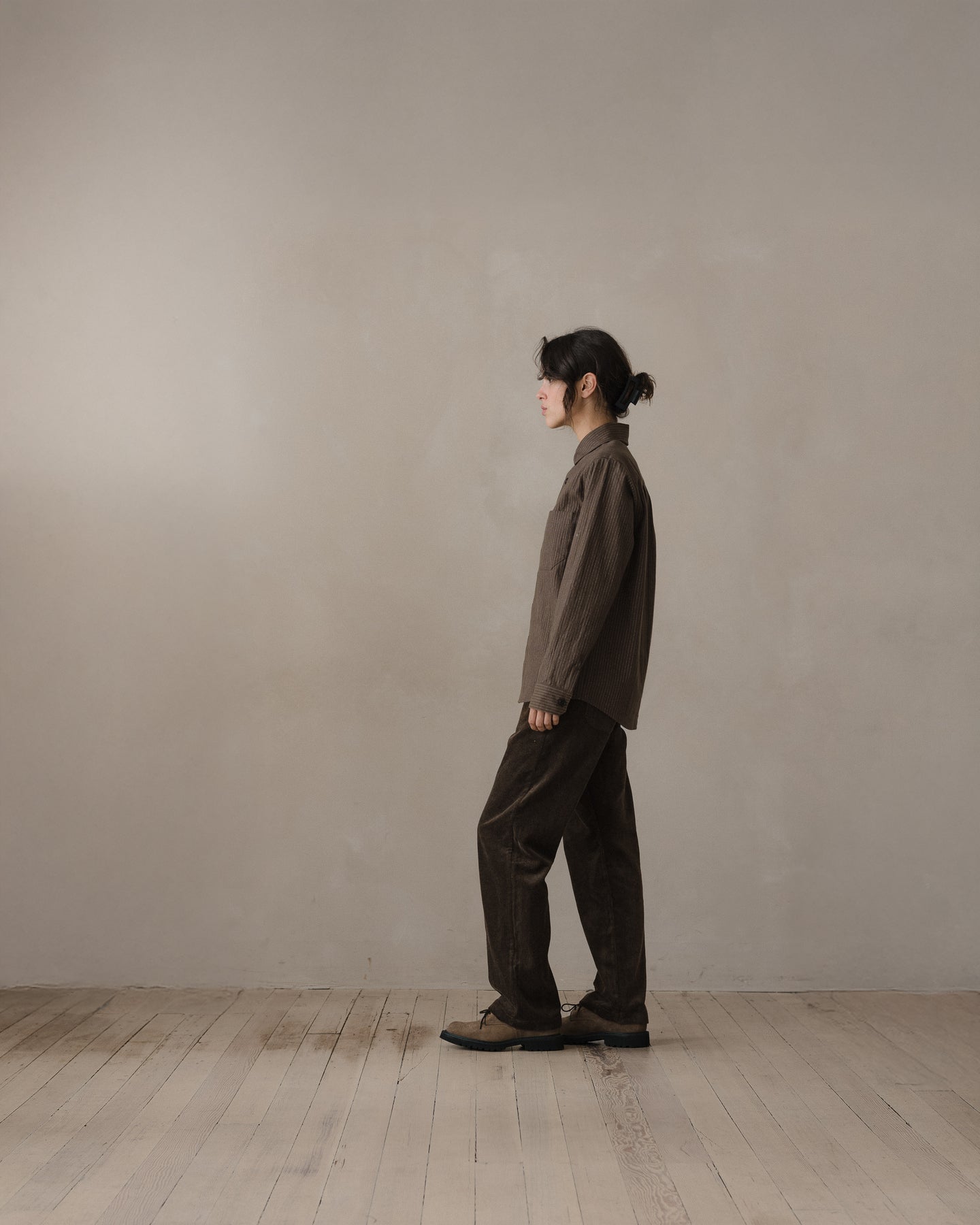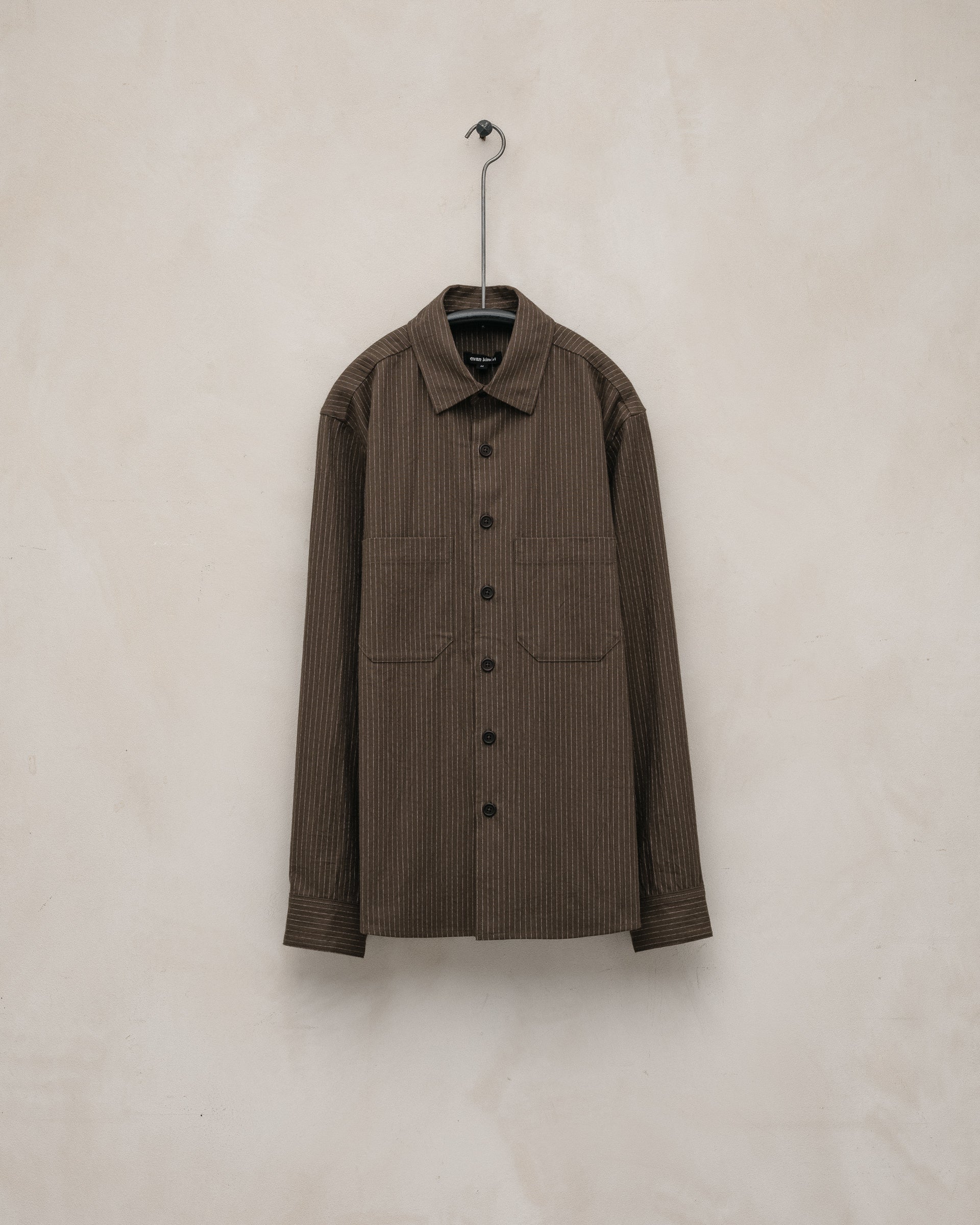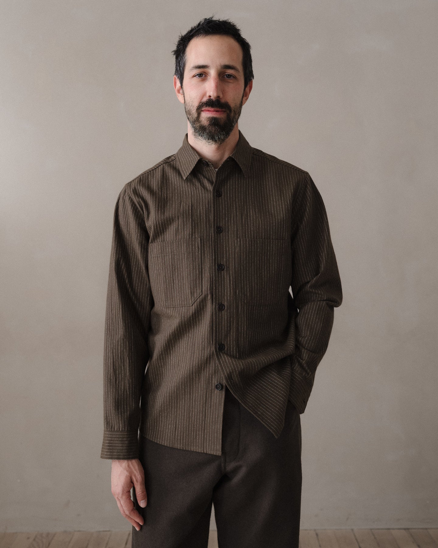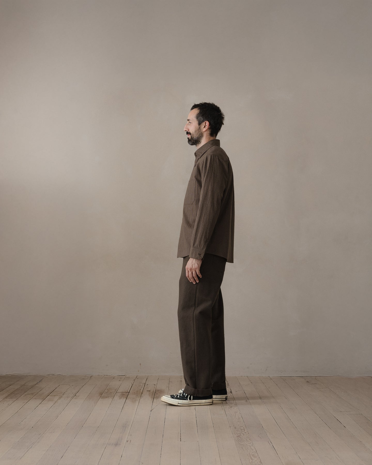 This subtly complex yarn dyed stripe cotton shirting was originally developed in the 1990's by a legendary textile designer based in Ichinomiya, Japan. I have been fortunate enough to visit his archive and was struck immediately when I first came across a small swatch of this cloth. A densely woven cotton twill with a crinkle wash finishing brings out the texture - while the thin stripes of natural & red bounce over the dark olive background. Woven in Ichinomiya, Japan.