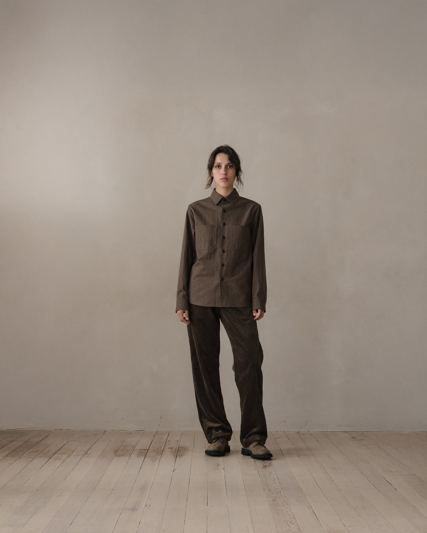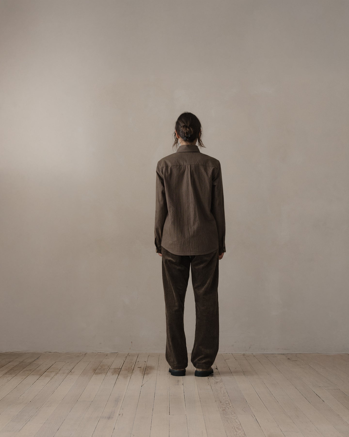A regular fit buttondown with two chest pockets, corozo buttons, french seams, mitered cuffs, pointed collar, subtly curved hem and 1/4" stitched placket edge.