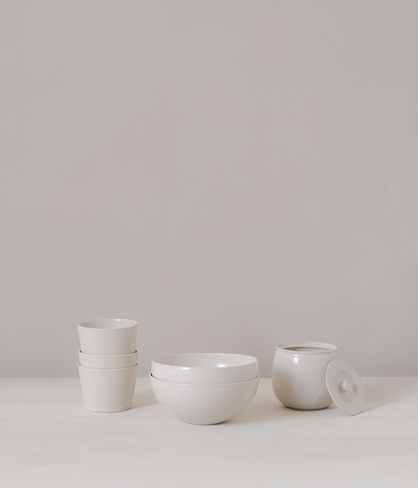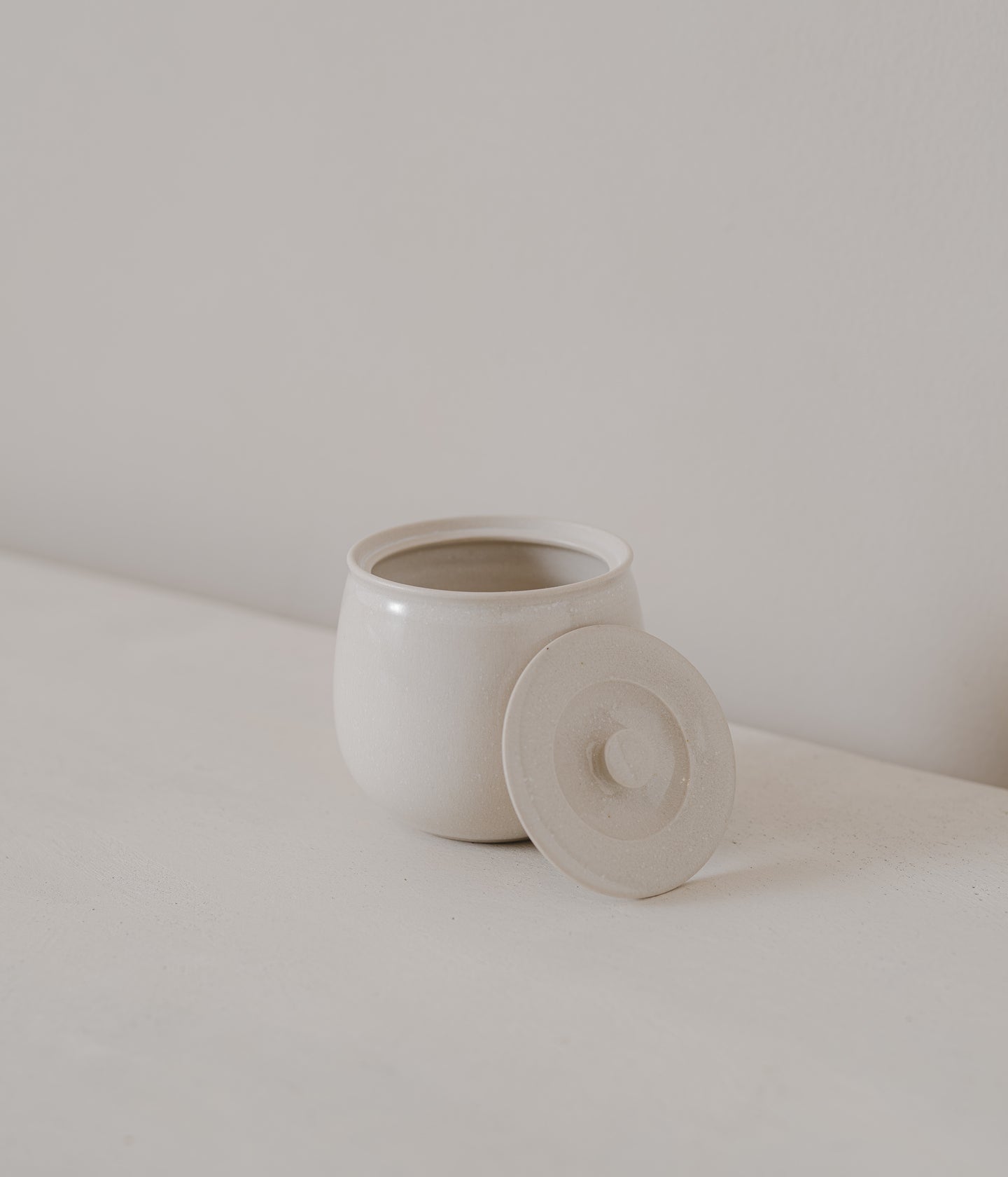 A lidded jar for salt or sugar in a smooth off-white colored glaze. Ito Kan was born into a potter's family, carrying on the craft of his father Hitoshi Tachibana, a renowned ceramic artist. Kan developed his own unique style and glaze techniques and established his own kiln in 2006 before settling in Okayama Prefecture in 2011.