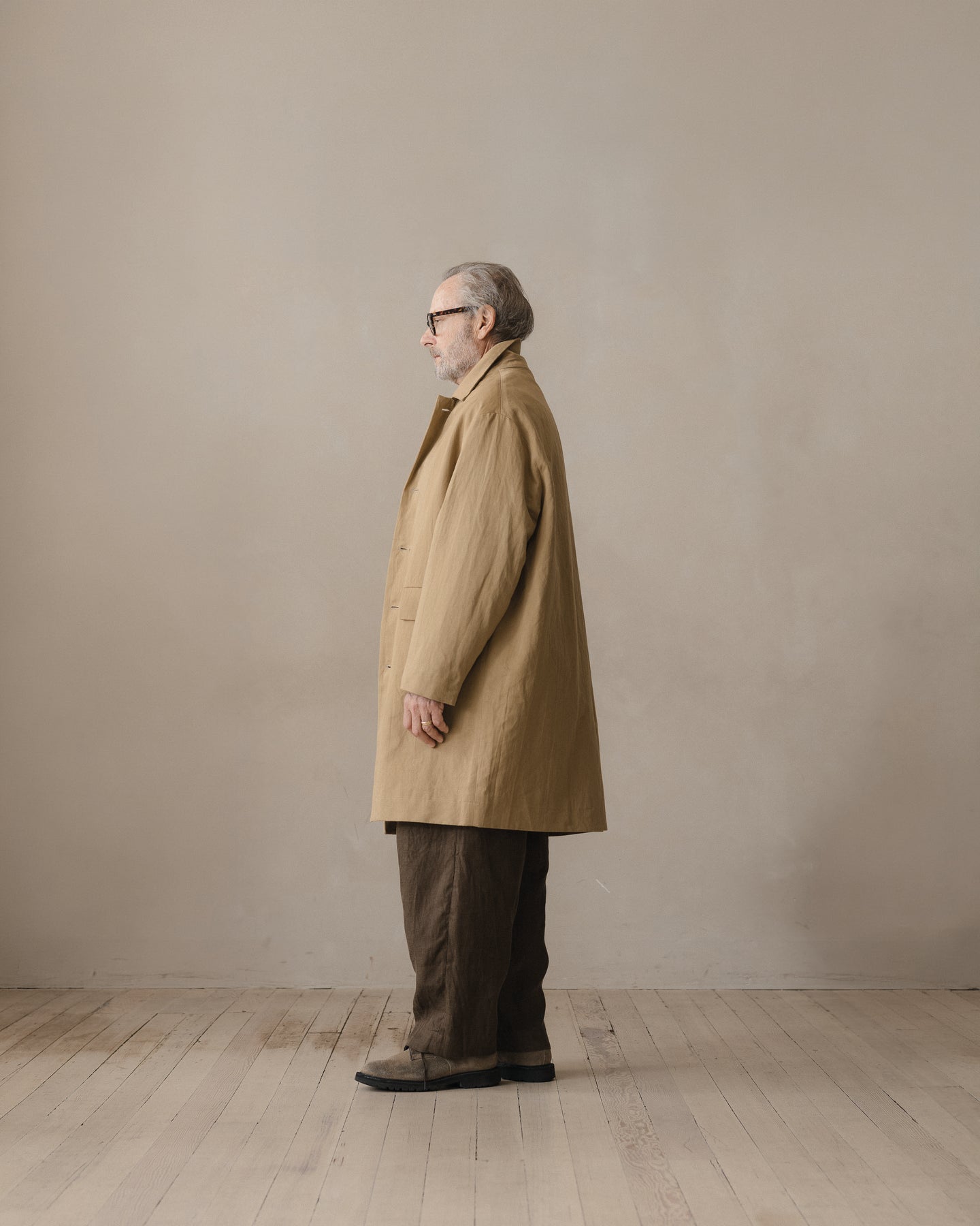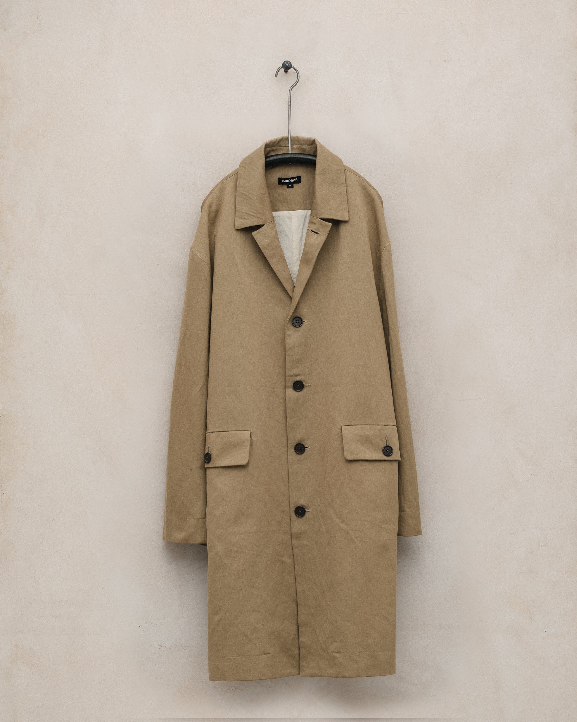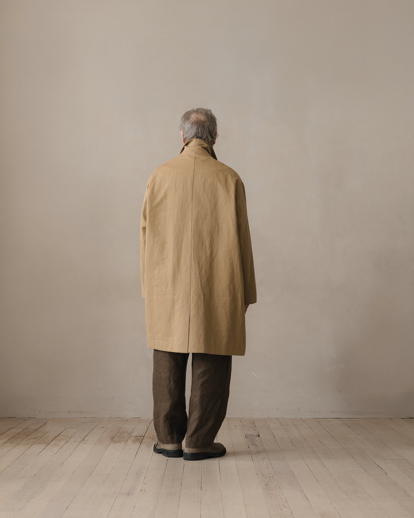 A simple walking coat with generous volume in the body and sleeves along with a dropped shoulder. Can be worn more formal with the lapel down or buttoned all the way up. The coat features button-through flap welt pockets, interior patch pockets and corozo buttons.
