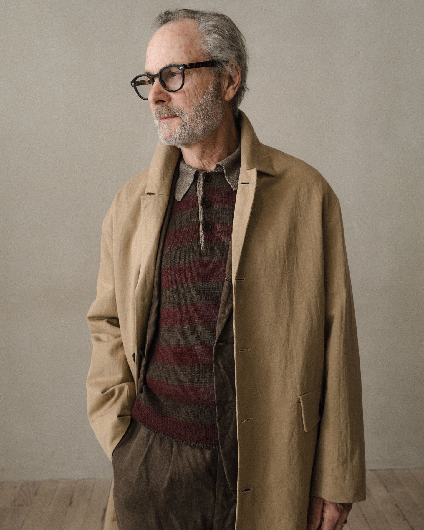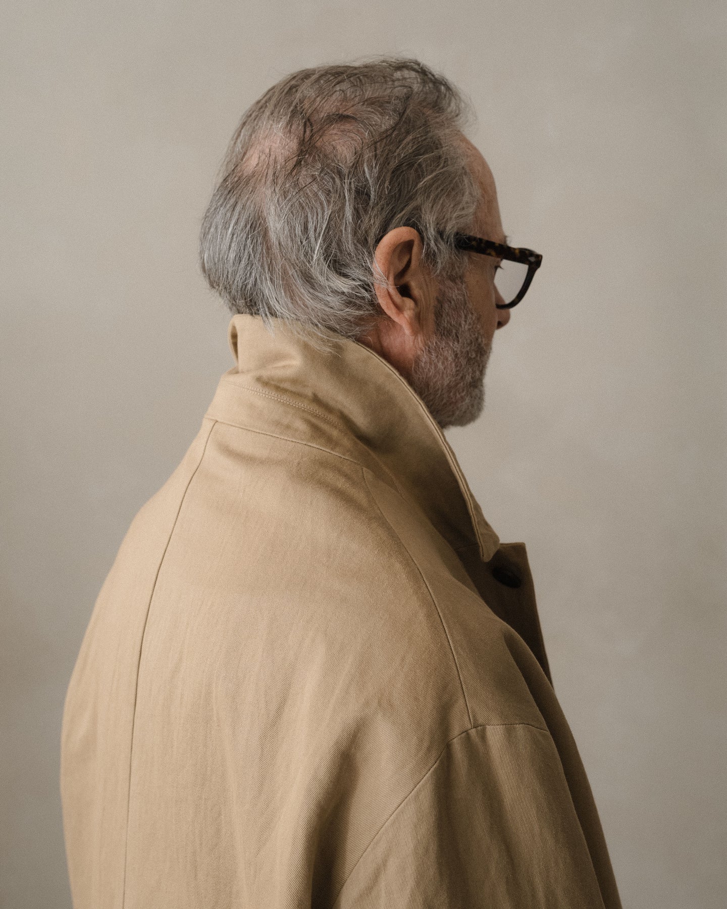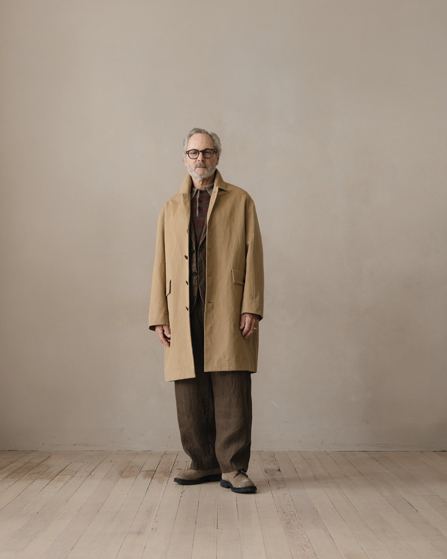 A simple walking coat with generous volume in the body and sleeves along with a dropped shoulder. Can be worn more formal with the lapel down or buttoned all the way up. The coat features button-through flap welt pockets, interior patch pockets and corozo buttons.