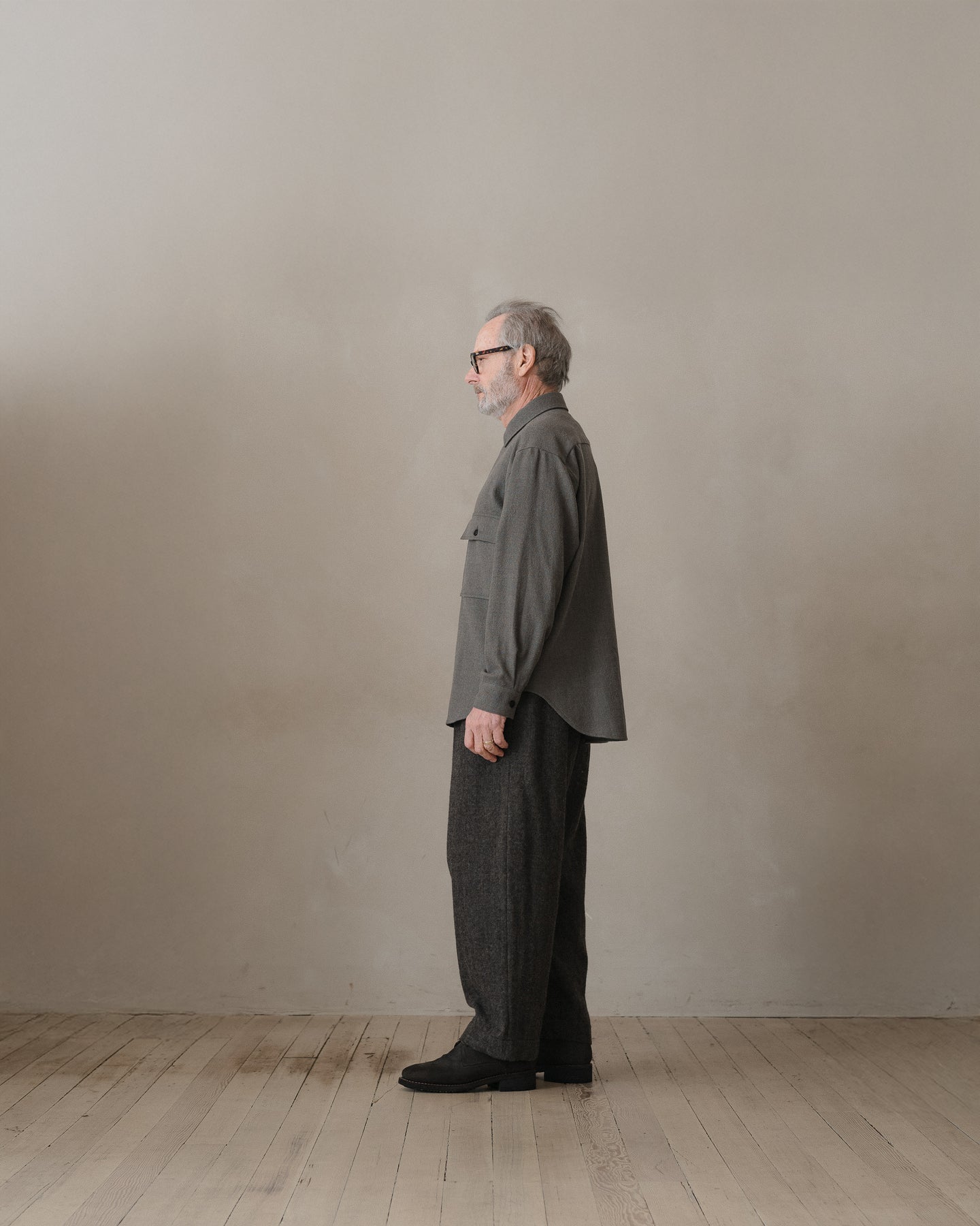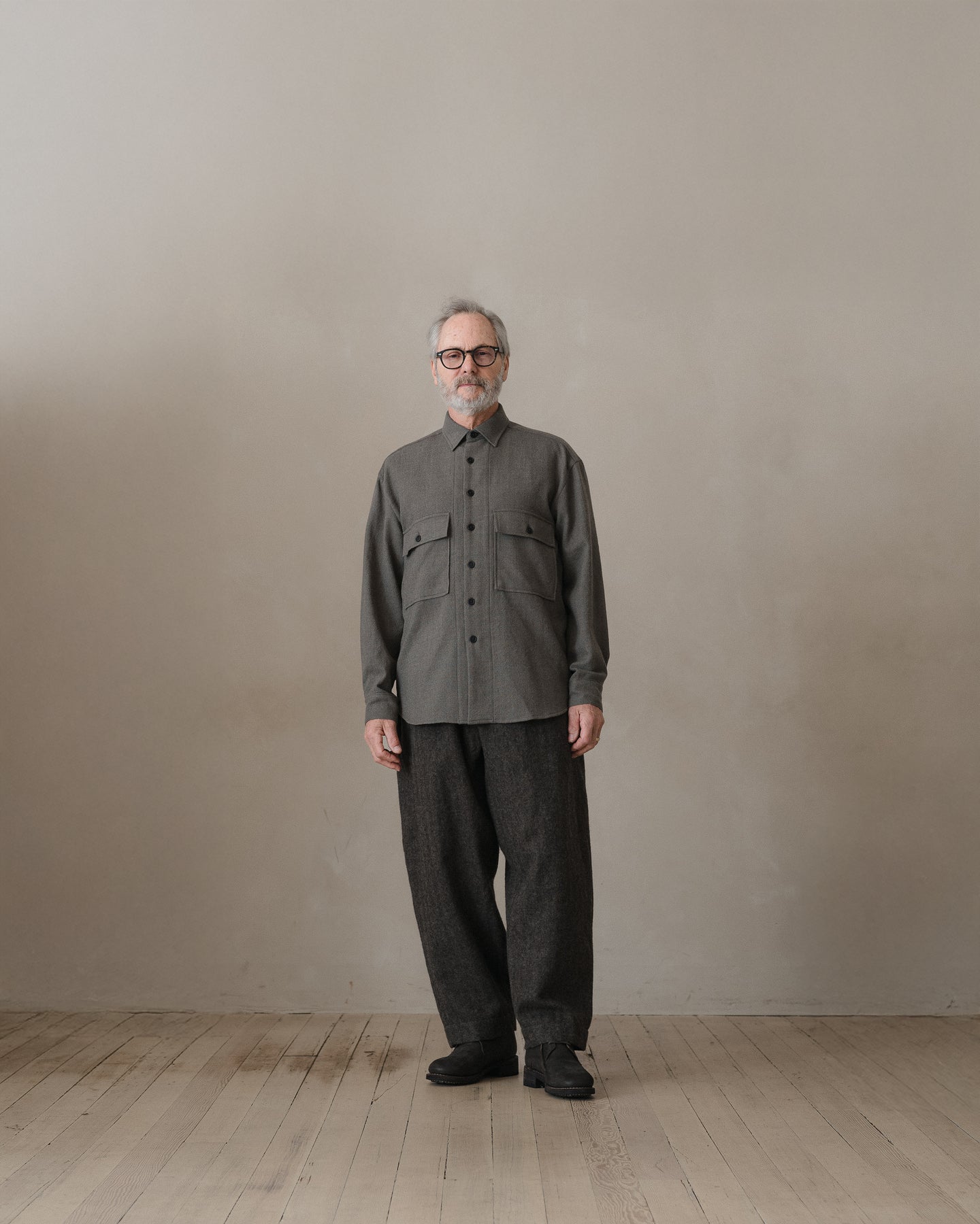 A looser fitting buttondown with single chest pocket, corozo buttons, french seams, squared cuffs, pointed collar, more pronounced curved hem and ‘invisible’ placket. This shirt is based on the same fit of the Big Shirt - cut more relaxed in the chest with a dropped shoulder and a slightly longer body compared to the Two Pocket Shirt.