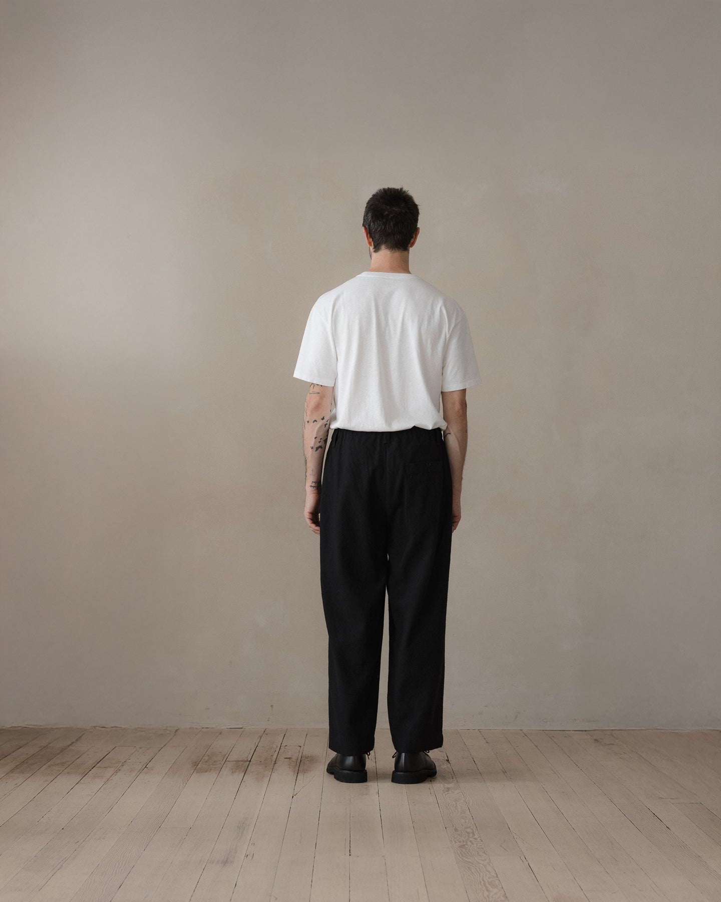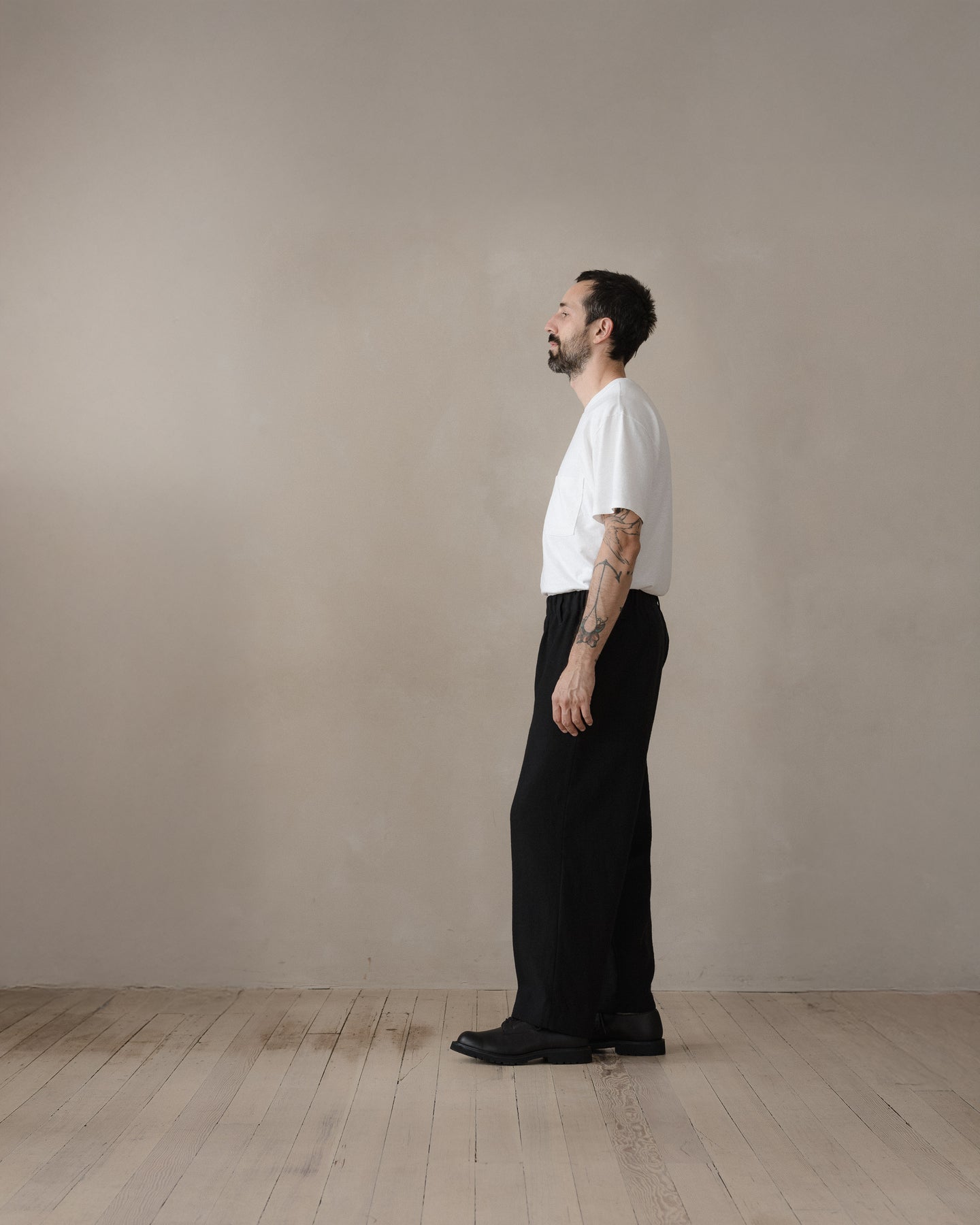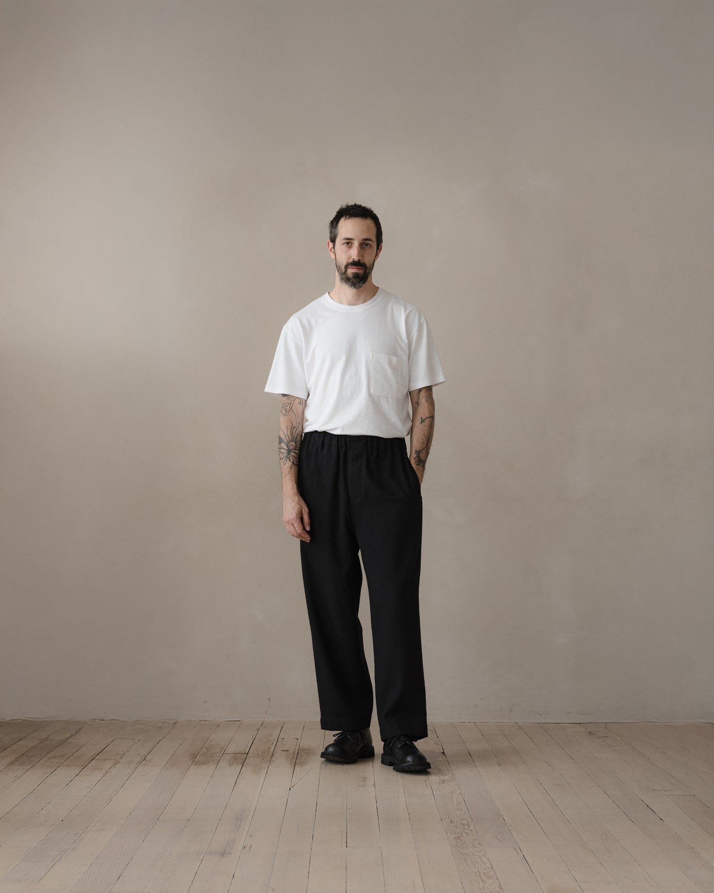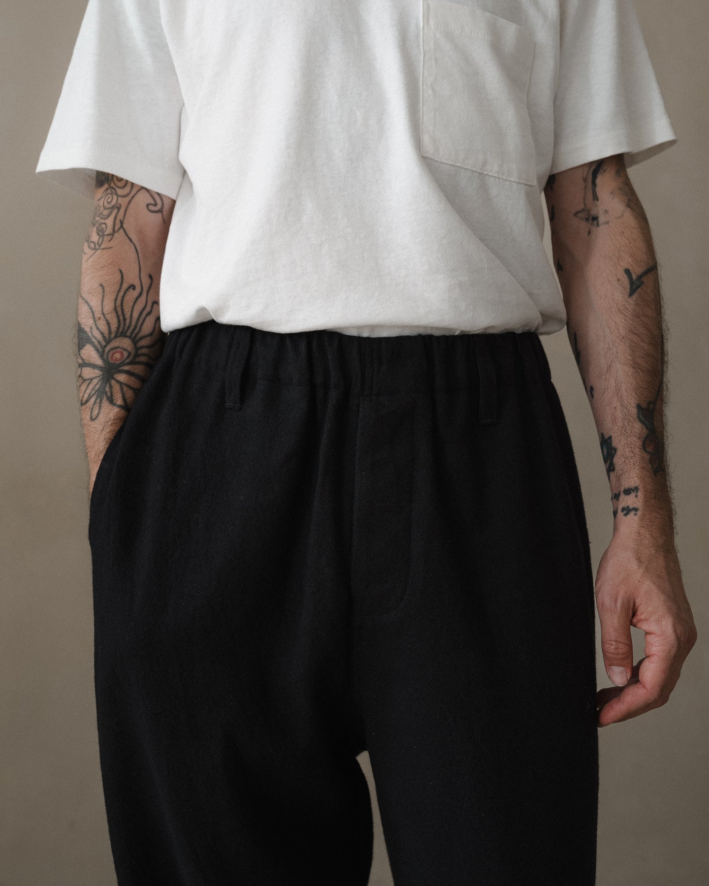 The Elastic Pant offers a wider leg in comparison with the more jean-like Four Pocket Pant, and the more tapered shape of the Single Pleat Pant.