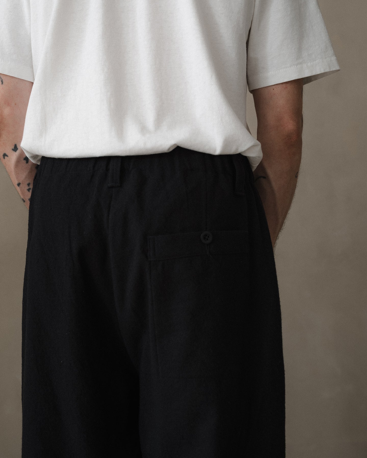 A wide, slightly cropped straight leg pant featuring an internal elastic waistband which allows for a relaxed fit in the seat and hip, on-seam front pockets, single ‘modified welt’ pocket on back right side, french seams, corozo buttons, clean finish button fly and single needle belt loops.