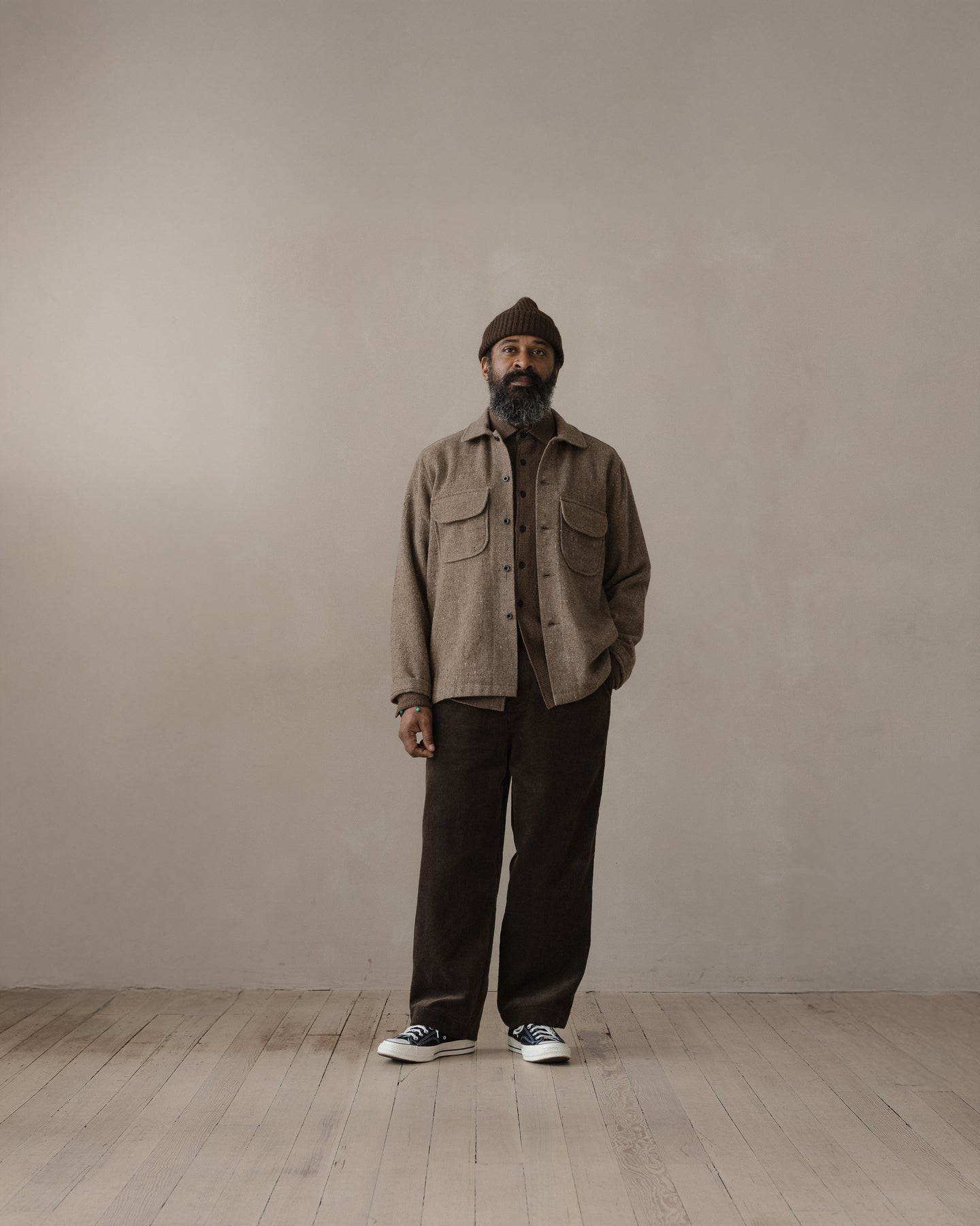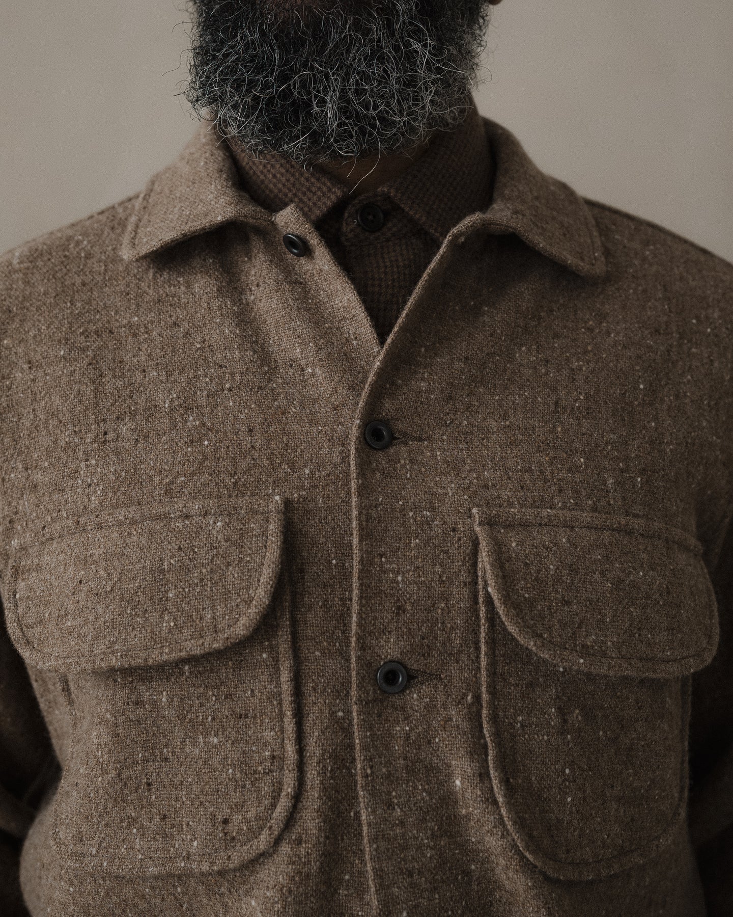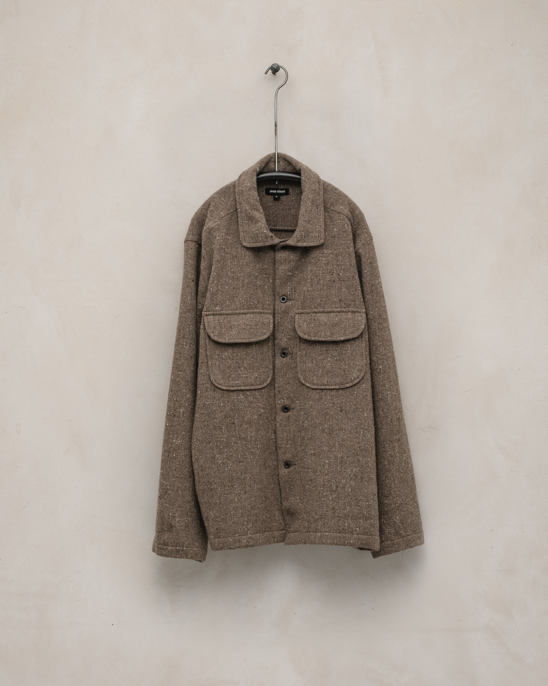 This soft, lofty and unstructured woolen cloth features undyed wool sourced from New Zealand. The yarn was spun in the tweed style, mixing in random occuring flecks of varying shades of undyed wool. The cloth was woven in Ichinomiya, Japan. This textured plain weave cloth was washed and tumbled to achieve a more raw feeling, natural finish before cutting into garments.