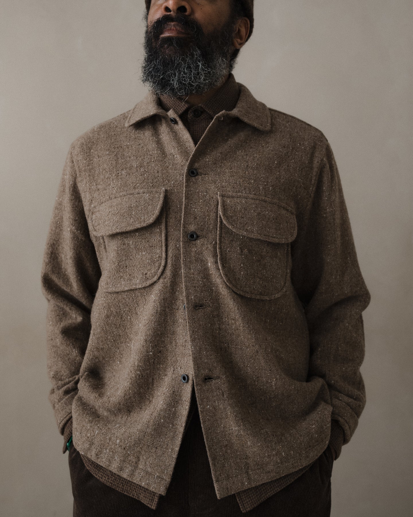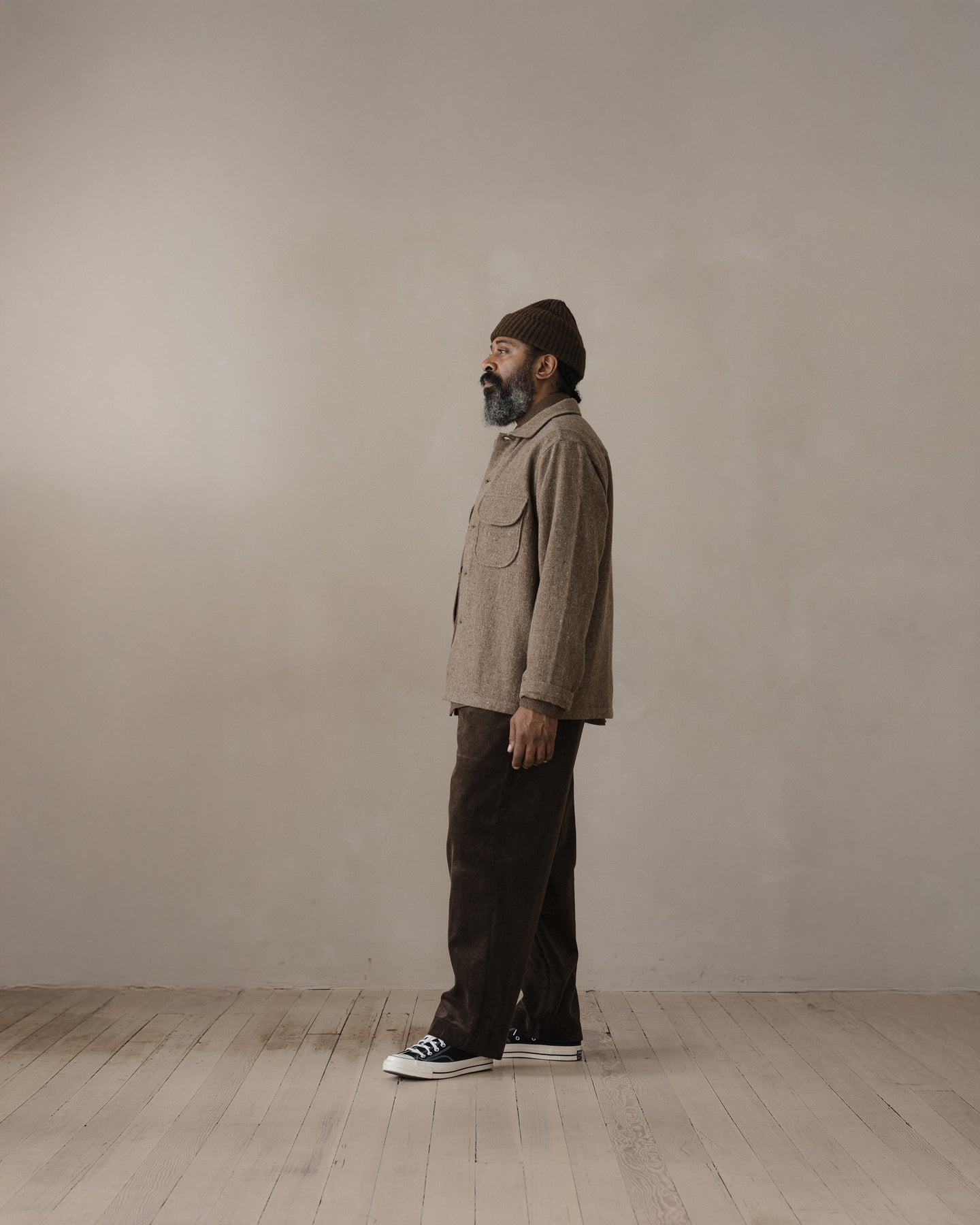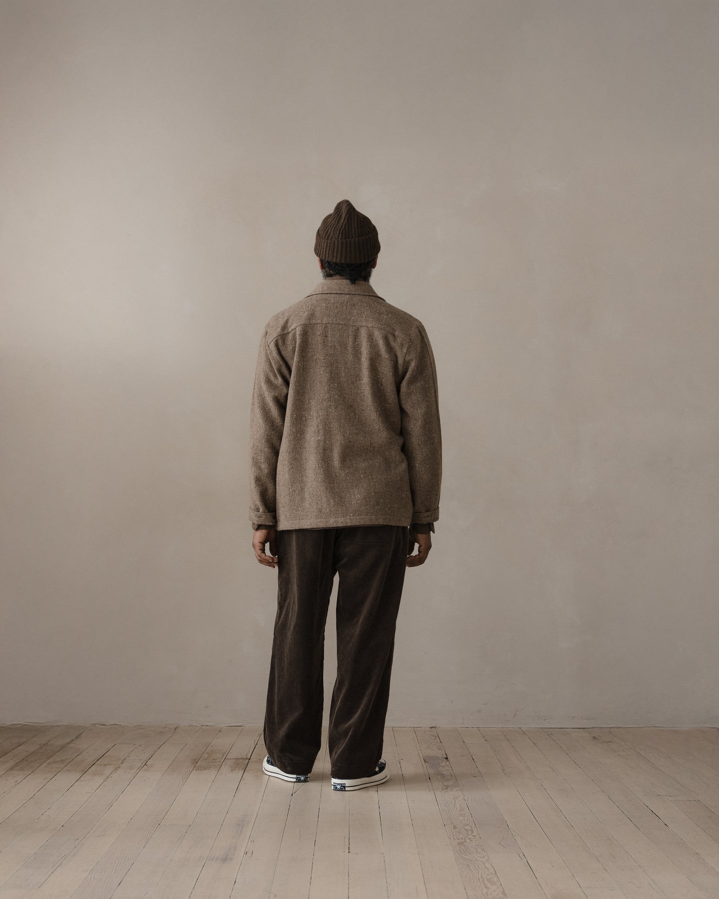 This soft, lofty and unstructured woolen cloth features undyed wool sourced from New Zealand. The yarn was spun in the tweed style, mixing in random occuring flecks of varying shades of undyed wool. The cloth was woven in Ichinomiya, Japan. This textured plain weave cloth was washed and tumbled to achieve a more raw feeling, natural finish before cutting into garments.