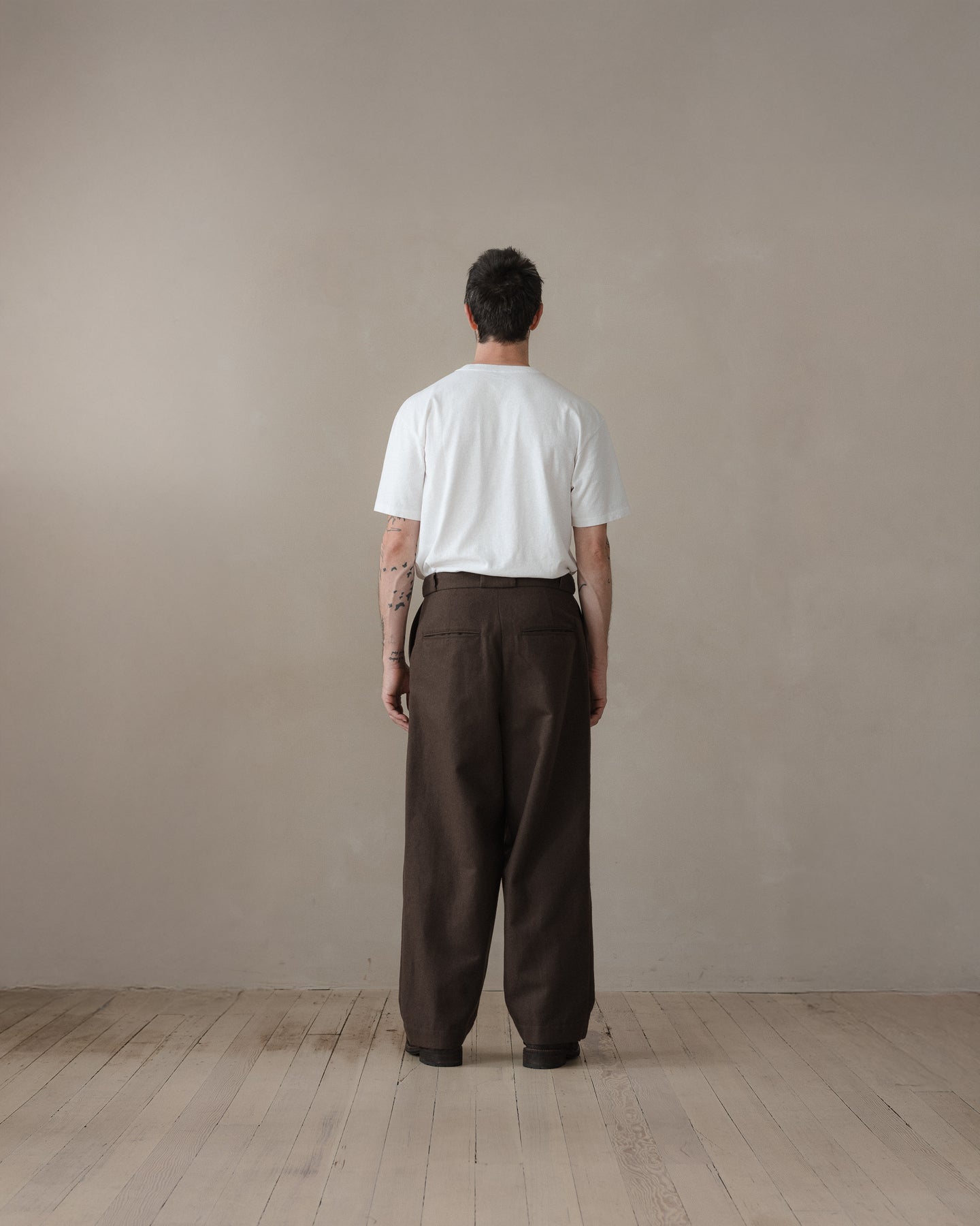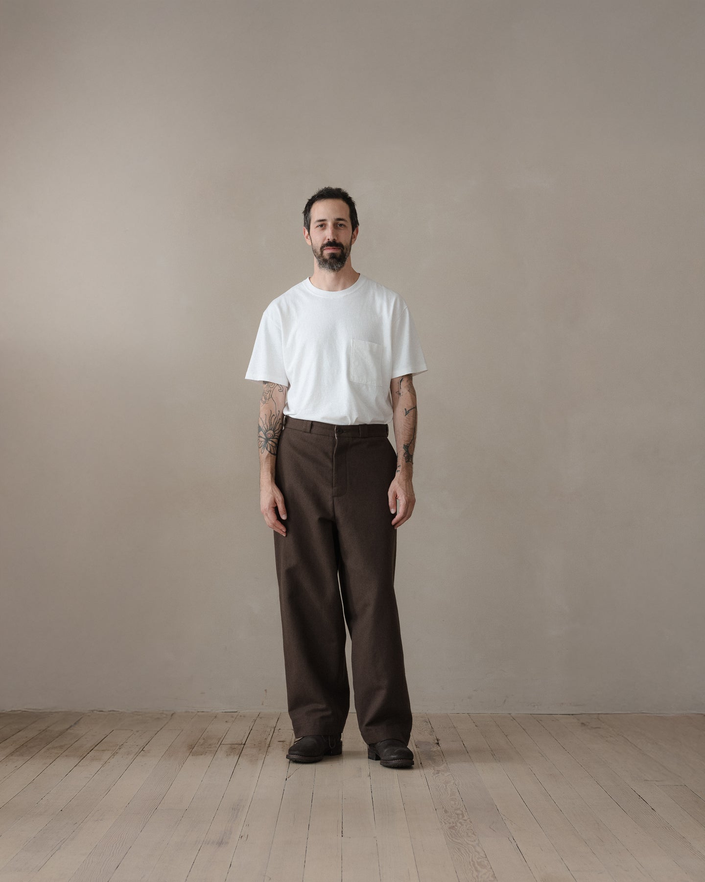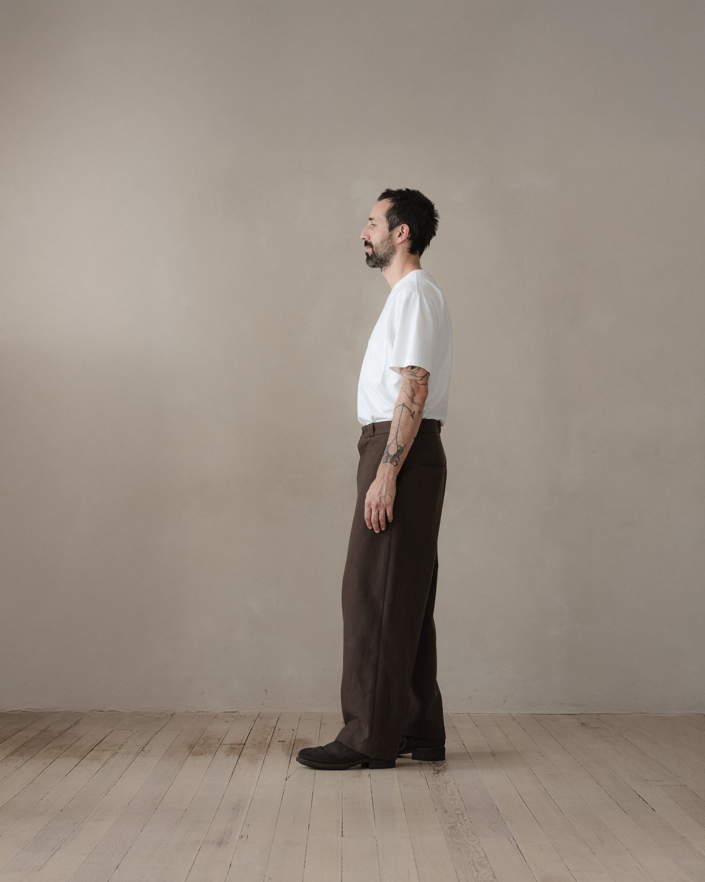 A higher rise, full leg pant that is similar to the Two Pleat Pant but with less taper at the hem and less volume in the waist. It has classic chino detailing like narrow jet welt pockets and slash front pockets along with a contrast waistband facing and tunnel beltloops.