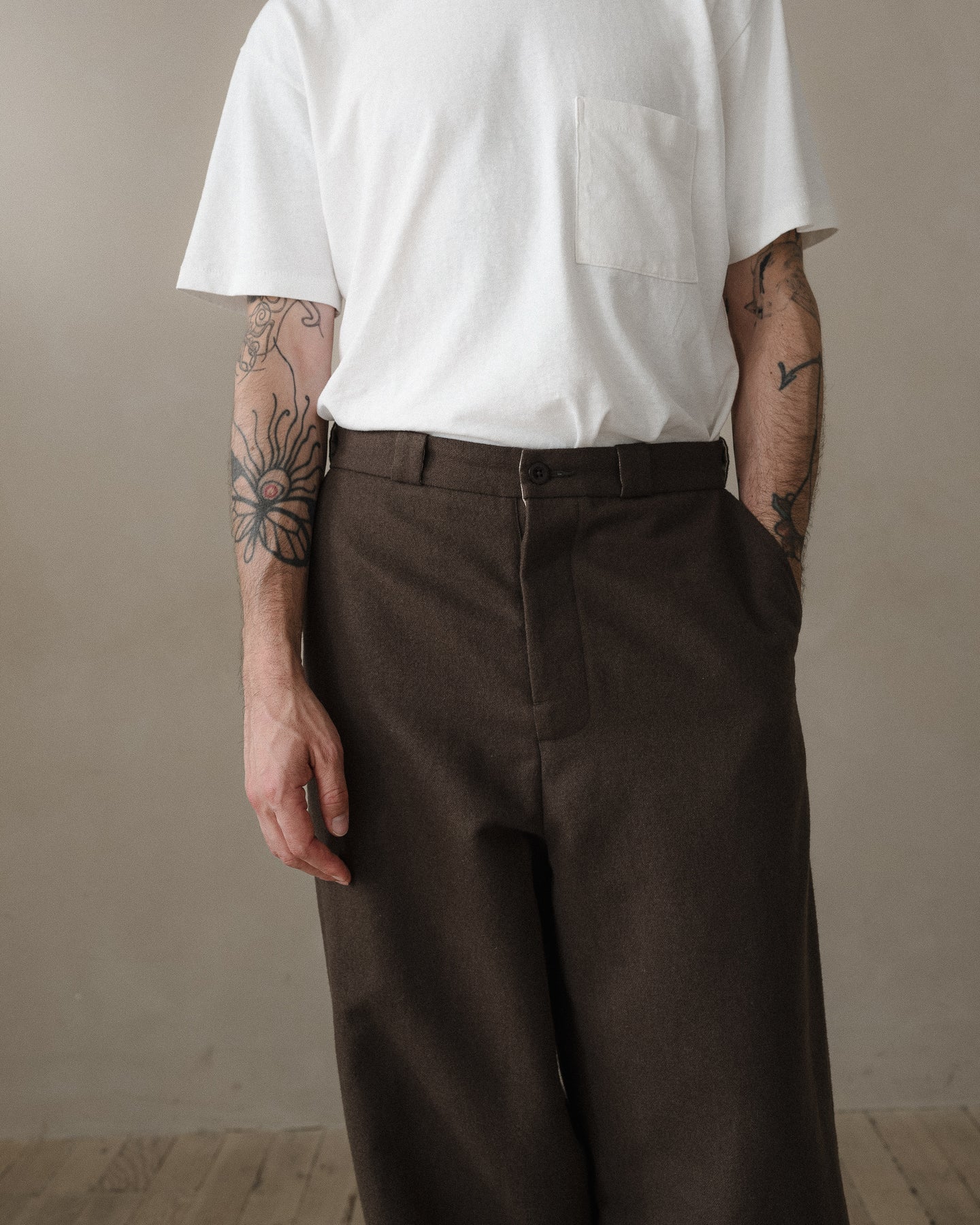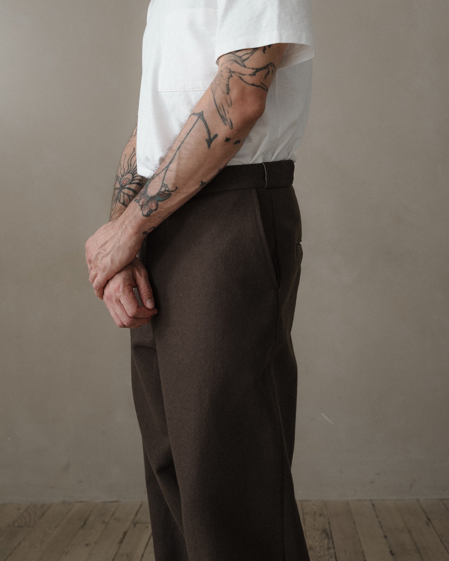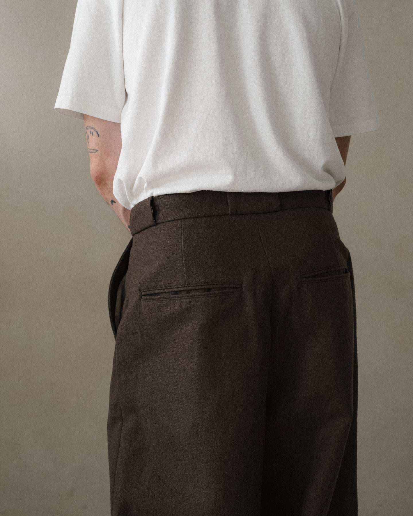 A higher rise, full leg pant that is similar to the Two Pleat Pant but with less taper at the hem and less volume in the waist. It has classic chino detailing like narrow jet welt pockets and slash front pockets along with a contrast waistband facing and tunnel beltloops.