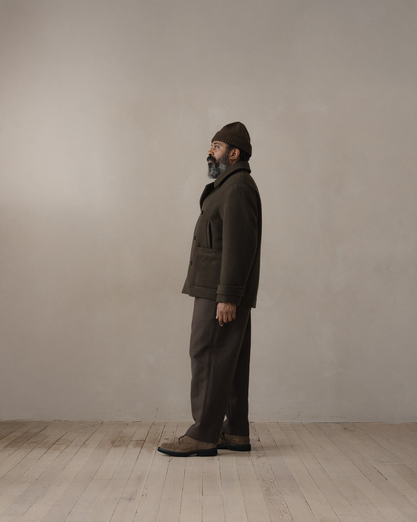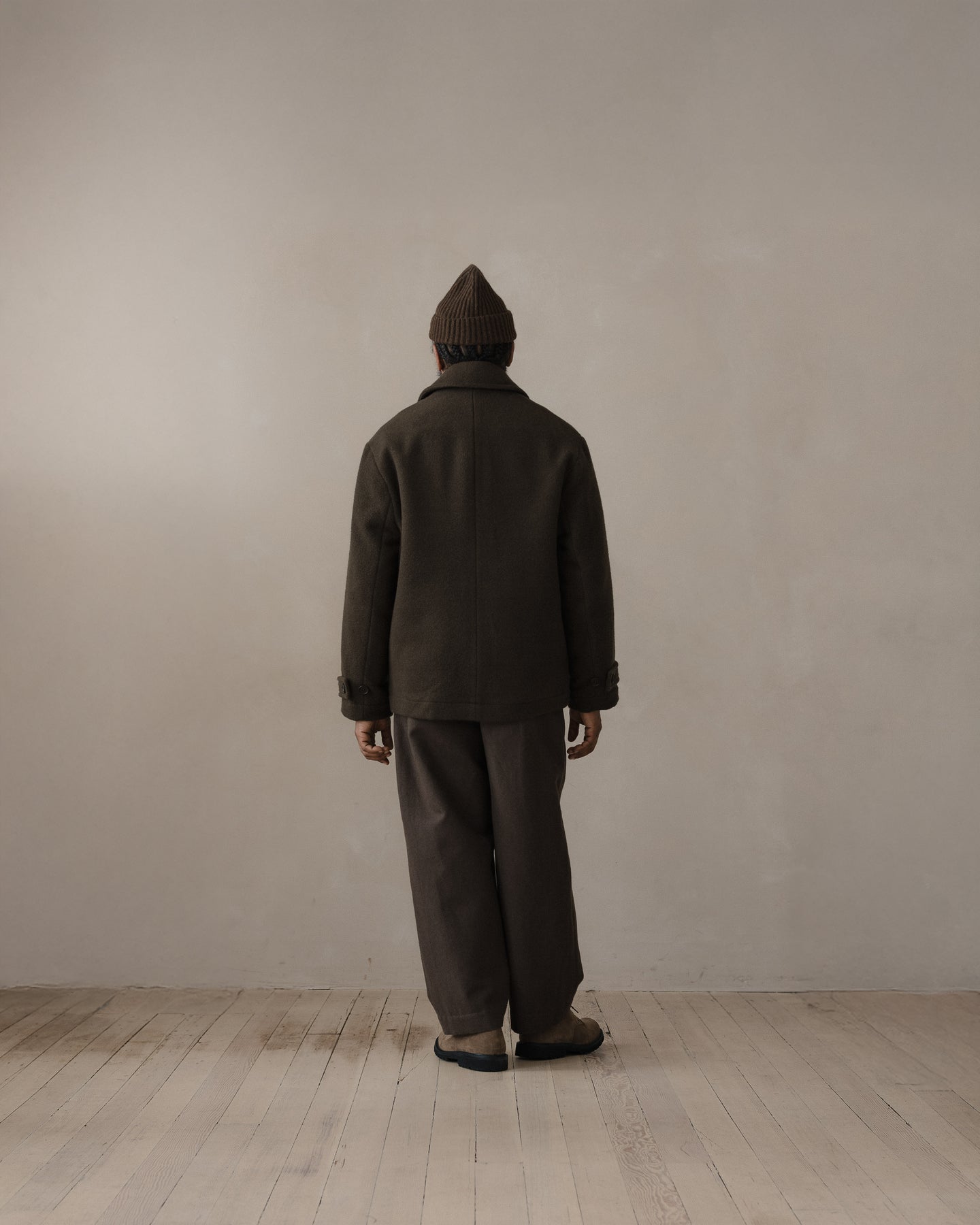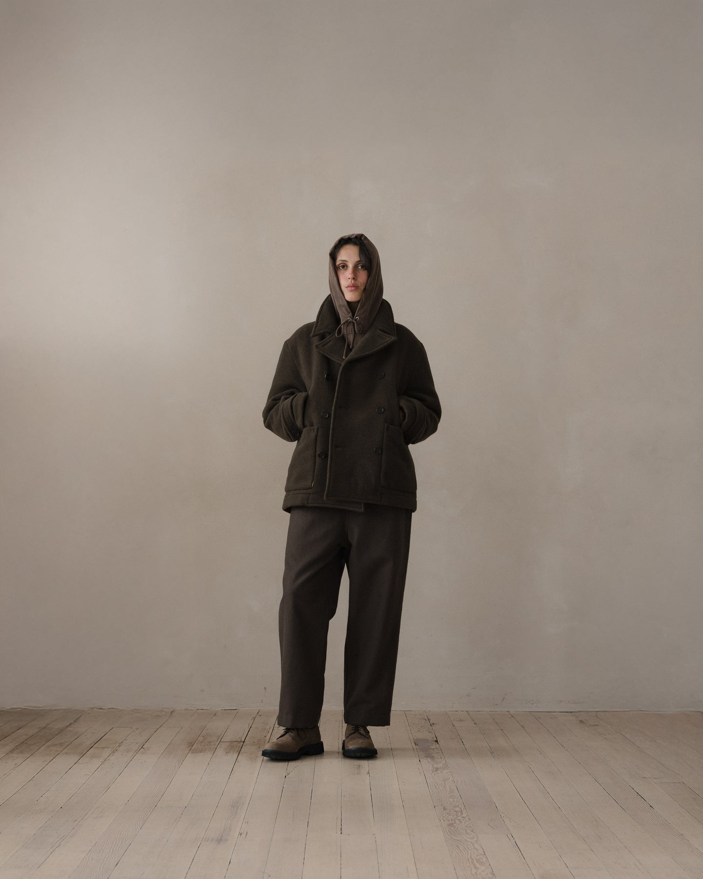 A double breasted, loose fitting shortened peacoat that has room for layering. The piece was designed to be worn as a fourth layer above a shirt, sweater and blazer for example - but fits just as well over a sweatshirt. It features side entry welt pockets along with hidden stitch patch pockets.