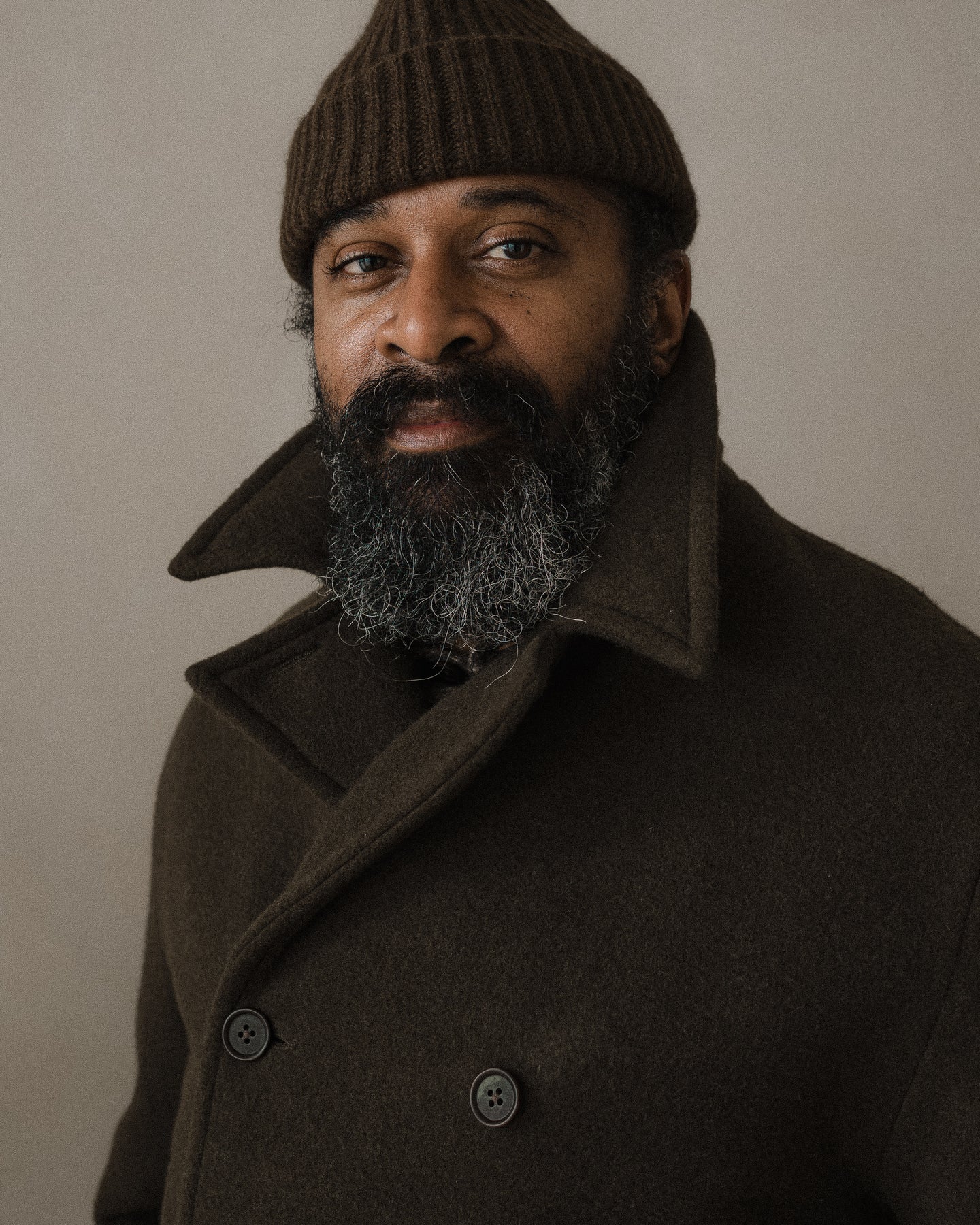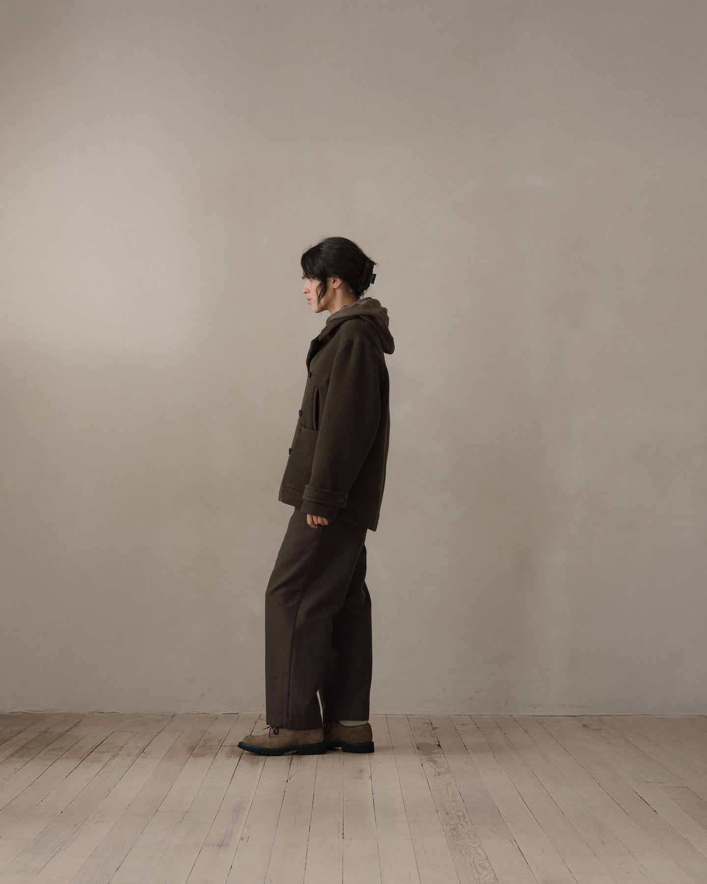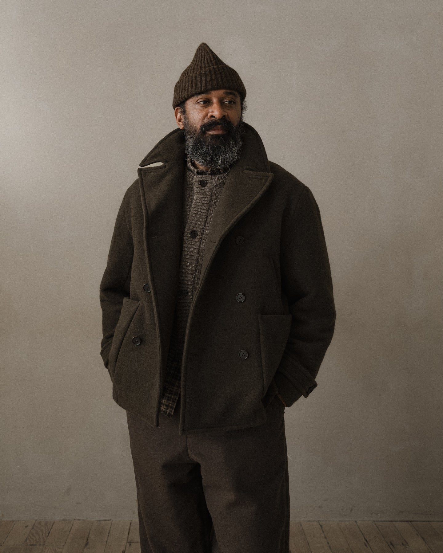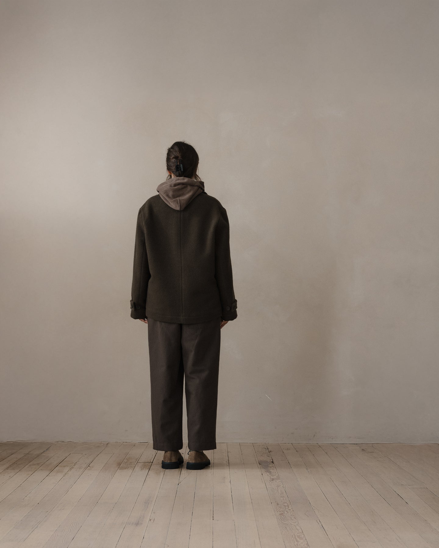 A double breasted, loose fitting shortened peacoat that has room for layering. The piece was designed to be worn as a fourth layer above a shirt, sweater and blazer for example - but fits just as well over a sweatshirt. It features side entry welt pockets along with hidden stitch patch pockets.