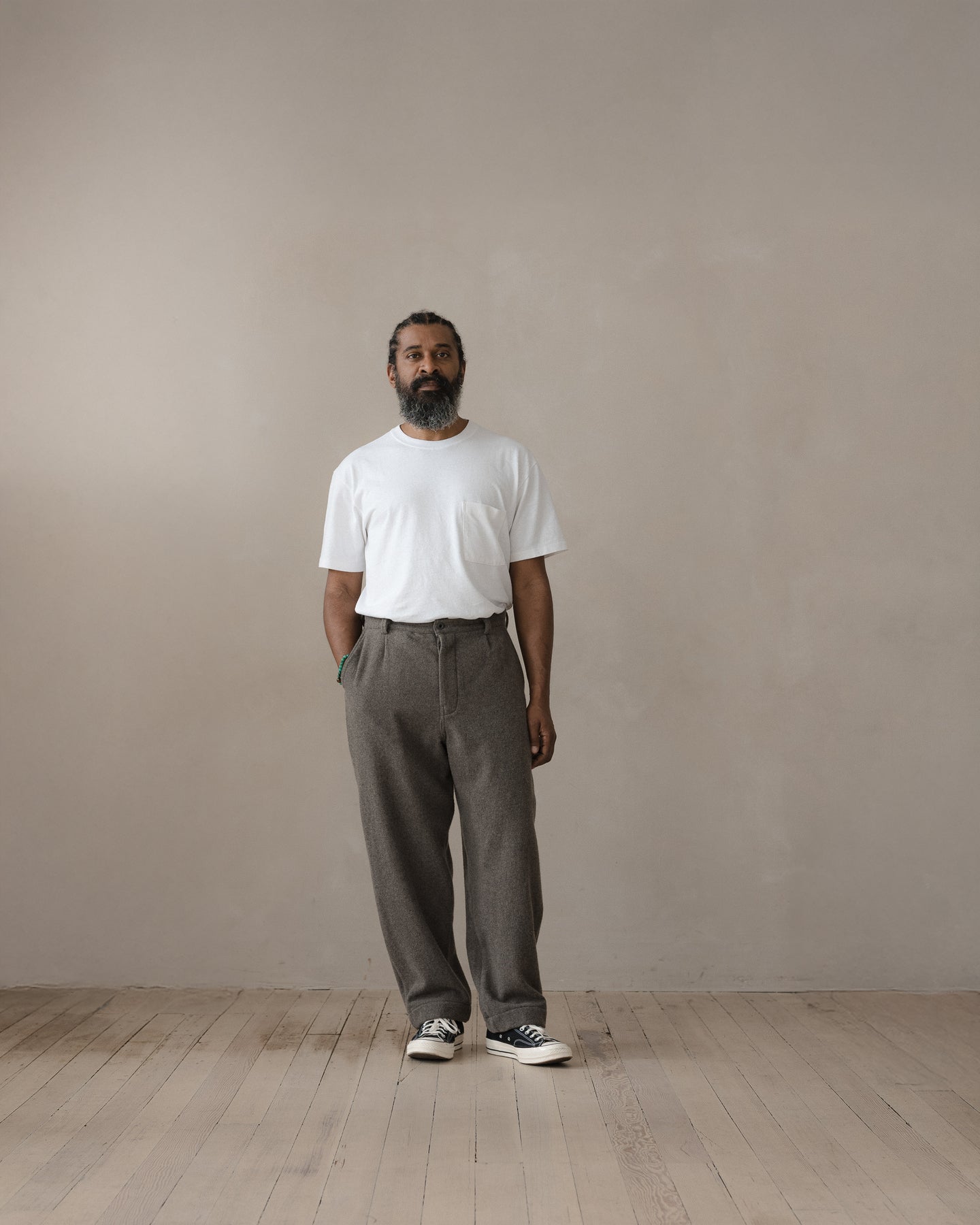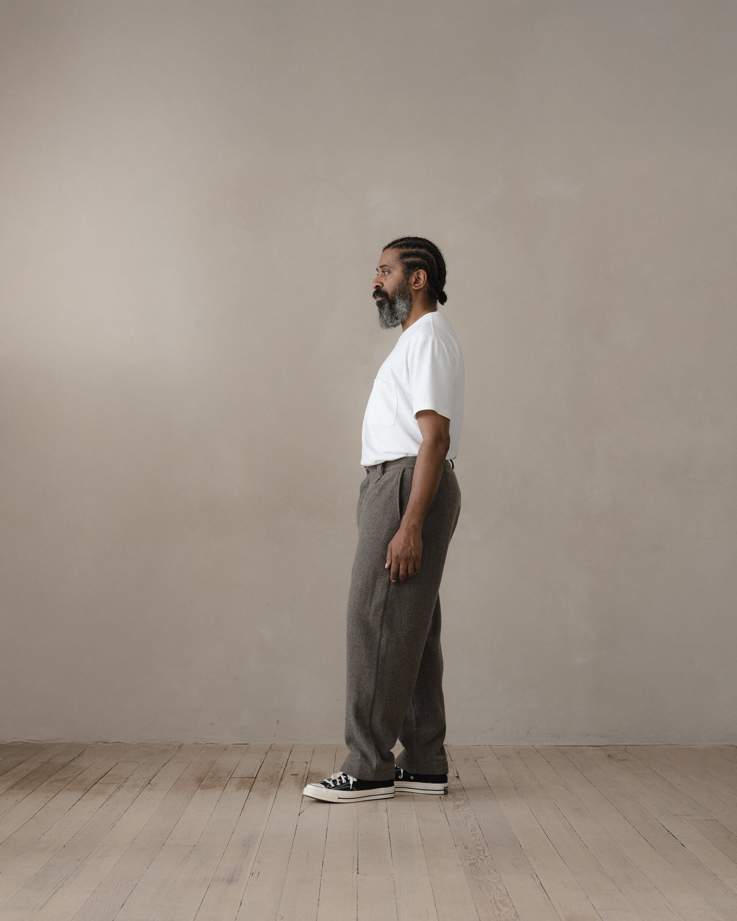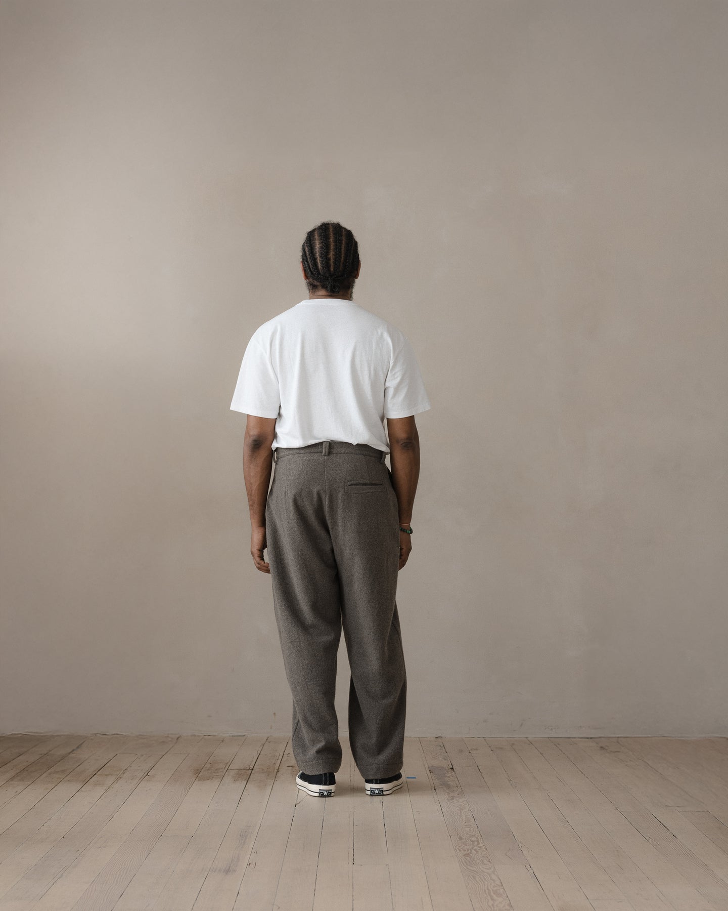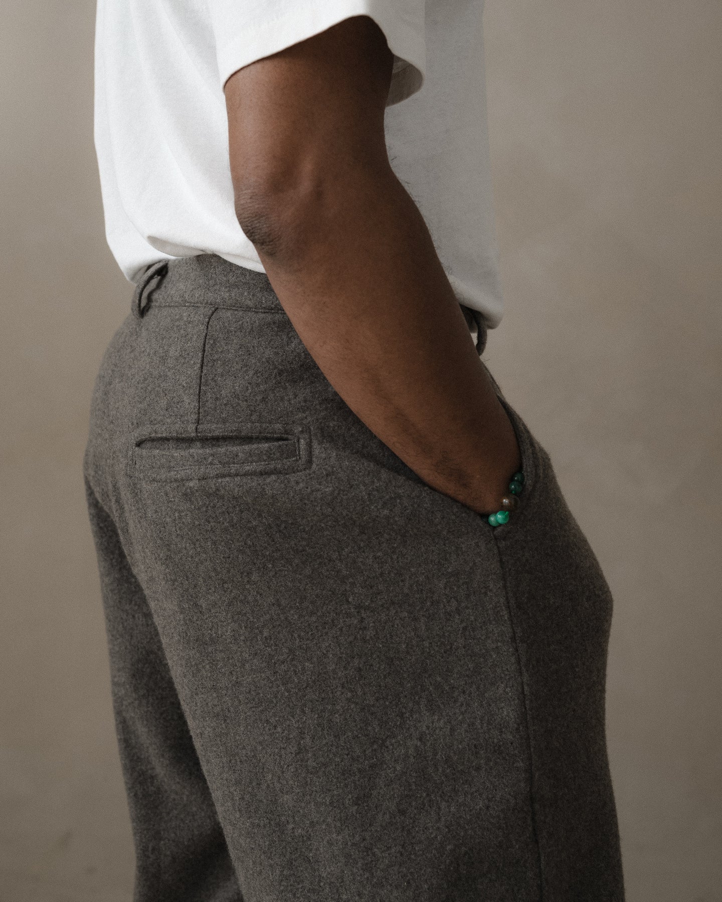 A slightly relaxed, subtly tapered pant featuring 1/2" pleats, quarter top front pockets, single ‘hand style’ welt pocket on back right side, french seams, wool washer backed YKK buttons, clean finish button fly and single needle belt loops.