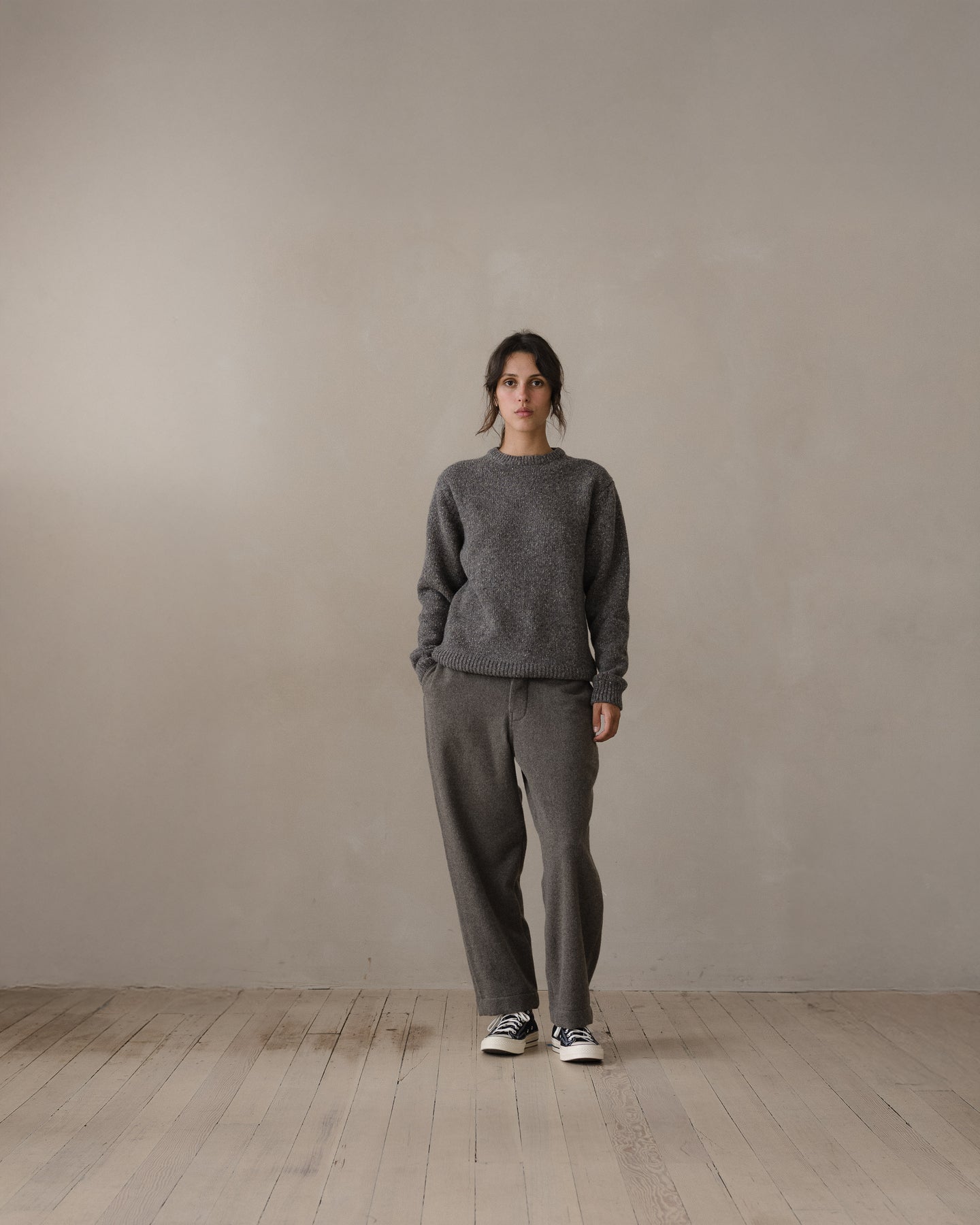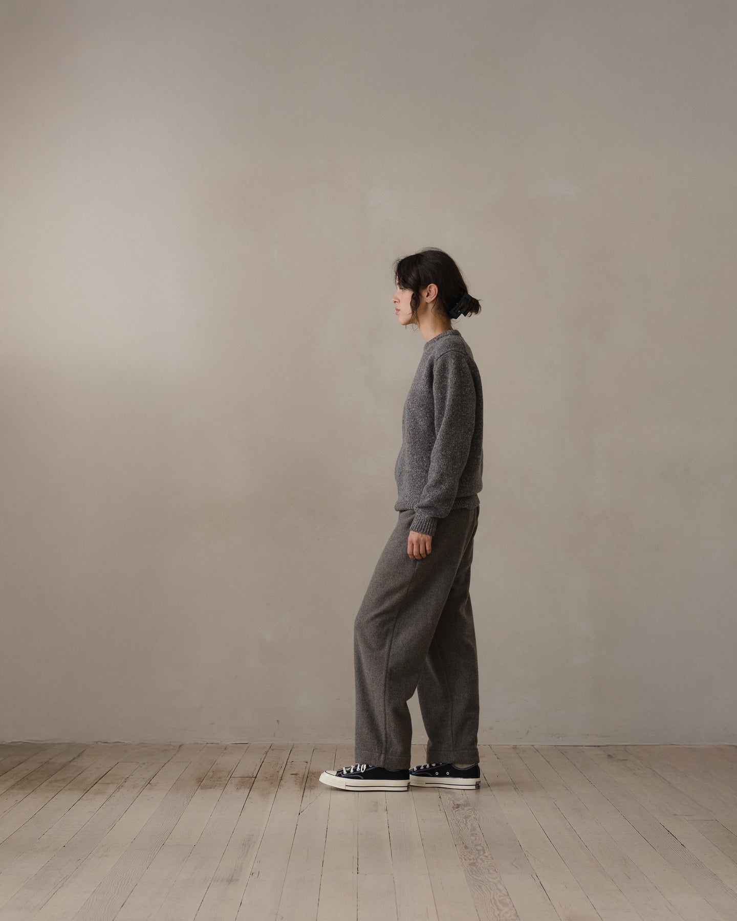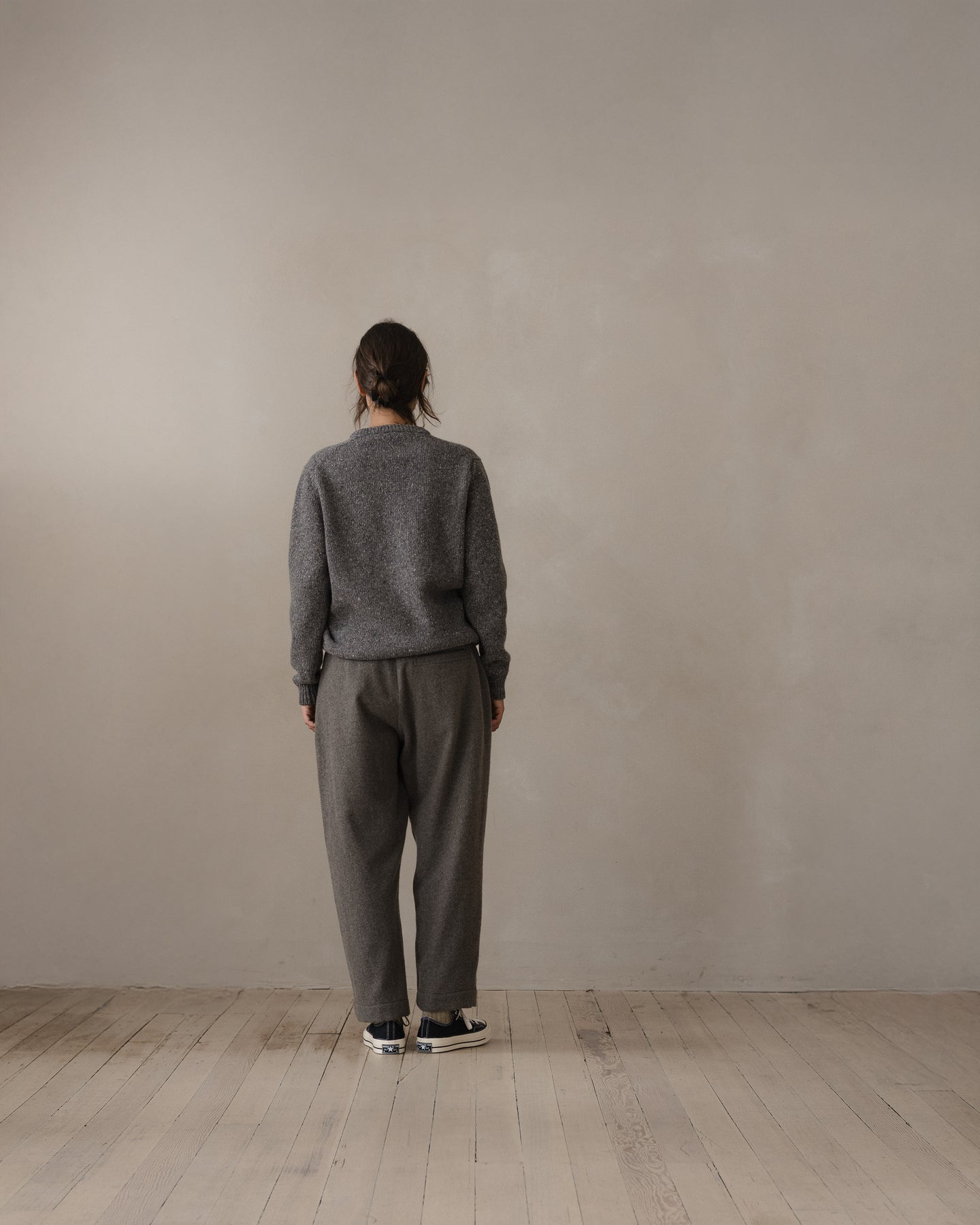 This heather grey cashmere/wool blend cloth is notably lofty and unstructured. The heavily brushed finish results in a very soft hand. It is both substantial and lightweight at the same time. The fiber was top-dyed, resulting in a melange color. Woven in Ichinomiya, Japan.