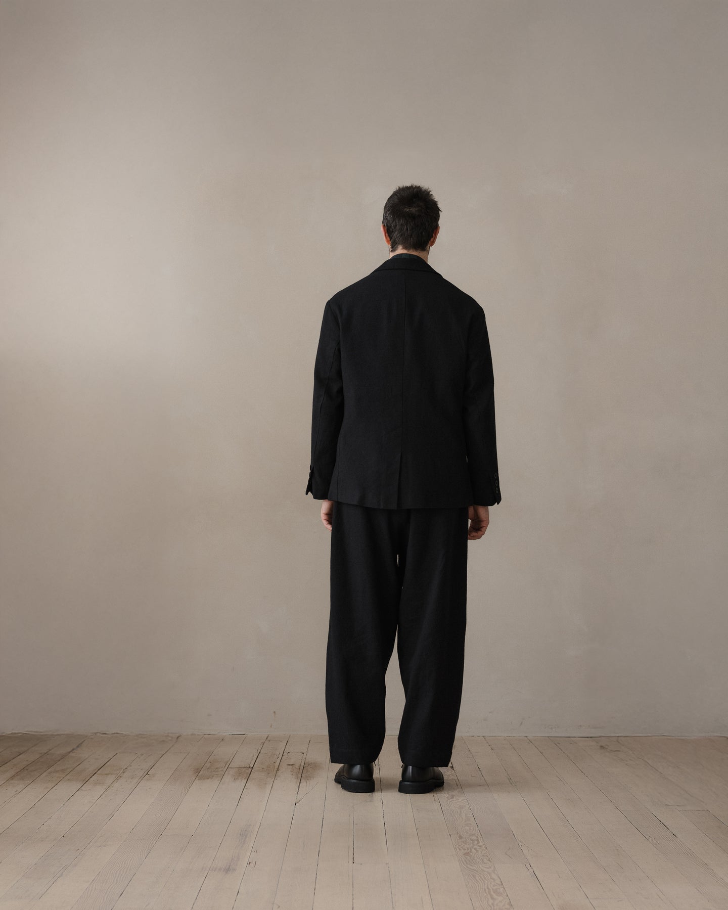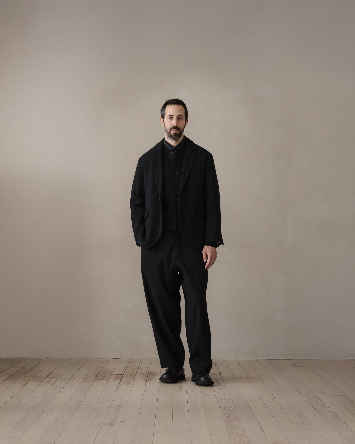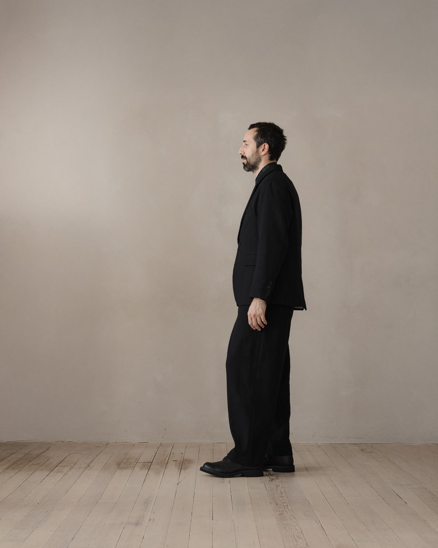 A very unique blend of soft and dense cashmere with the dry and crisp linen - a juxtaposing of two very different fibers. Each taking the dye slightly different, the resulting black color is nuanced and almost heathered. Woven in Ichinomiya, Japan.