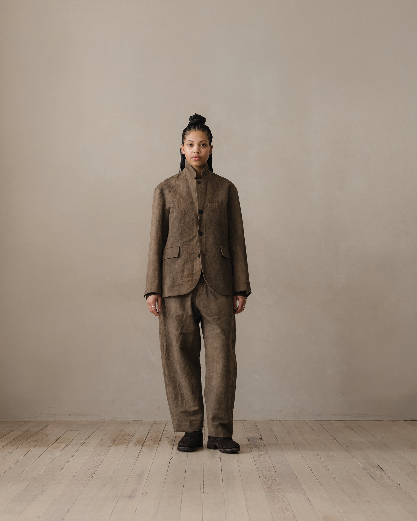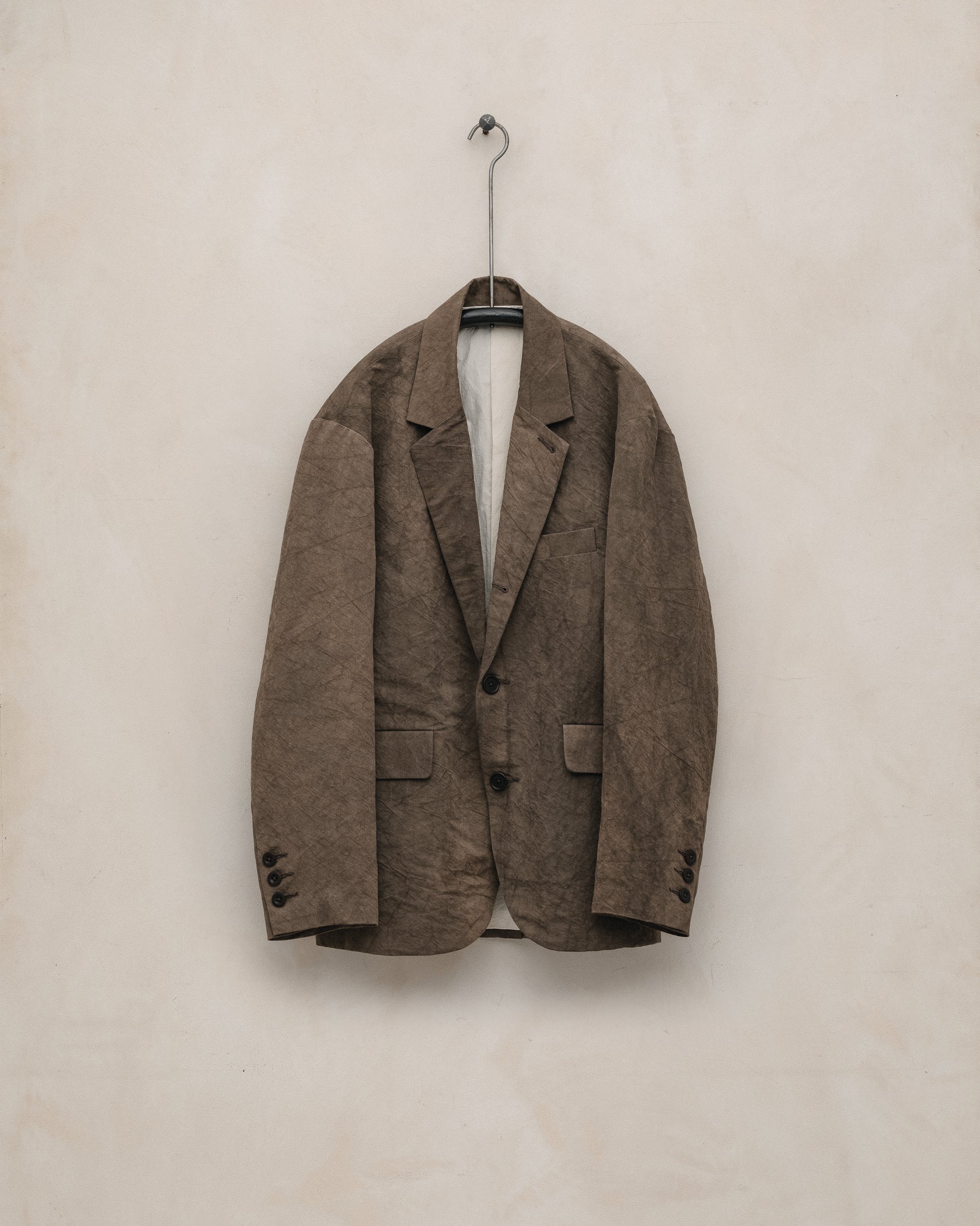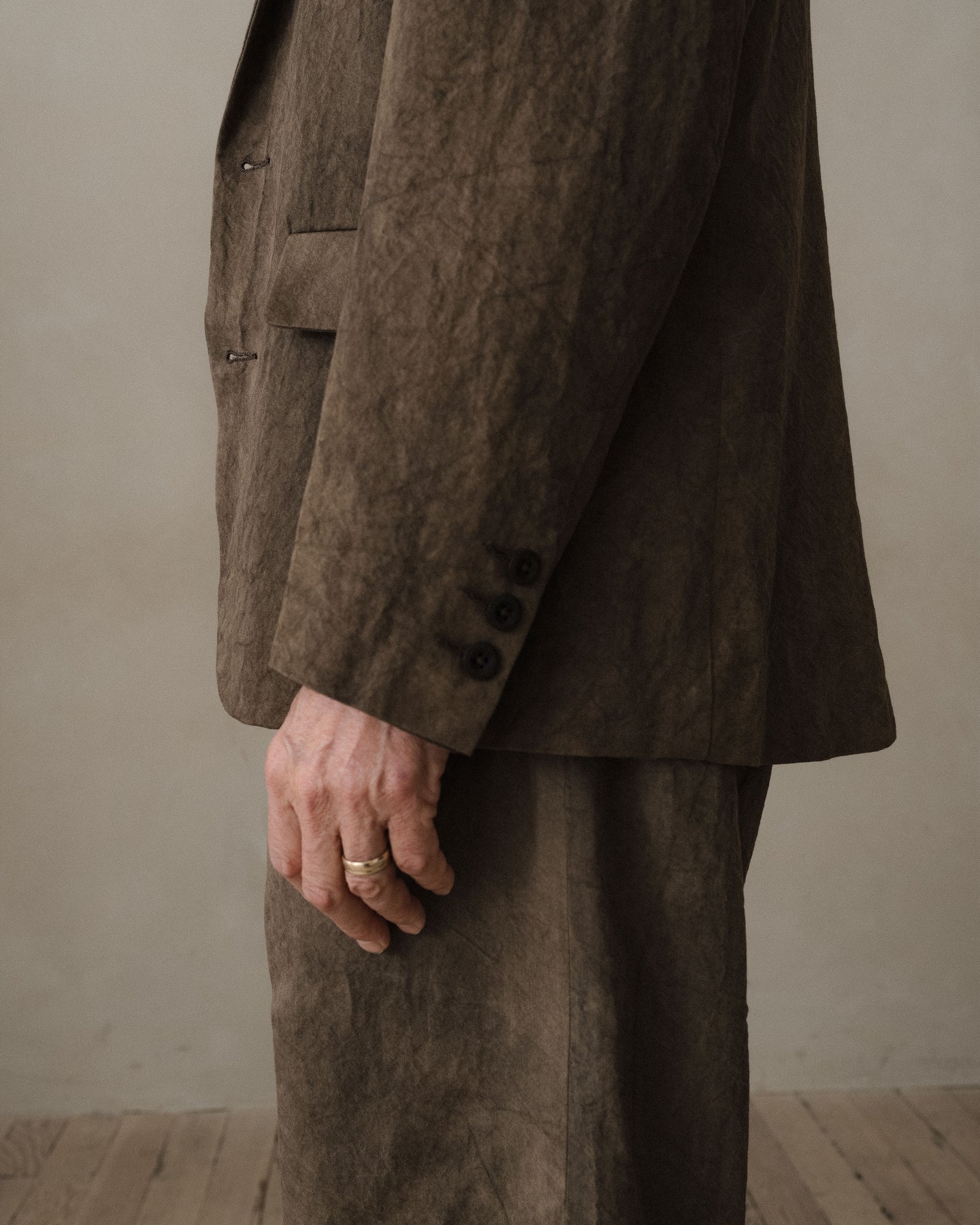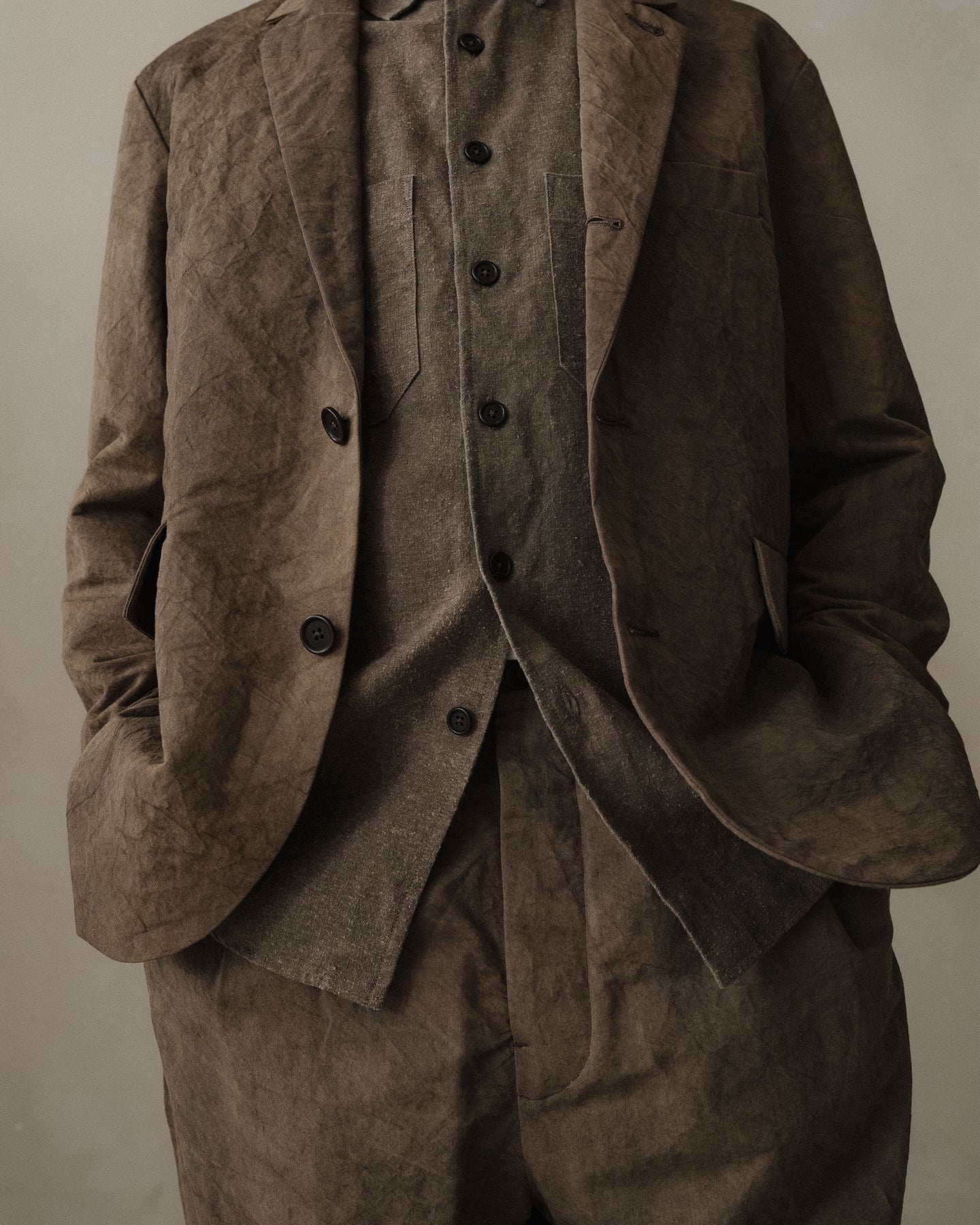 Medium weight lightly structured twill cloth, blending washi and cotton for a soft hand while retaining a dry feel, breathability and a crinkled texture. Overdyed with natural kakishibu (fermented persimmon/iron mixture) for a warm dark brown tone. Hand dyed at a small workshop in Okayama, Japan - where just two people push the boundaries in experimental dye processes. Woven in Japan.