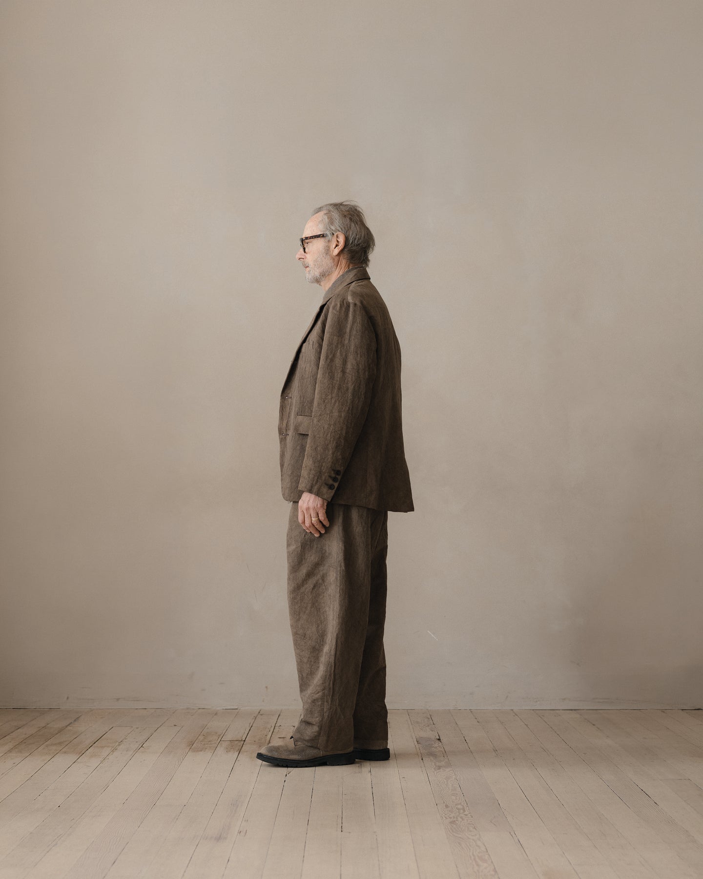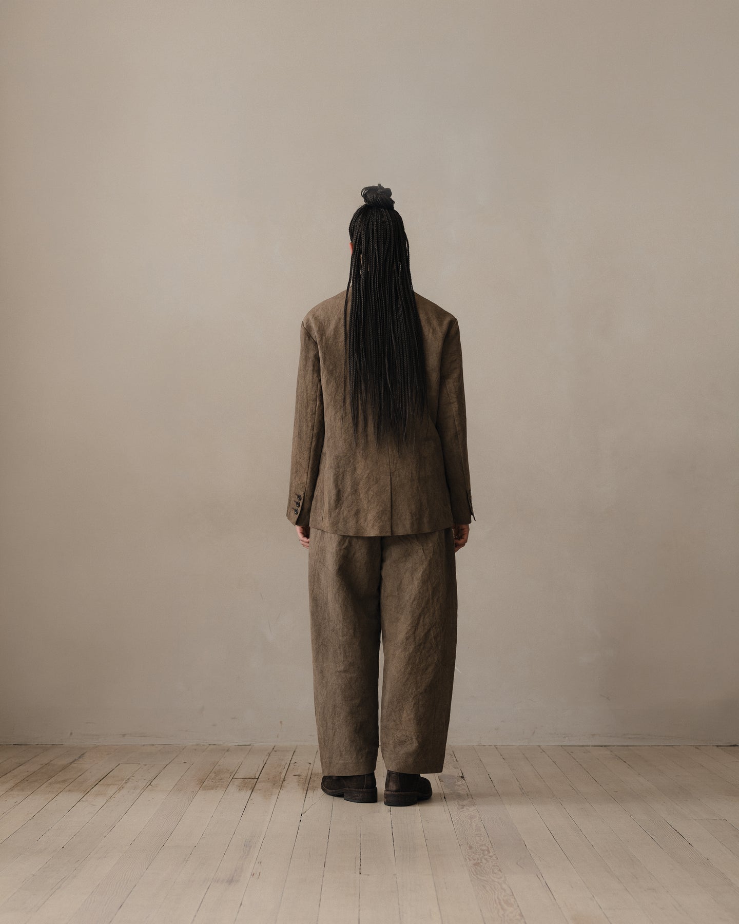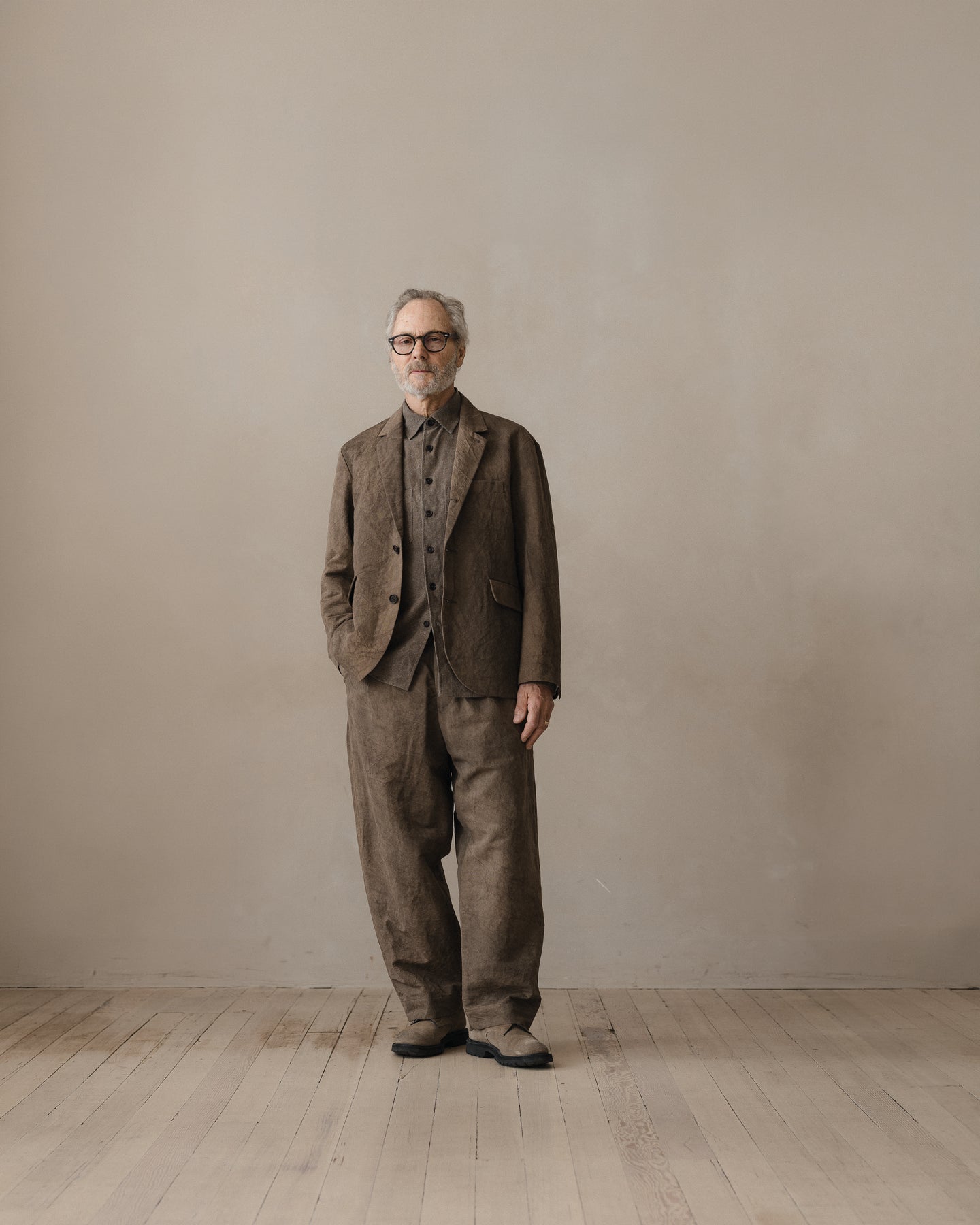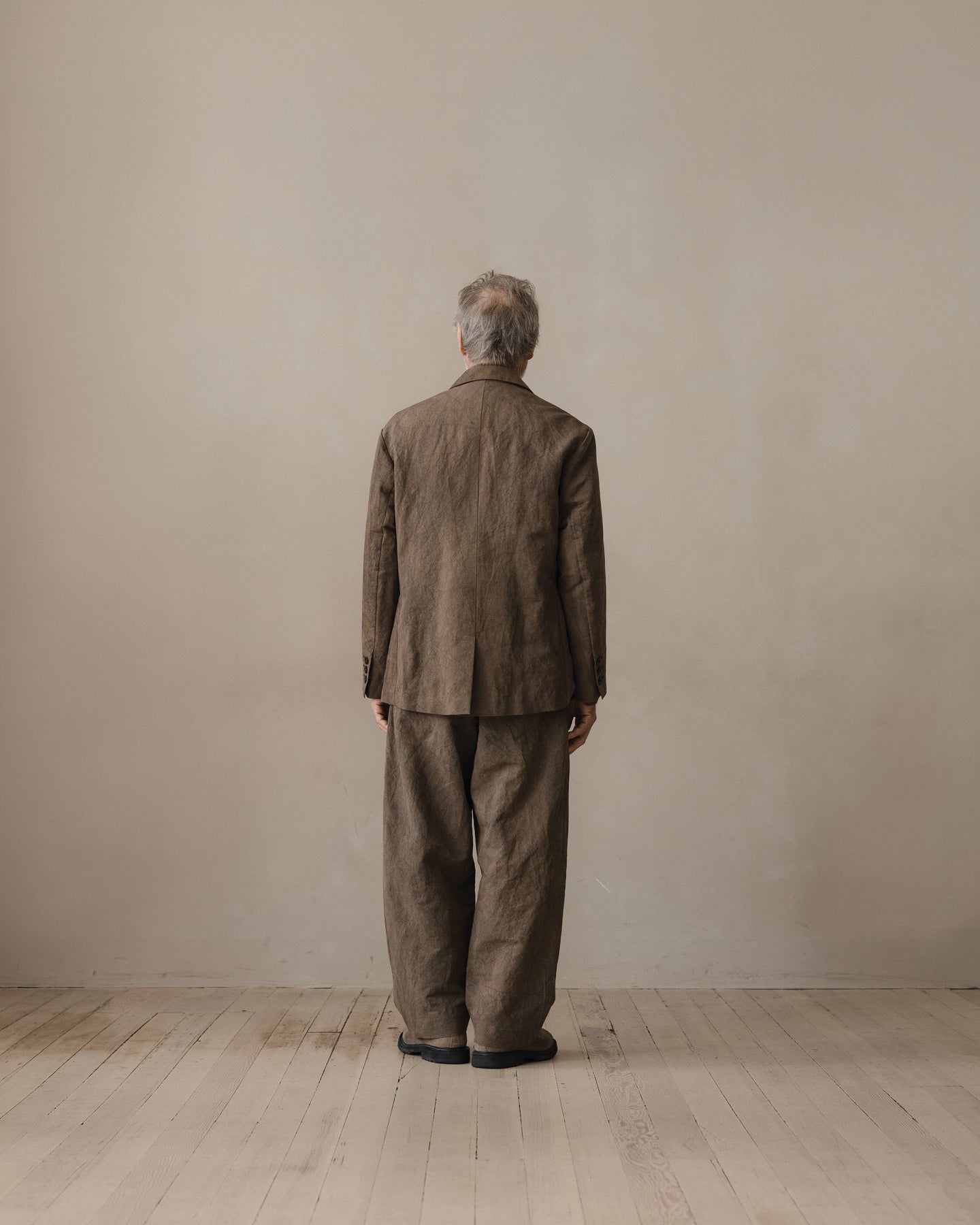 Medium weight lightly structured twill cloth, blending washi and cotton for a soft hand while retaining a dry feel, breathability and a crinkled texture. Overdyed with natural kakishibu (fermented persimmon/iron mixture) for a warm dark brown tone. Hand dyed at a small workshop in Okayama, Japan - where just two people push the boundaries in experimental dye processes. Woven in Japan.