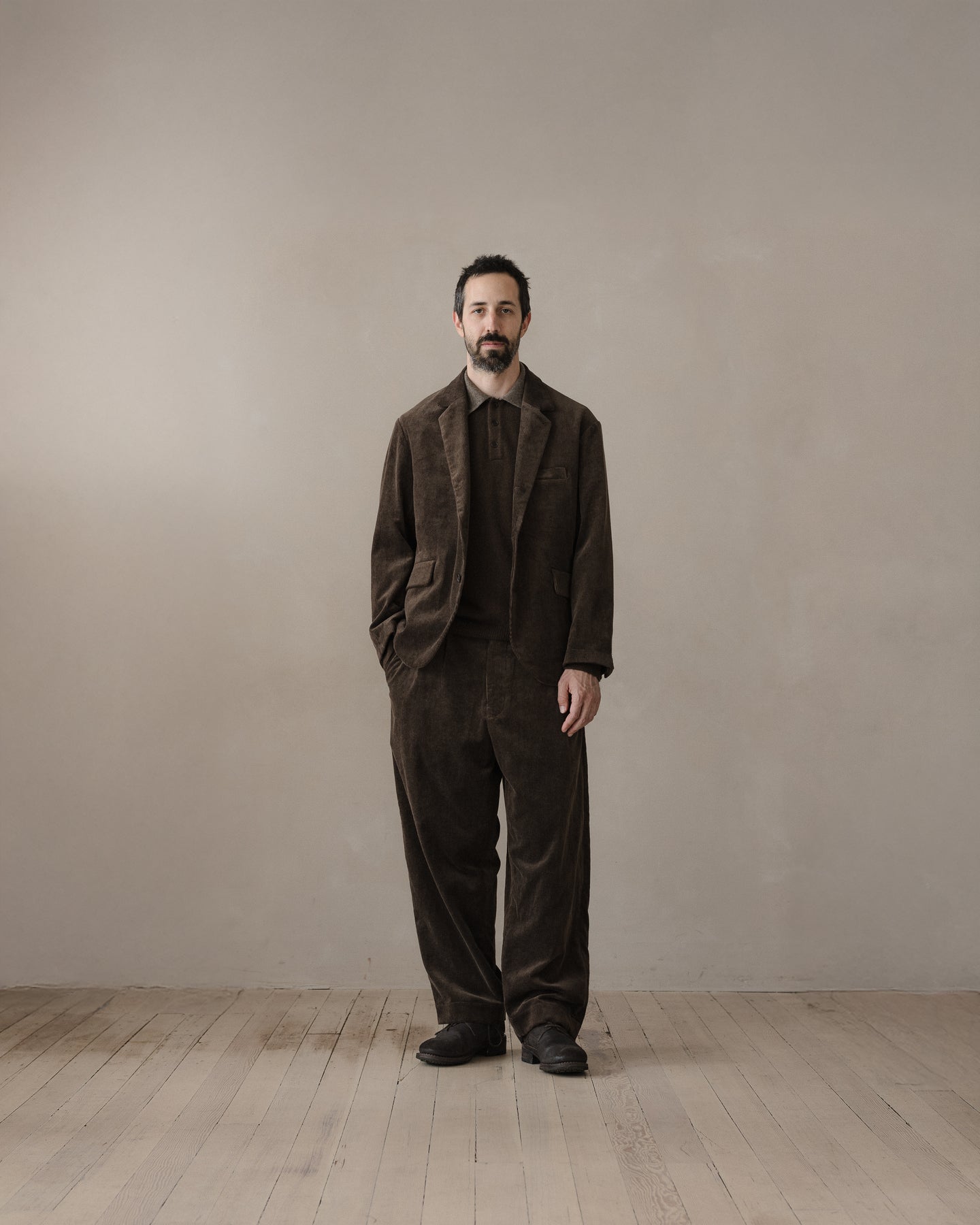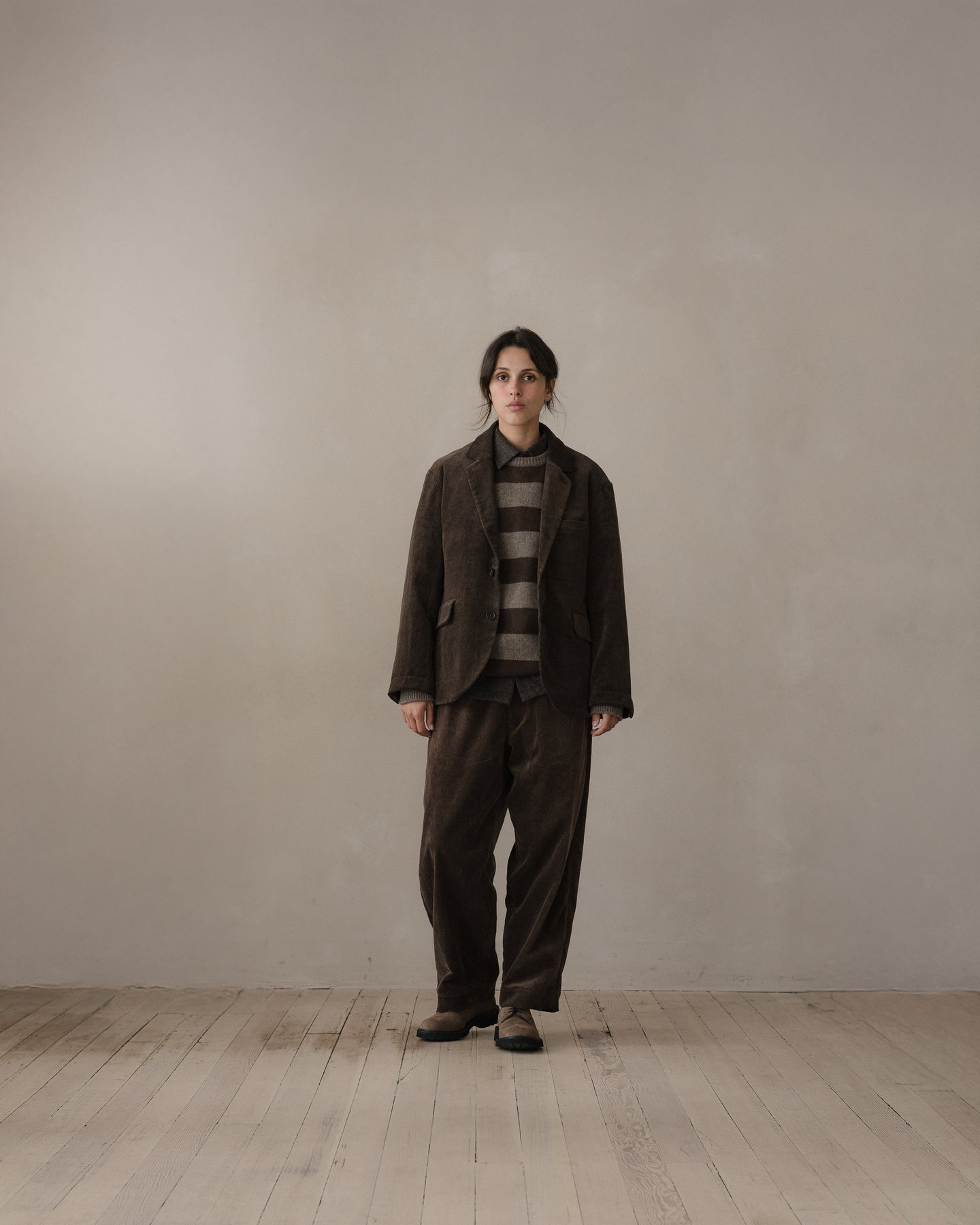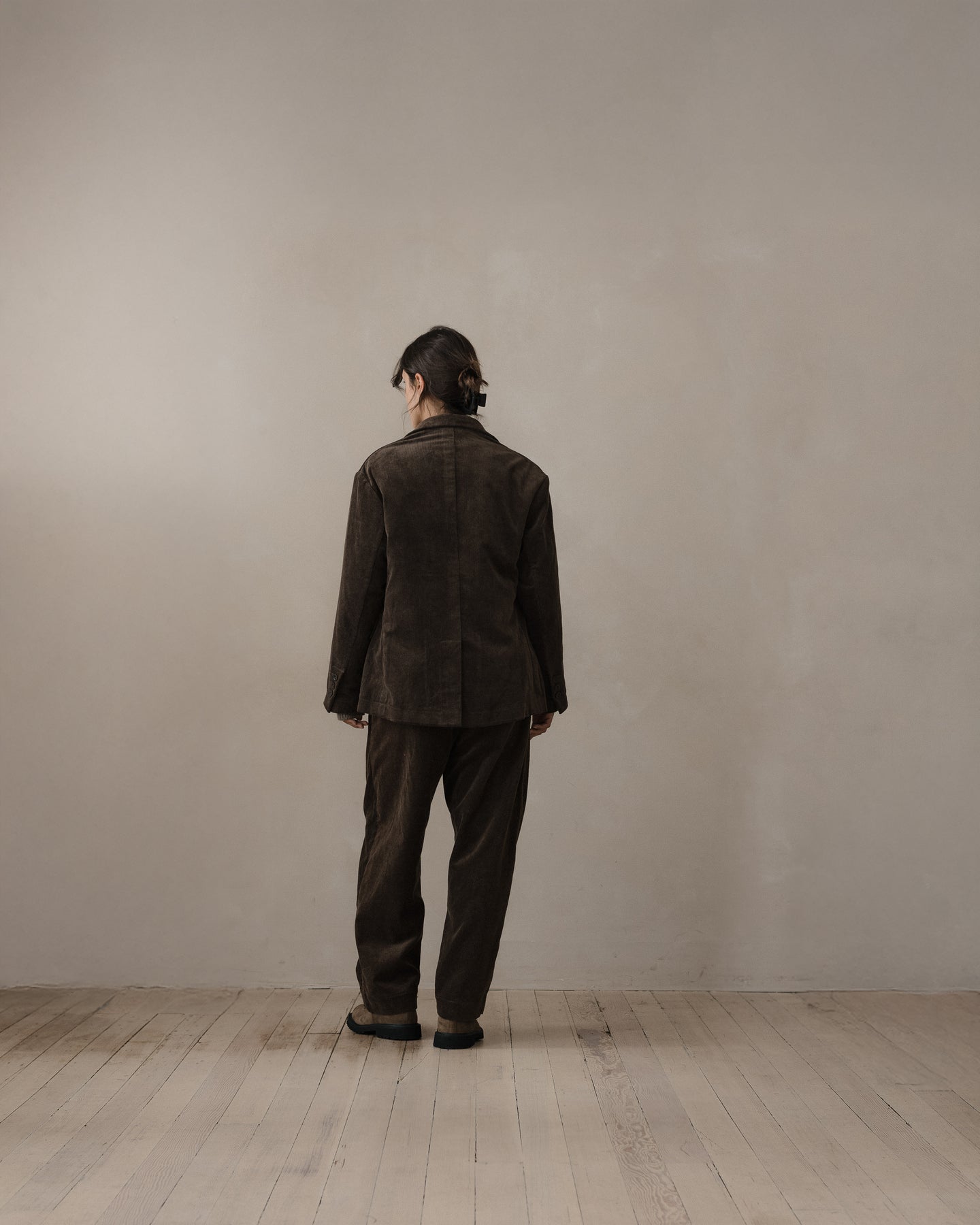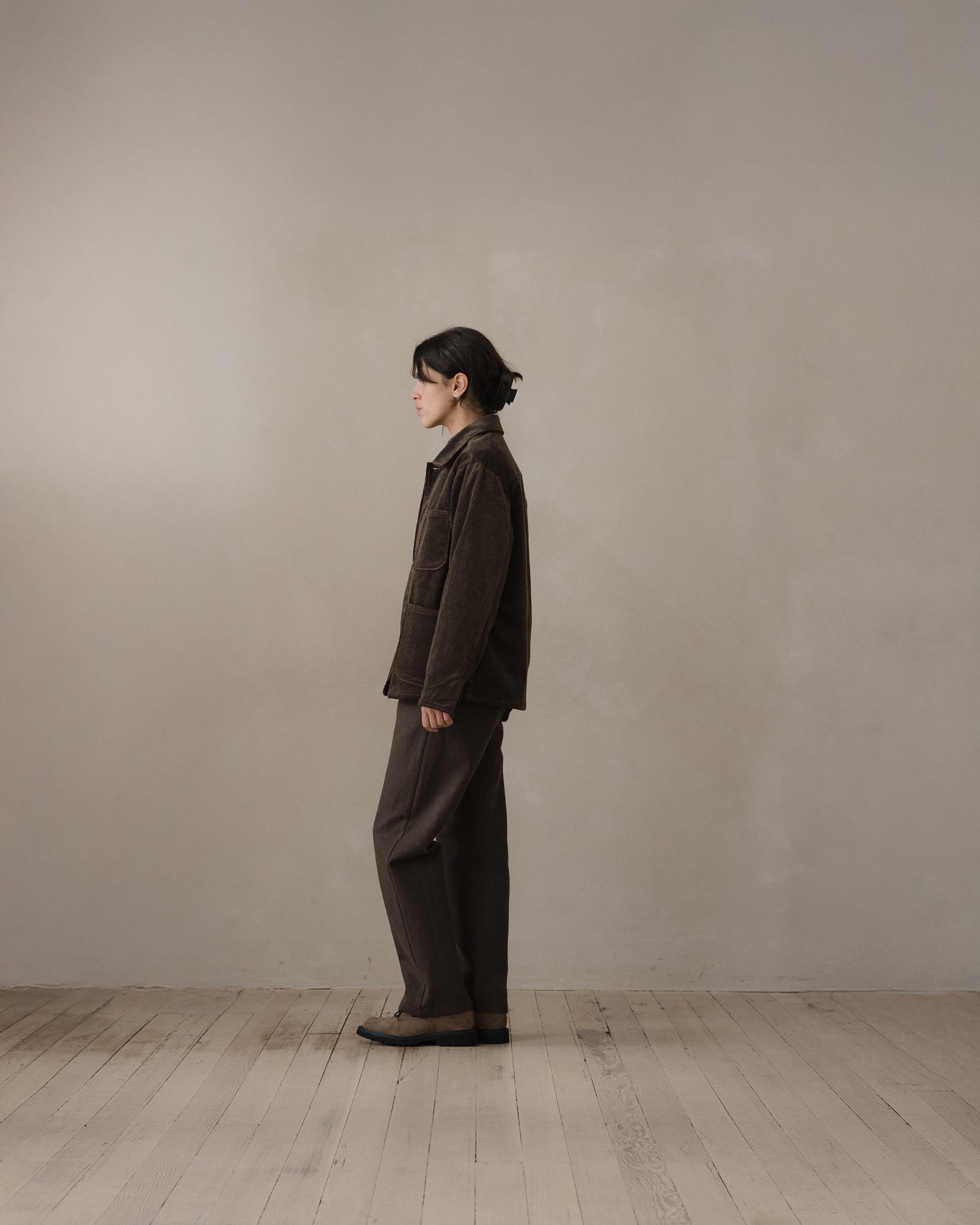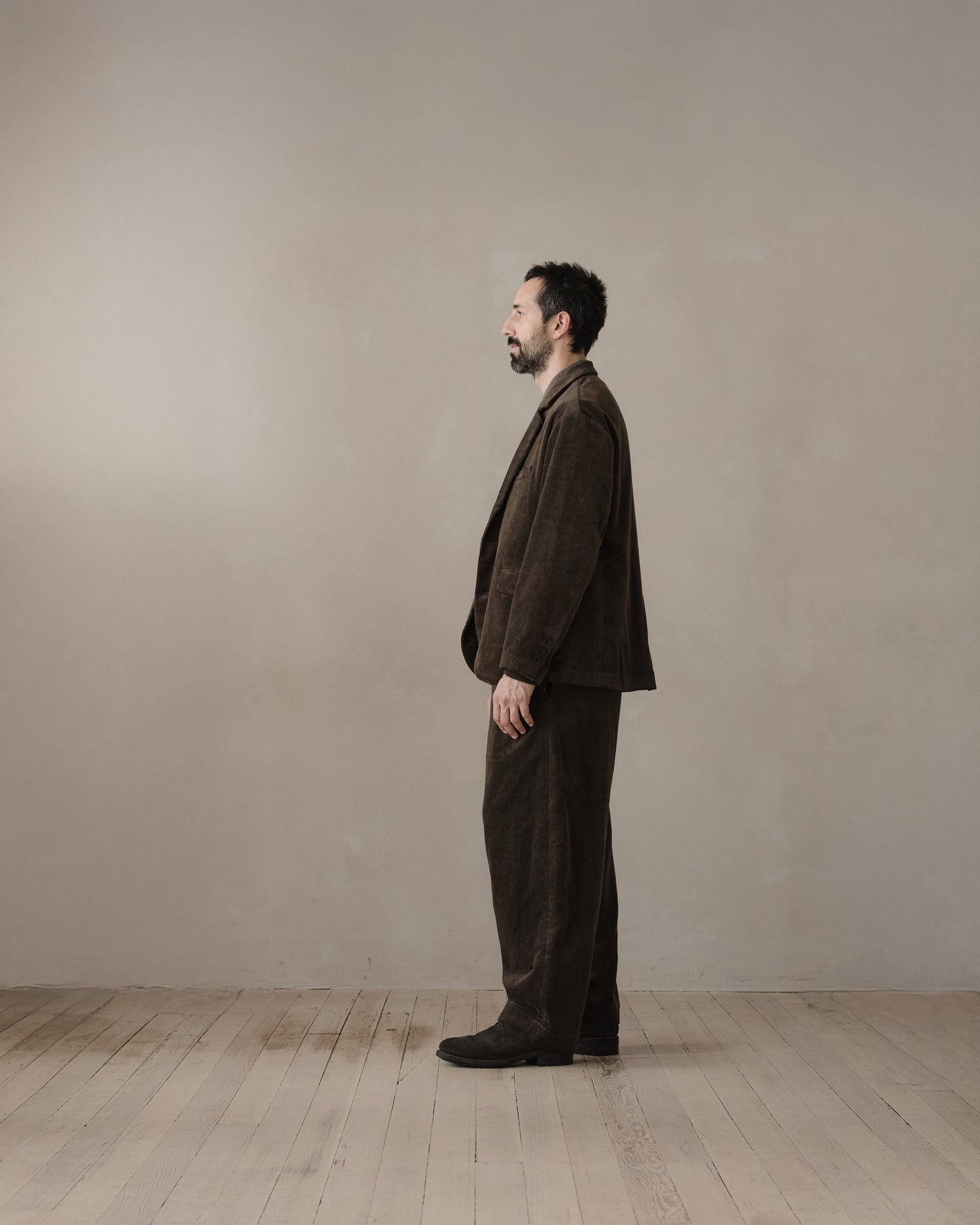 A medium weight corduroy blending cotton and linen to achieve a slightly dry hand and more irregular texture. Woven in Wakayama, Japan - this pile weave was then cut in Shizuoka by one of the last remaining corduroy cutters in all of Japan. The cloth was piece dyed using a blend of natural sumi ink and Oeko-Tex certified dye in Okayama. The dyeing process also contributes to the dry touch that will continue to soften overtime with repeated washing and wear.