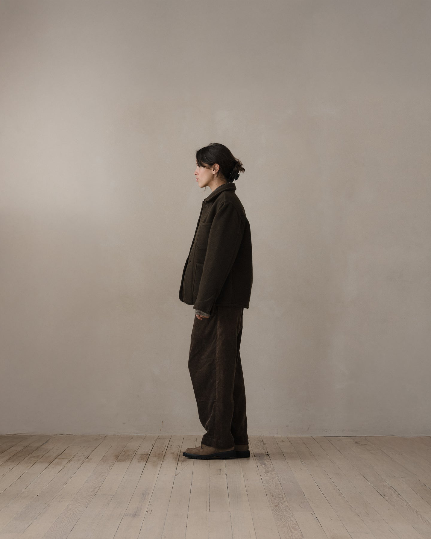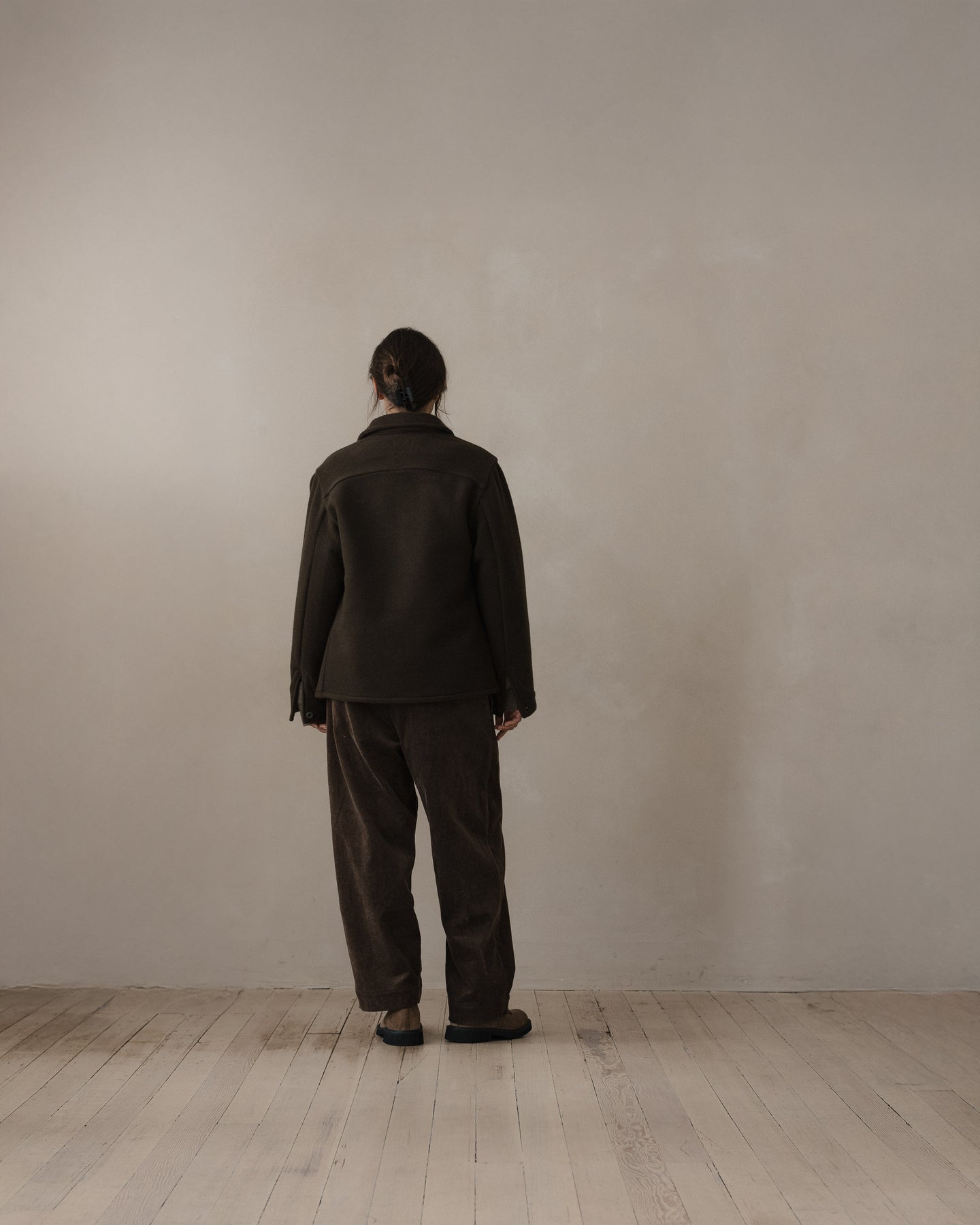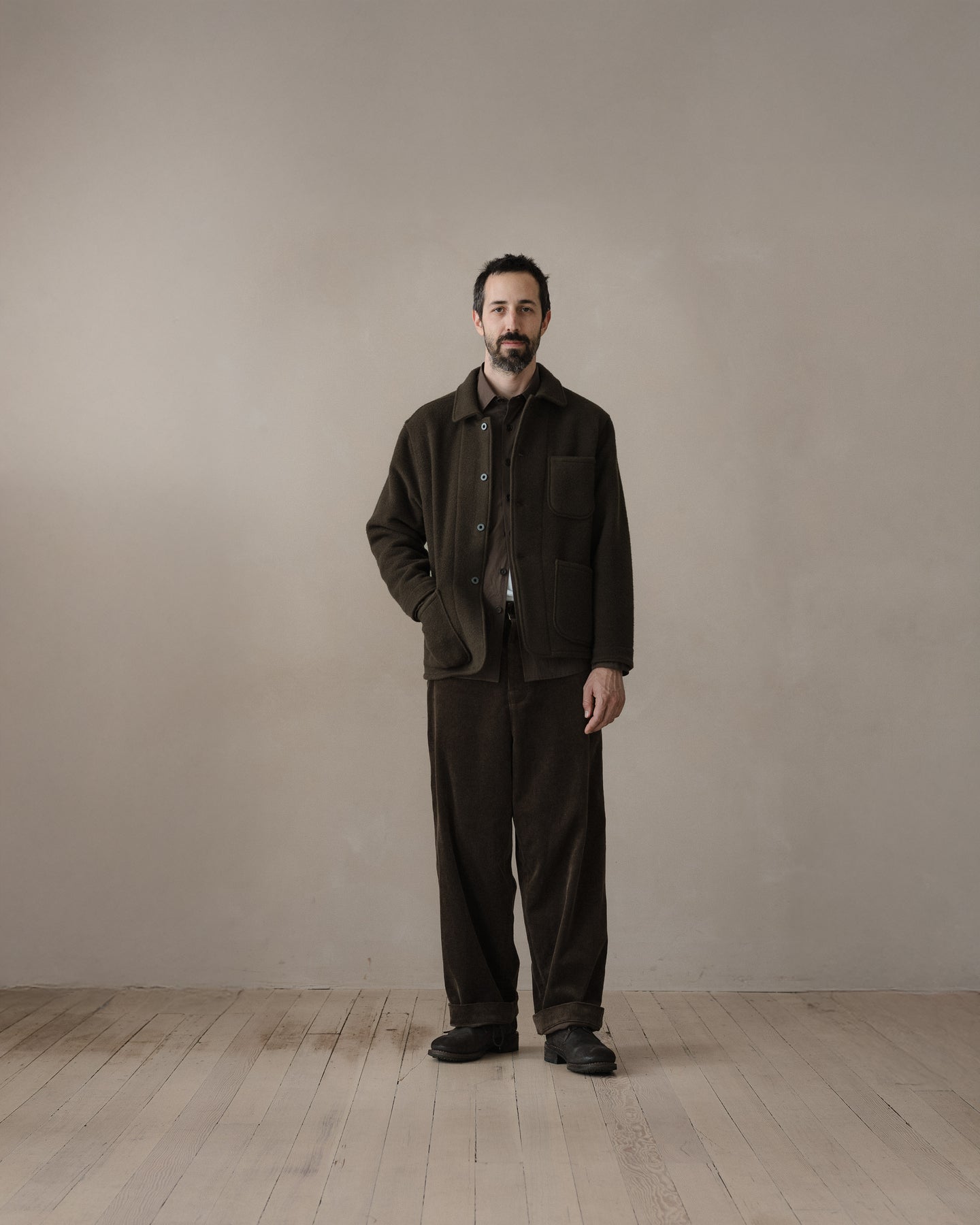 The very first piece in the collection - a classic work jacket constructed with french seams, engineer cuffs, angled waist pockets, veg-tan leather washer backed YKK buttons, curved collar tips and ‘cut away’ curve at the hem.