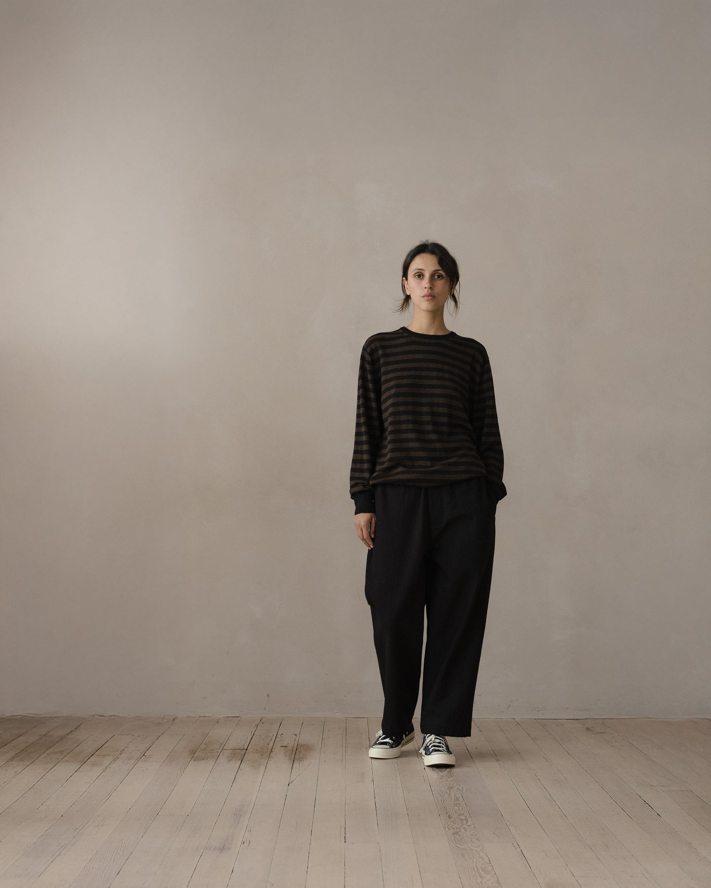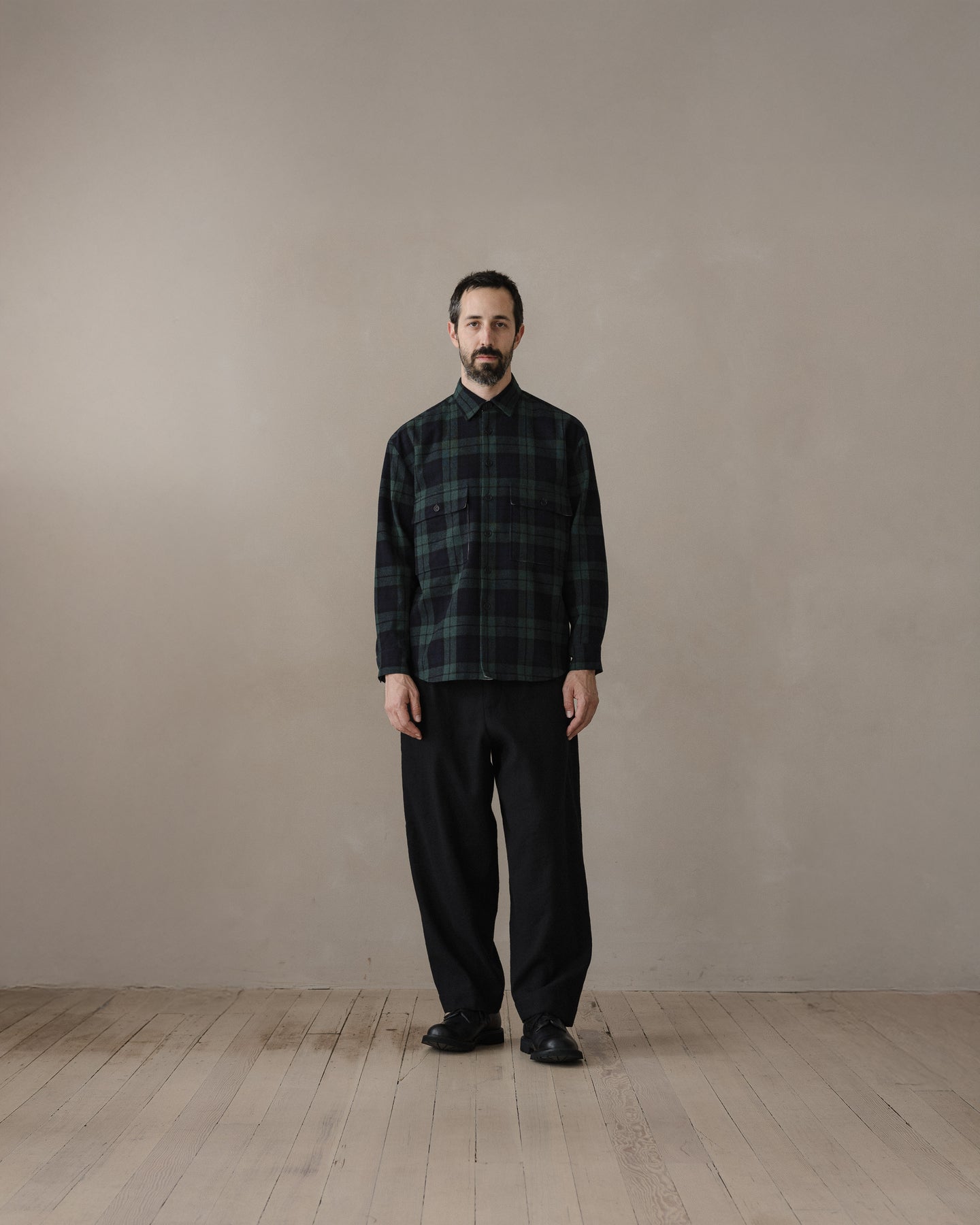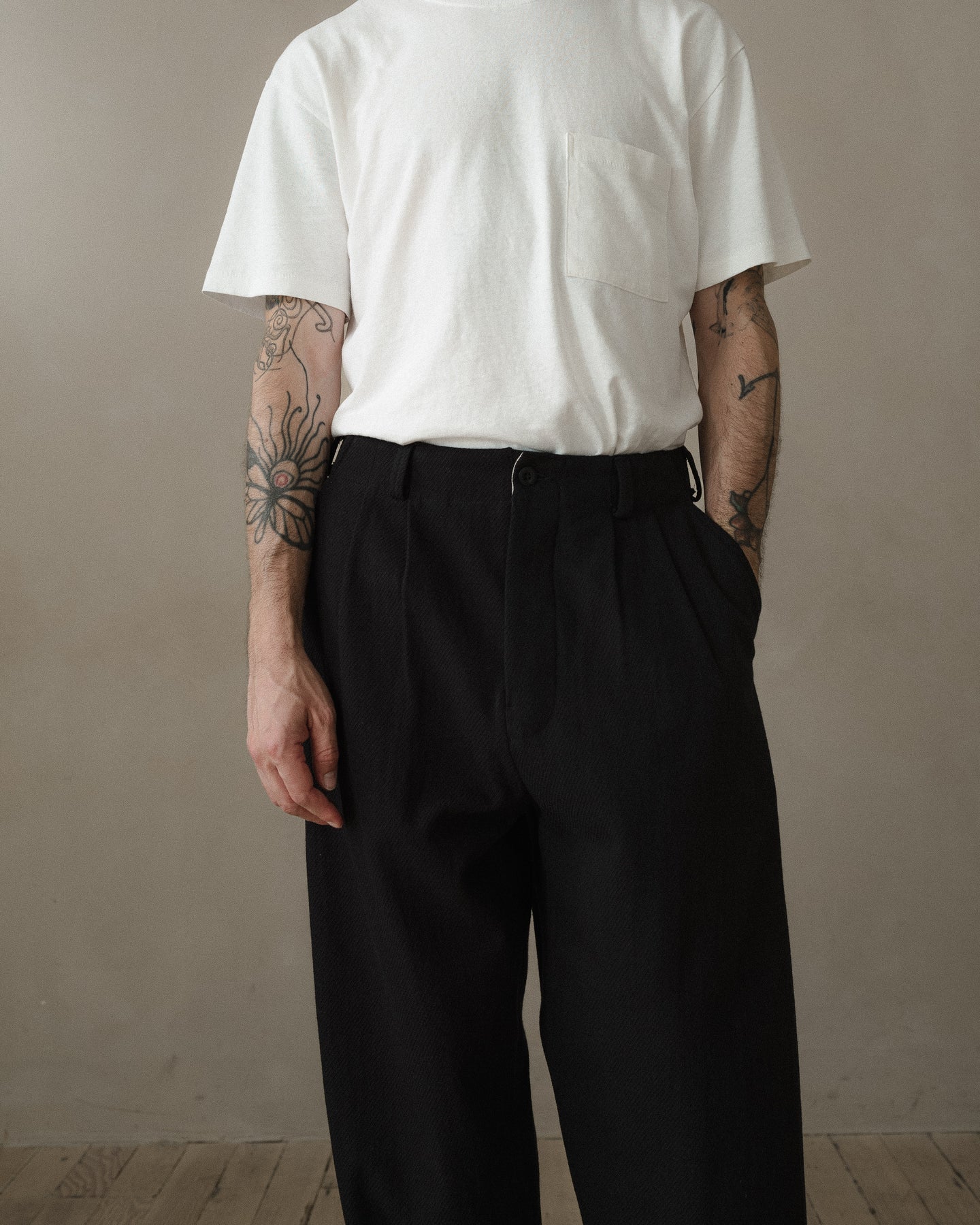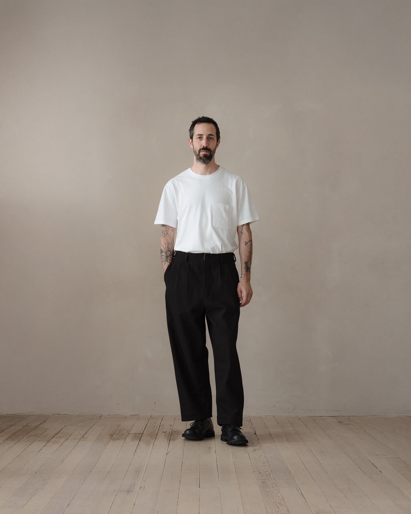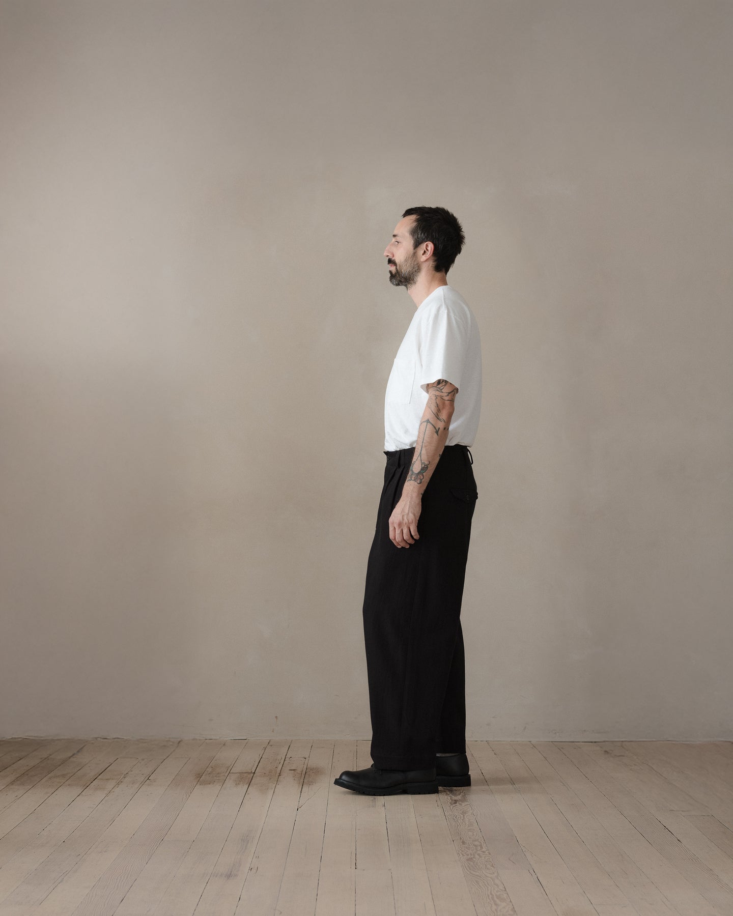 A loose and slightly tapered pant featuring slash front pockets, rear welt pockets with button through flap, ‘clean finish’ cotton bound seams throughout, corozo buttons, ‘hollywood’ split back waistband construction, bound button fly and single needle belt loops. The most generous fitting pant in the collection, but with a more tapered shape than the Elastic Pant.