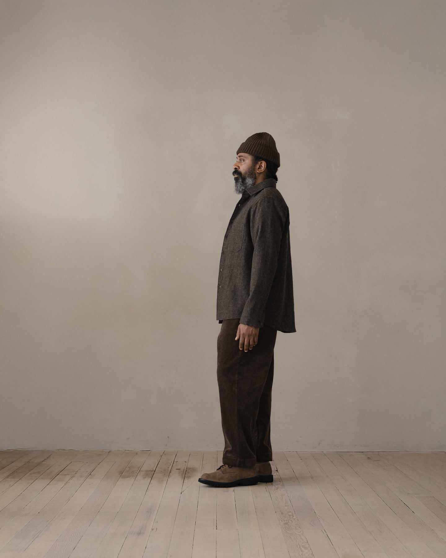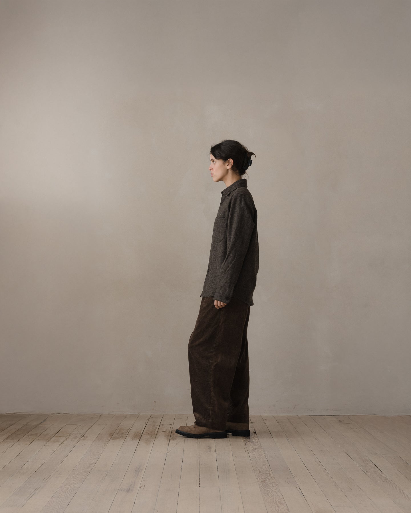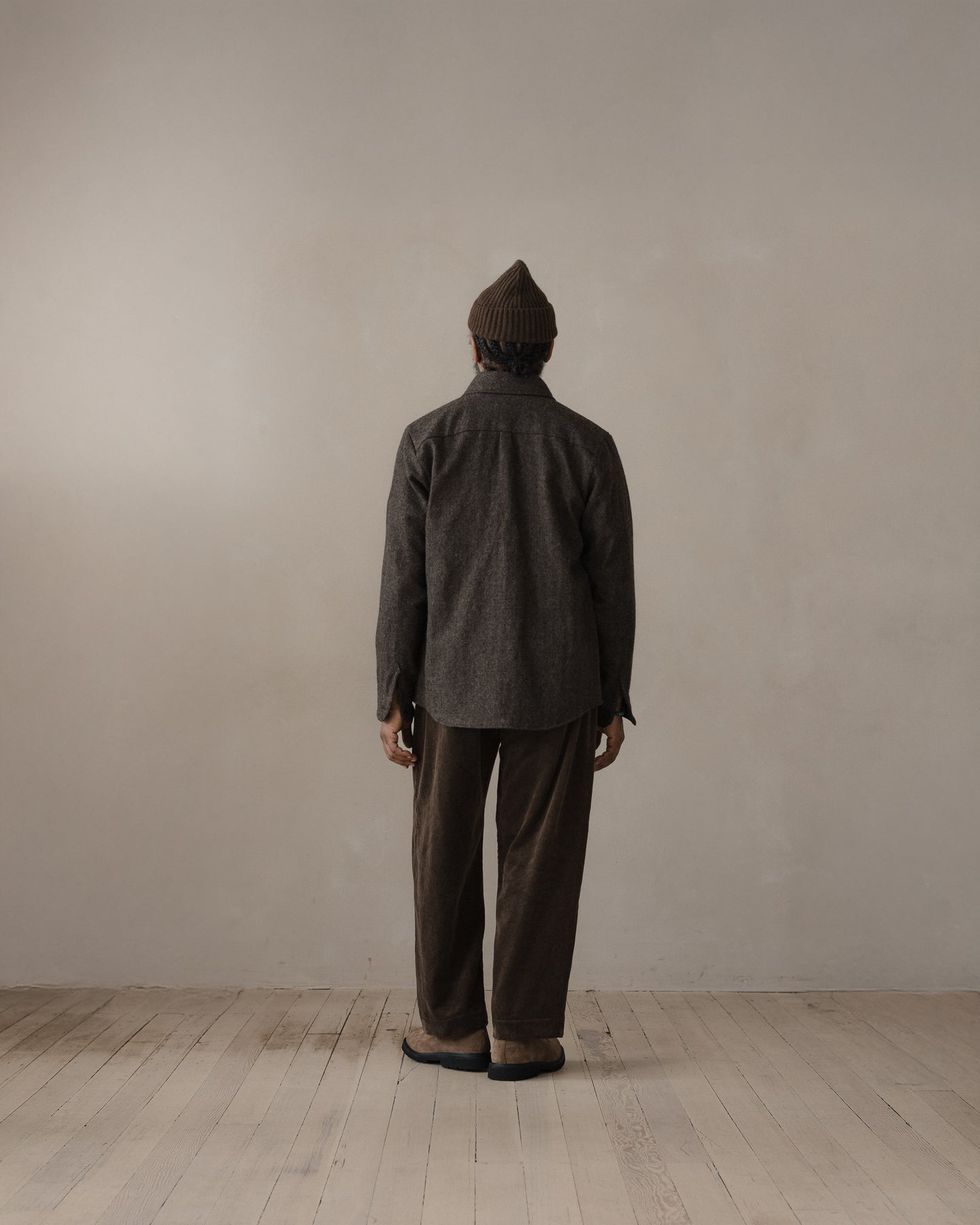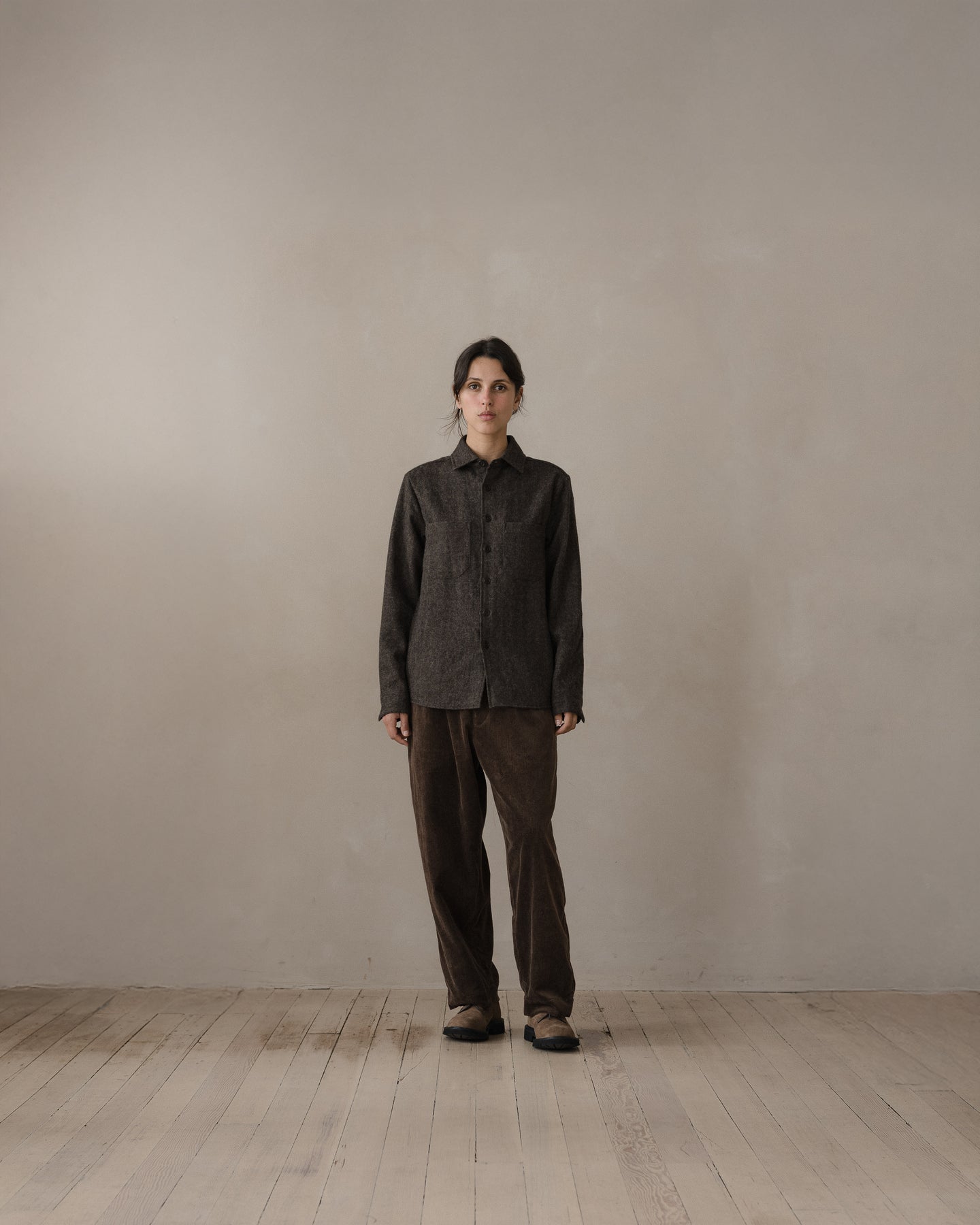 Bringing together two shades of undyed organic wool sourced from Uruguay, this subtle herringbone pattern blends natural shades of brown and charcoal. The yarn was spun in Yamagata and woven in Ichinomiya, Japan. The cloth was washed and tumbled in the finishing to impart a softer, raised texture along with a lofty and dry hand.
